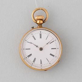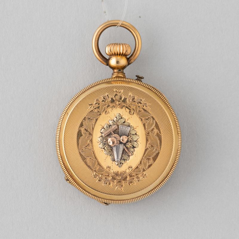 Cassa in oro 18 k, 1880/1890,quadrante in smalto bianco, movimento con scappamento a cilindro, a carica remontoir