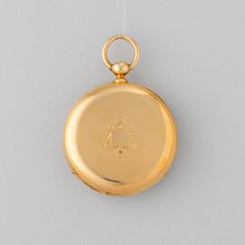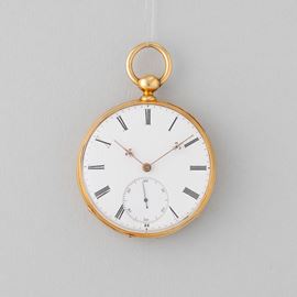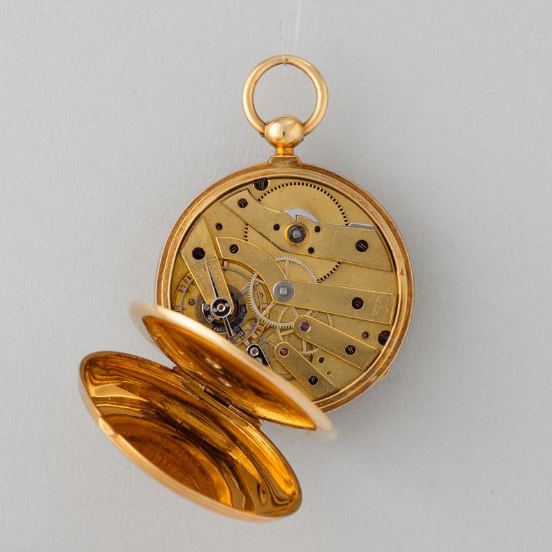 Cassa in oro 18 k con marchio inciso sulla couvette, carica a chiavetta, 1850/1860, scappamento con movimento ad ancora e bilanciere compensato, quadrante in smalto bianco con scatola e certificato d’origine