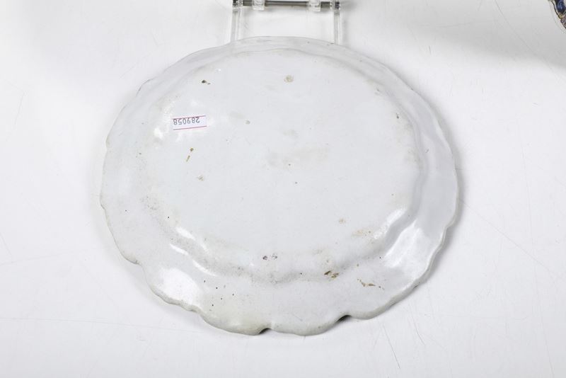 Maiolica policroma a gran fuoco. Marca: assente. Diametro cm 23 circa; cm 35x30,7. Conservazione: piatto ovale in ottimo stato; i piatti rotondi con restauri