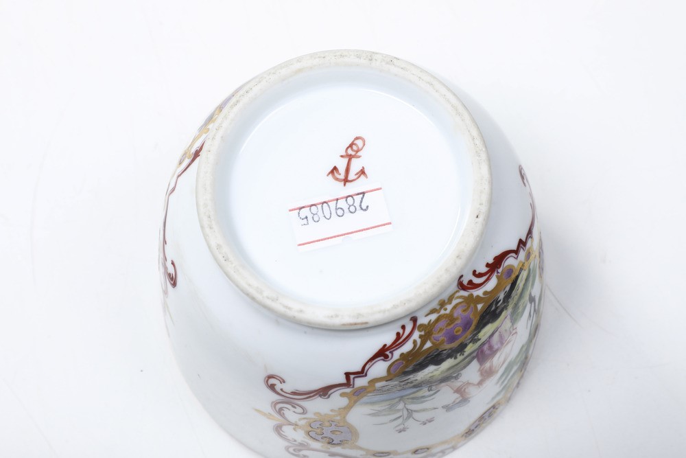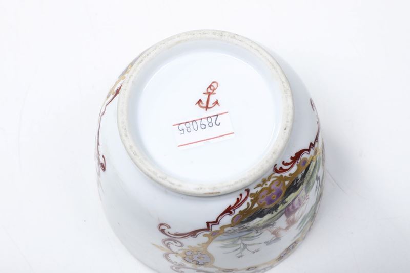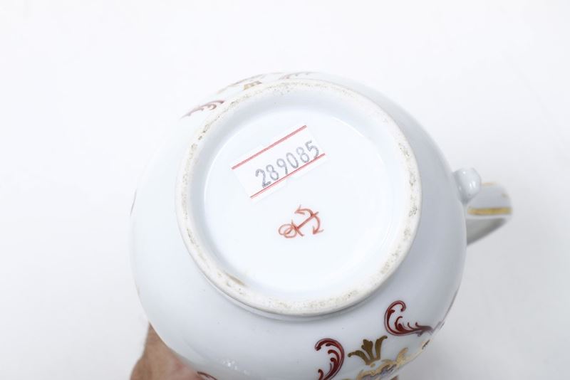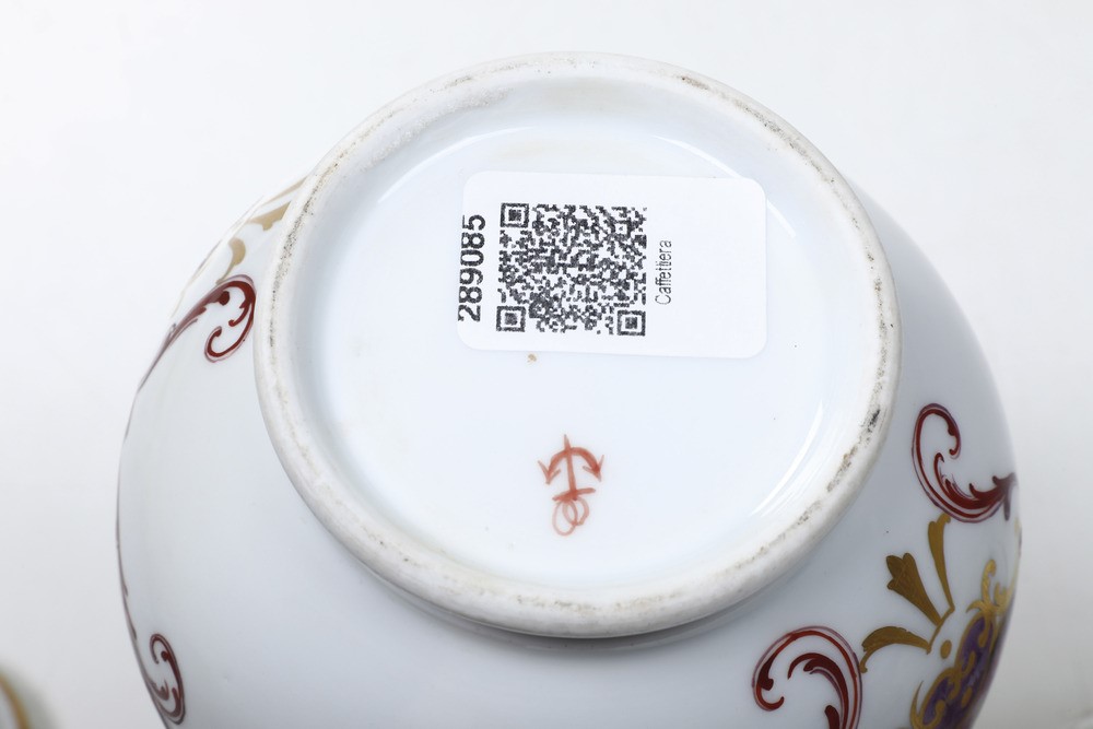 Porcellana in policromia e oro. Marca: ancora in rosso. Altezza: cm 23,3; cm 16,3; cm 7,4. Conservazione: buona; zuccheriera mancante del coperchio; piccolo restauro al bordo della caffettiera piccola; restauro al beccuccio della caffettiera grande.
