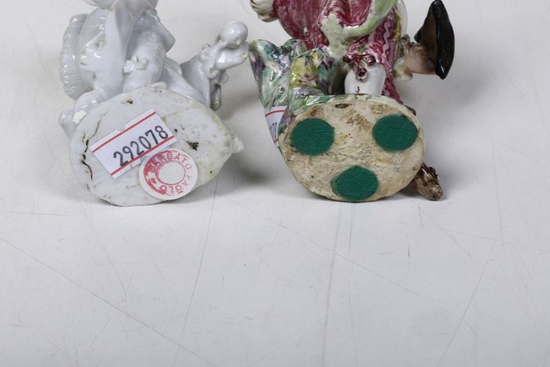 Porcellana bianca e maiolica policroma.Marca: assente. Altezze cm 10,6; cm 9,6. Conservazione: figurina in porcellana con punta del piede sinistro restaurata; quella in maiolica in ottimo stato