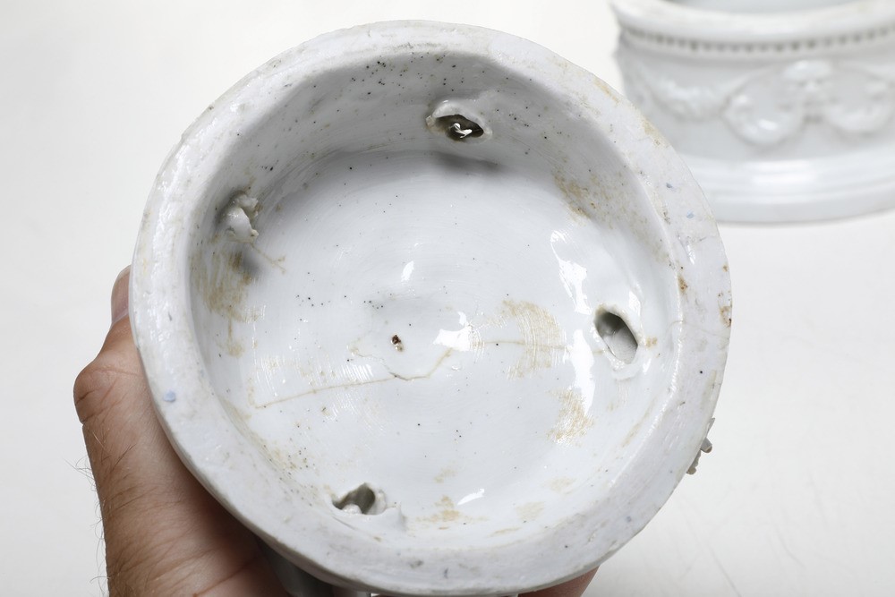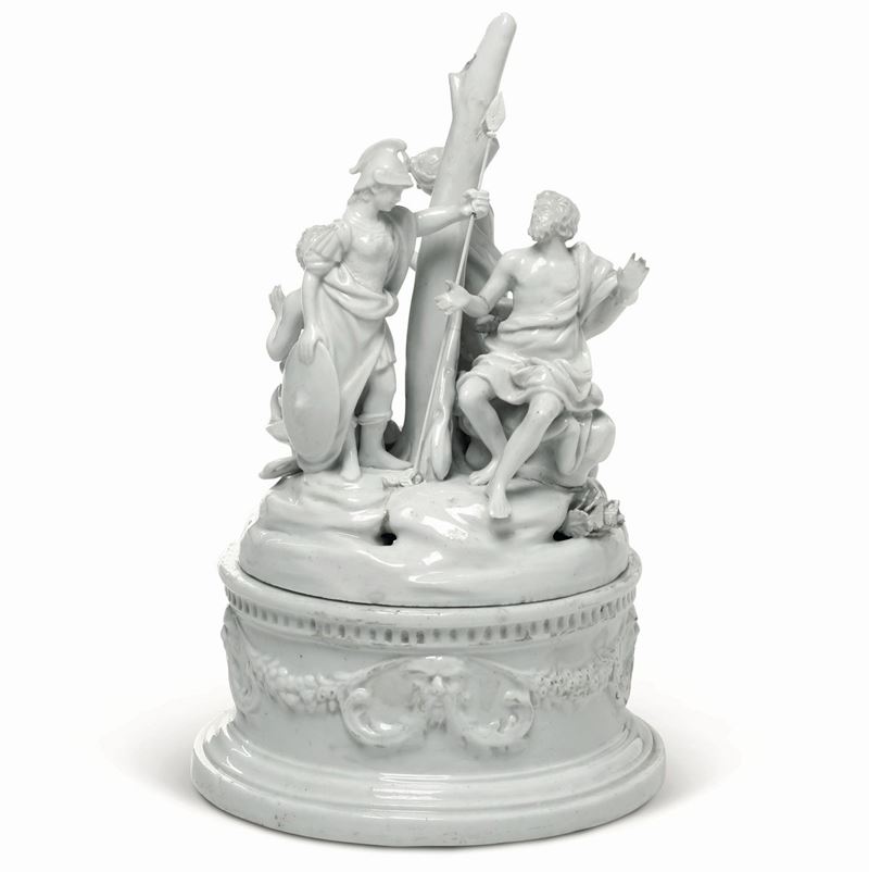 Porcellana bianca. Marca: assente. Altezza totale cm 22,8. Altezza gruppo cm 16,2. Conservazione: restauri al braccio e alla lancia di Minerva; mancanze minori