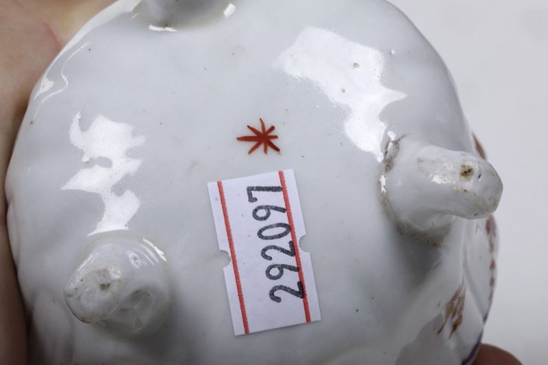 Porcellana. Marca assente. Altezza totale cm 9,4. Conservazione: coperchio rotto in 4 frammenti e ricomposto