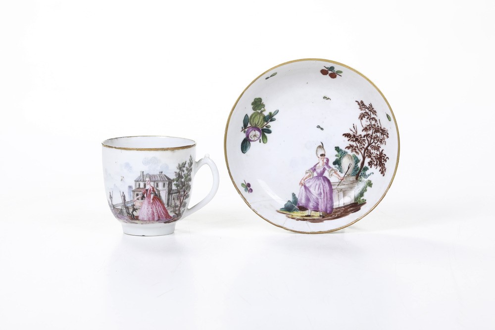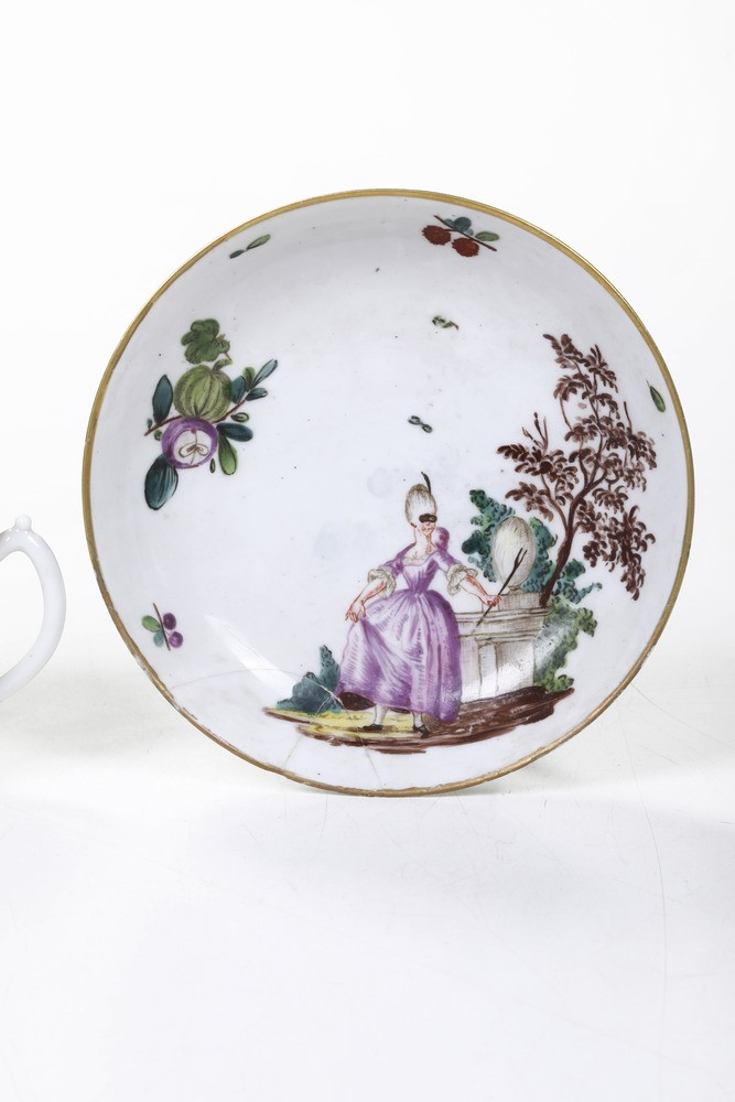 Tazza e piattino sono dipinti in policromia con una dama in un parco con architetture, inoltre piccoli ramoscelli fioriti e con fruttini. La dama del piattino porta una mascherina ed accenna ad un passo di danza. I bordi sono listati in oro