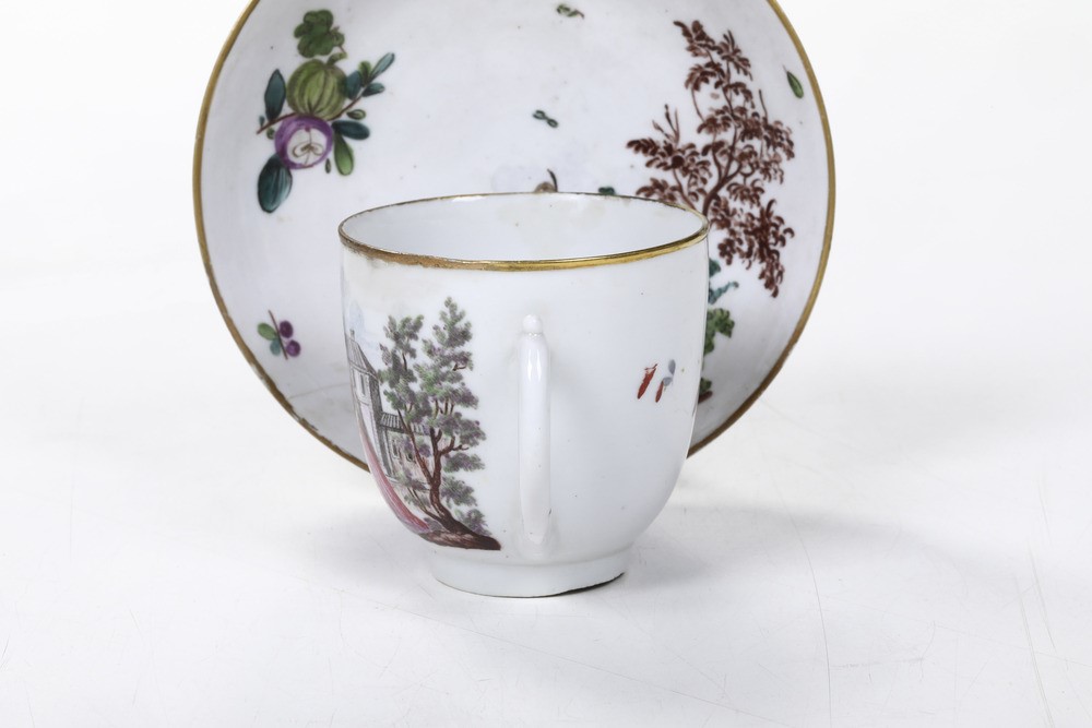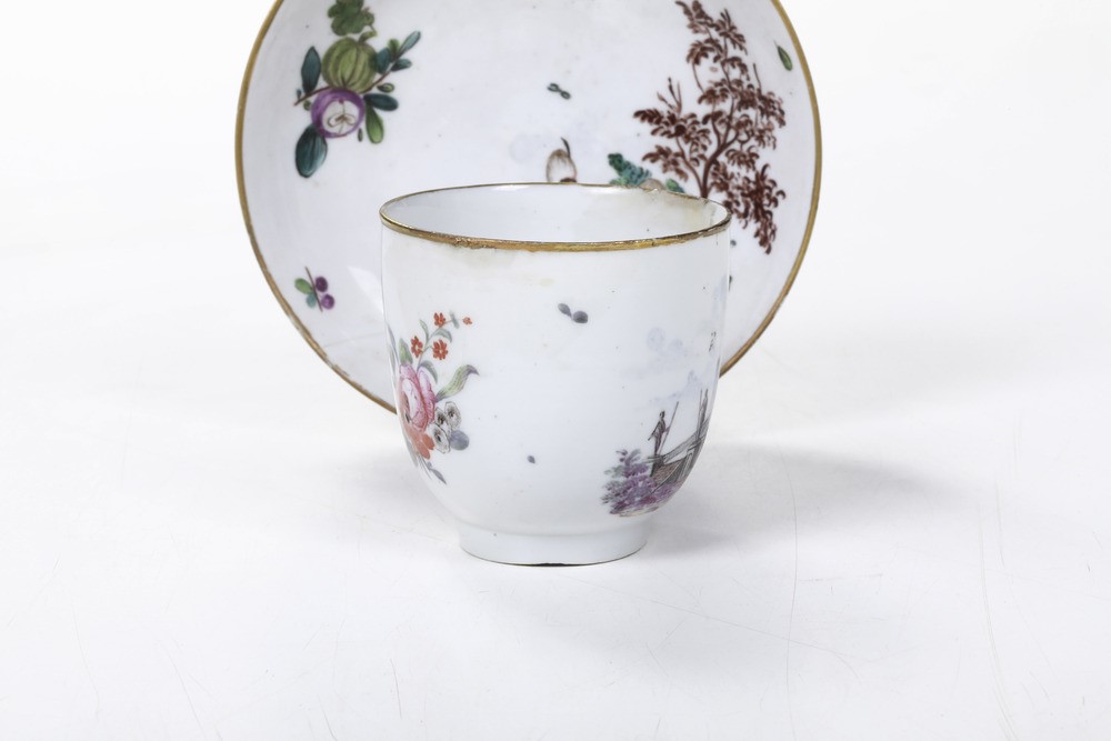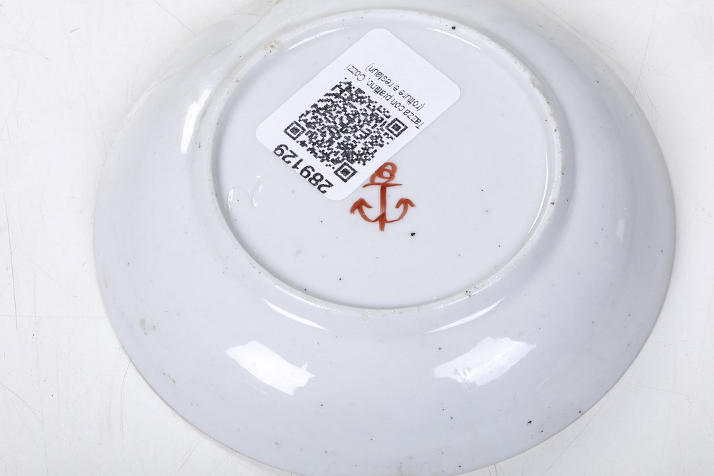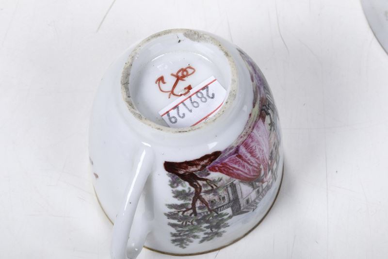 Porcellana. Marca: ancora in rosso. Dimensioni: altezza tazza cm 6,3; diametro piattino cm 12,3. Conservazione: restauri al bordo superiore della tazza; piattino con rottura incollata tra le ore 6 e le ore 8; piccole sbeccature