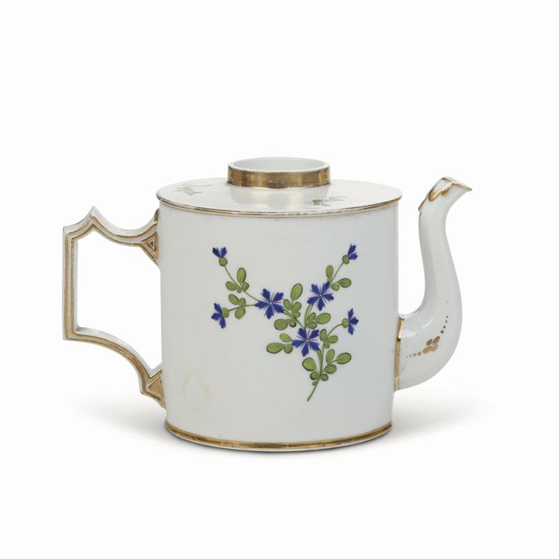 La teiera cilindrica, dal caratteristico manico mistilineo, è decorata a rametti di fiordalisi molto in voga all’epoca in particolare sulle porcellane francesi e usato spesso a Vinovo