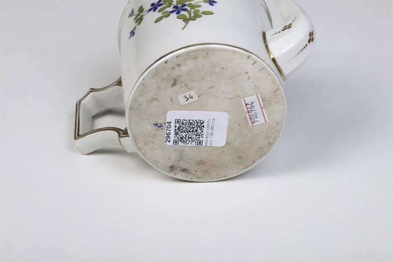 Porcellana. Marca: lettera “V” sormontata da “+” in blu. Altezza cm 11,5. Conservazione: ottima; piccolo salto di smalto accanto all’attacco superiore del manico; insignificanti sbeccature all’orlo del beccuccio; coperchio mancante