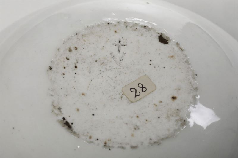 Porcellana. Marca: lettera “V” sormontata da “+” incisi. Dimensioni: altezza cm 16,1; diametro massimo cm 21. Conservazione: tre corna e sbeccature al bordo superiore restaurate