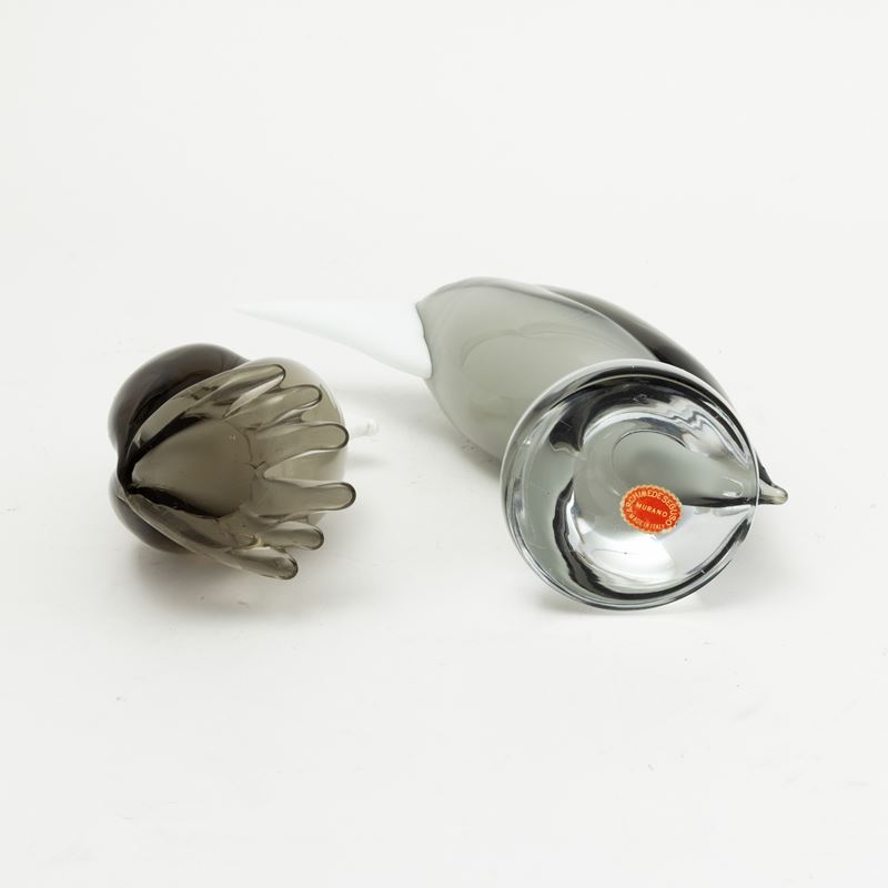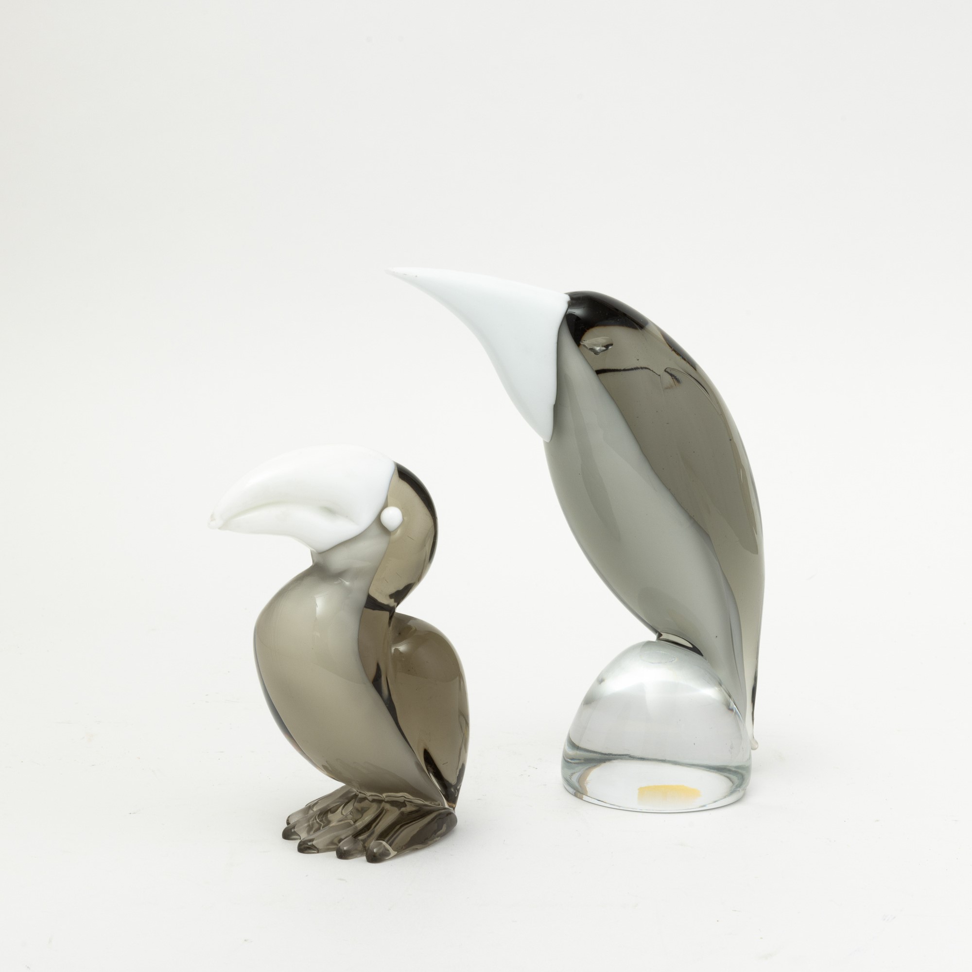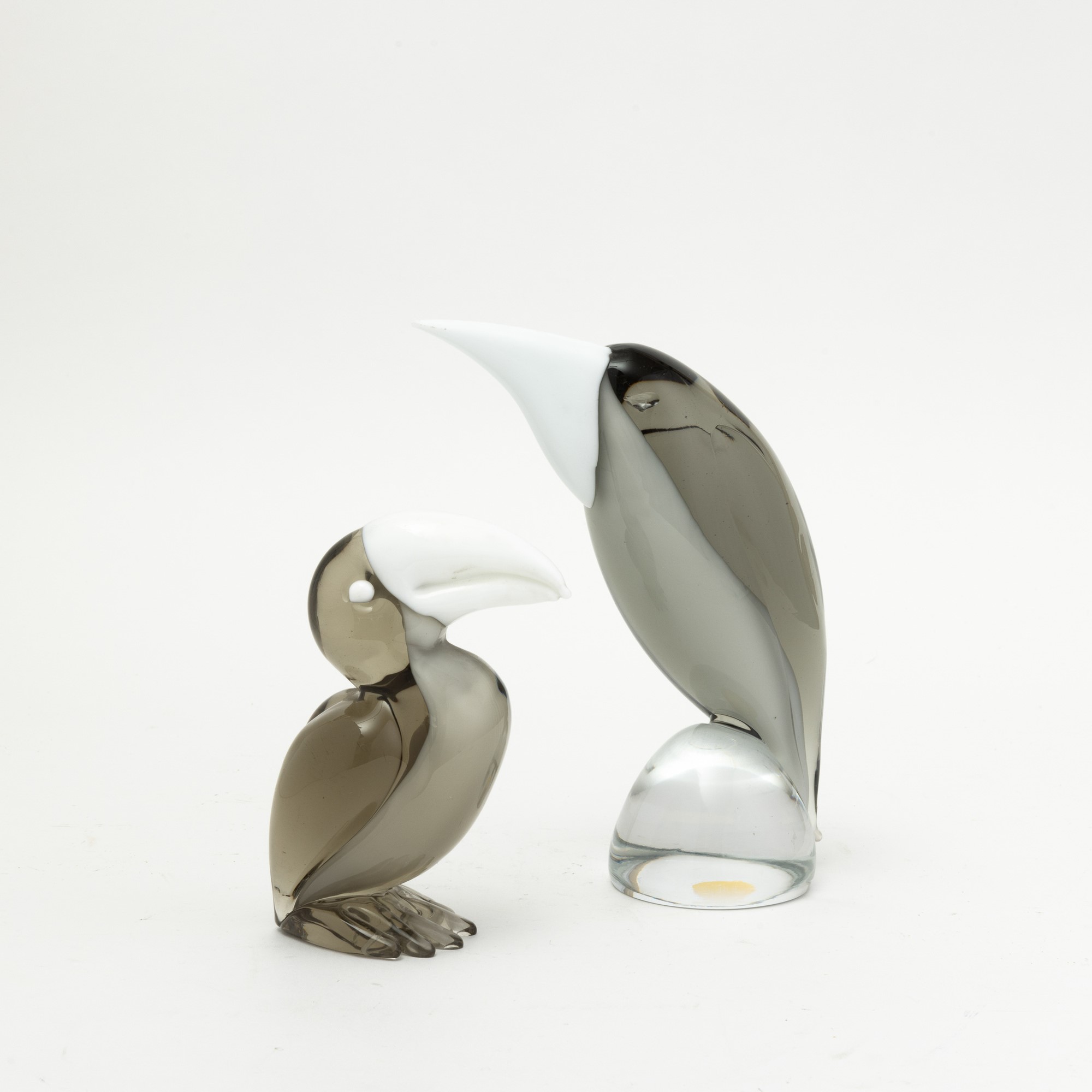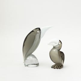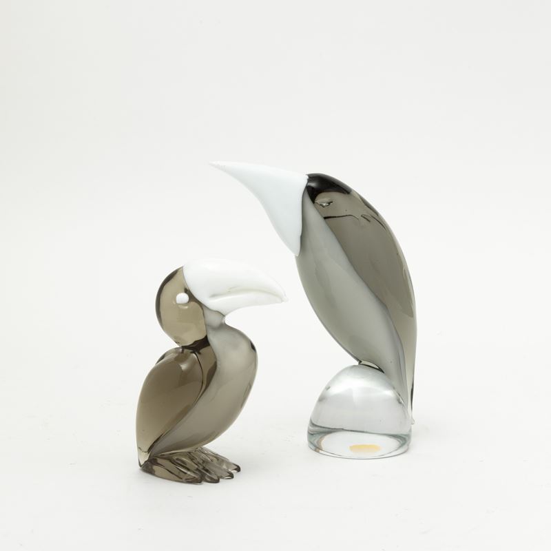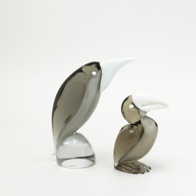 Two smoked and lattimo heavy glass toucans. Old label. Chipped parts