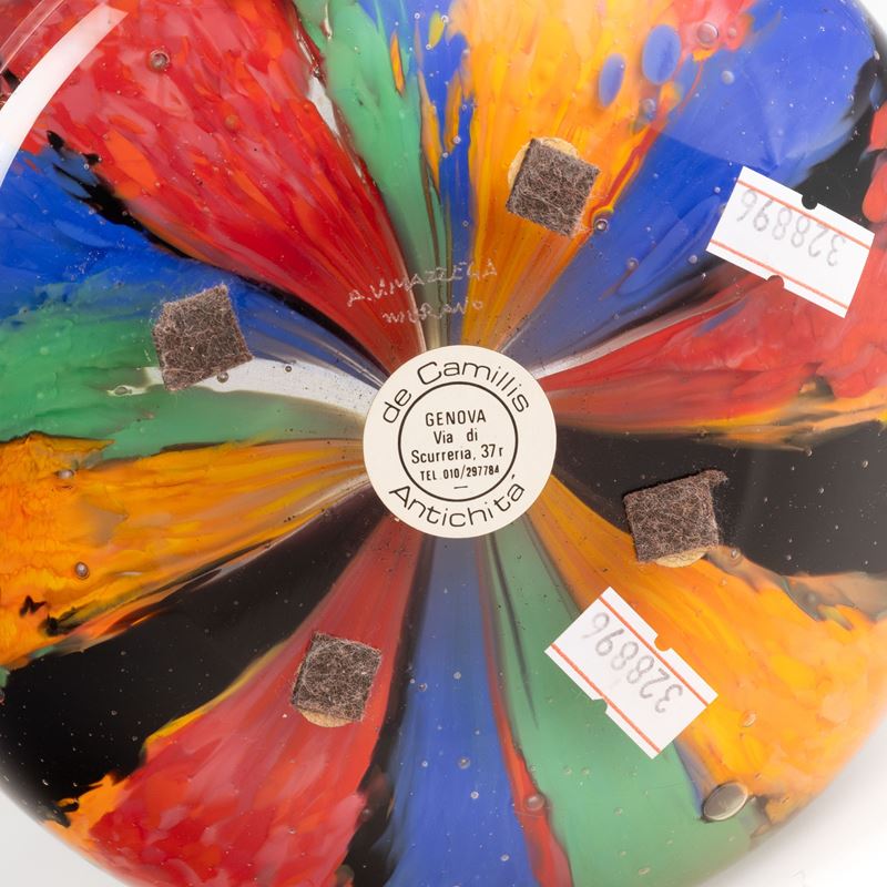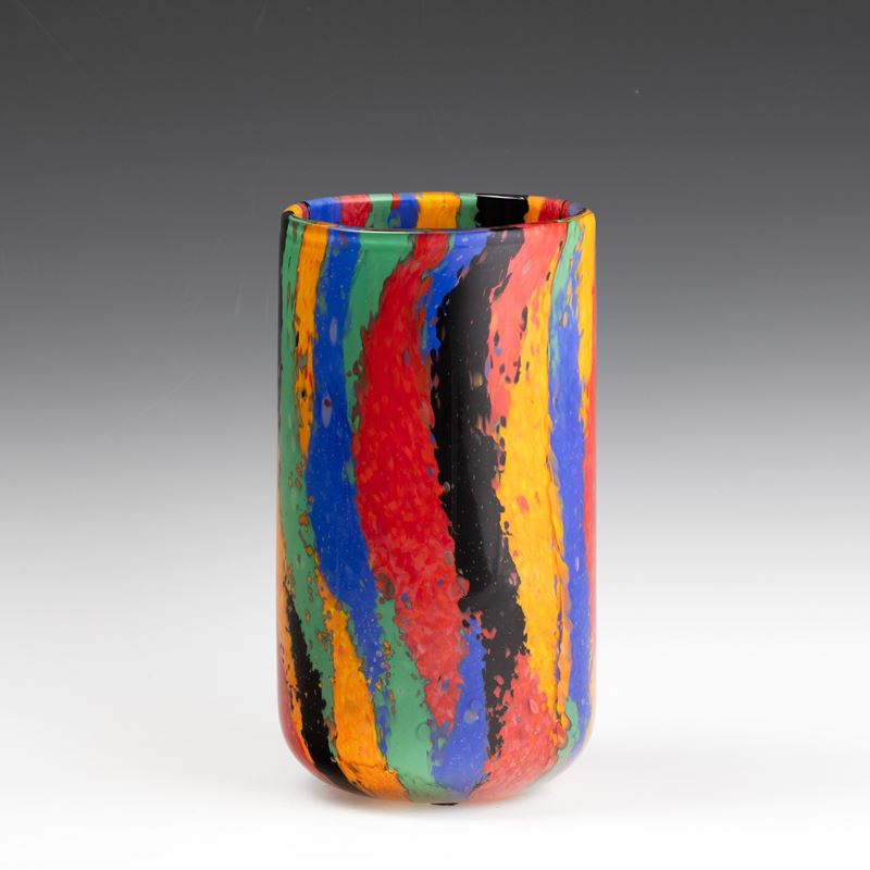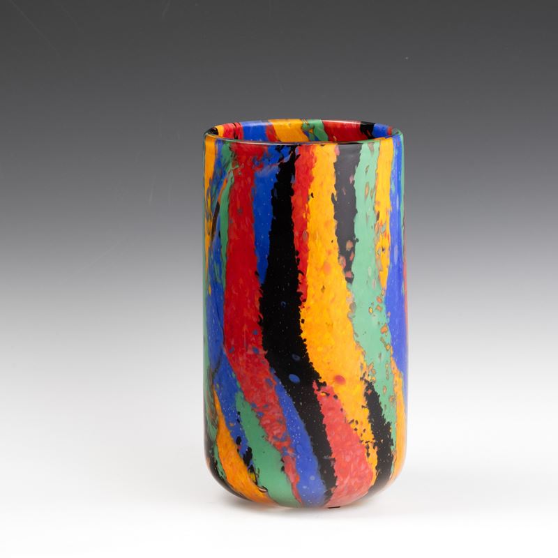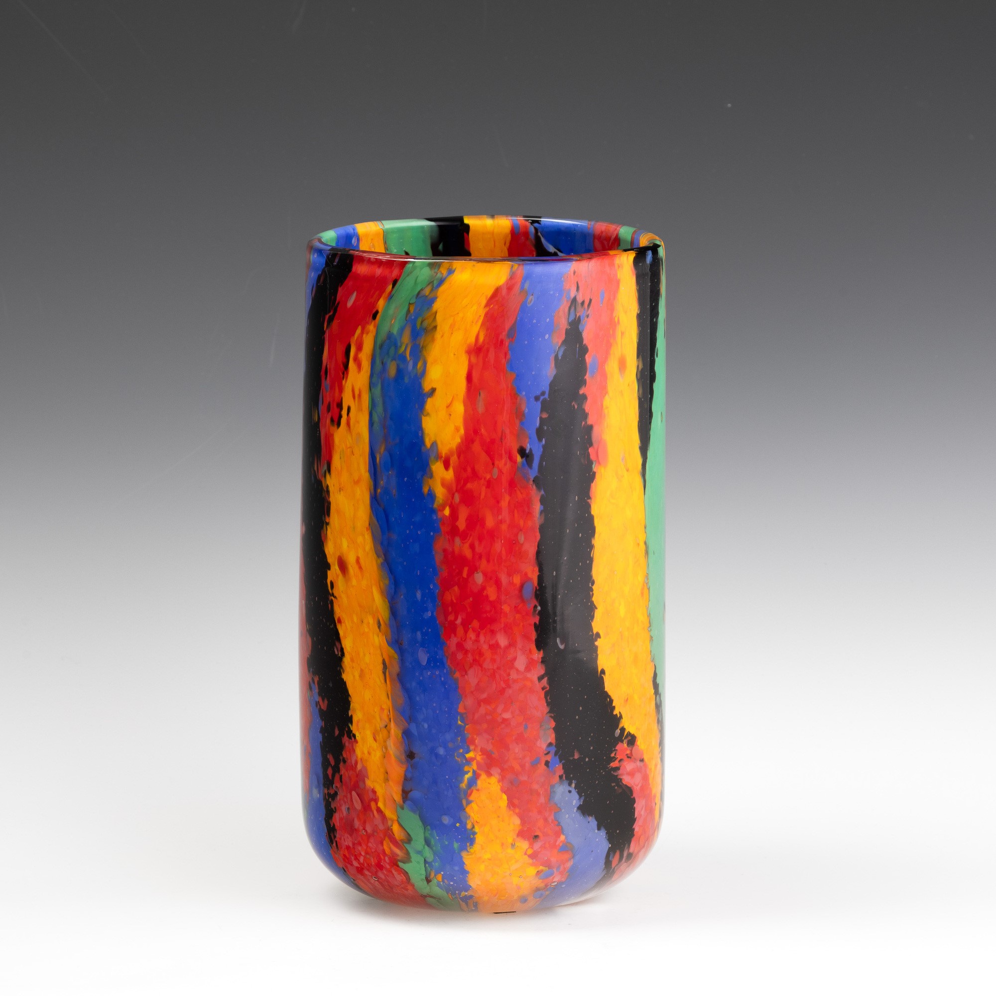 A blown glass cylinder vase with a polychrome powder decor. Etched signature AV Mazzega Murano and retailer's label