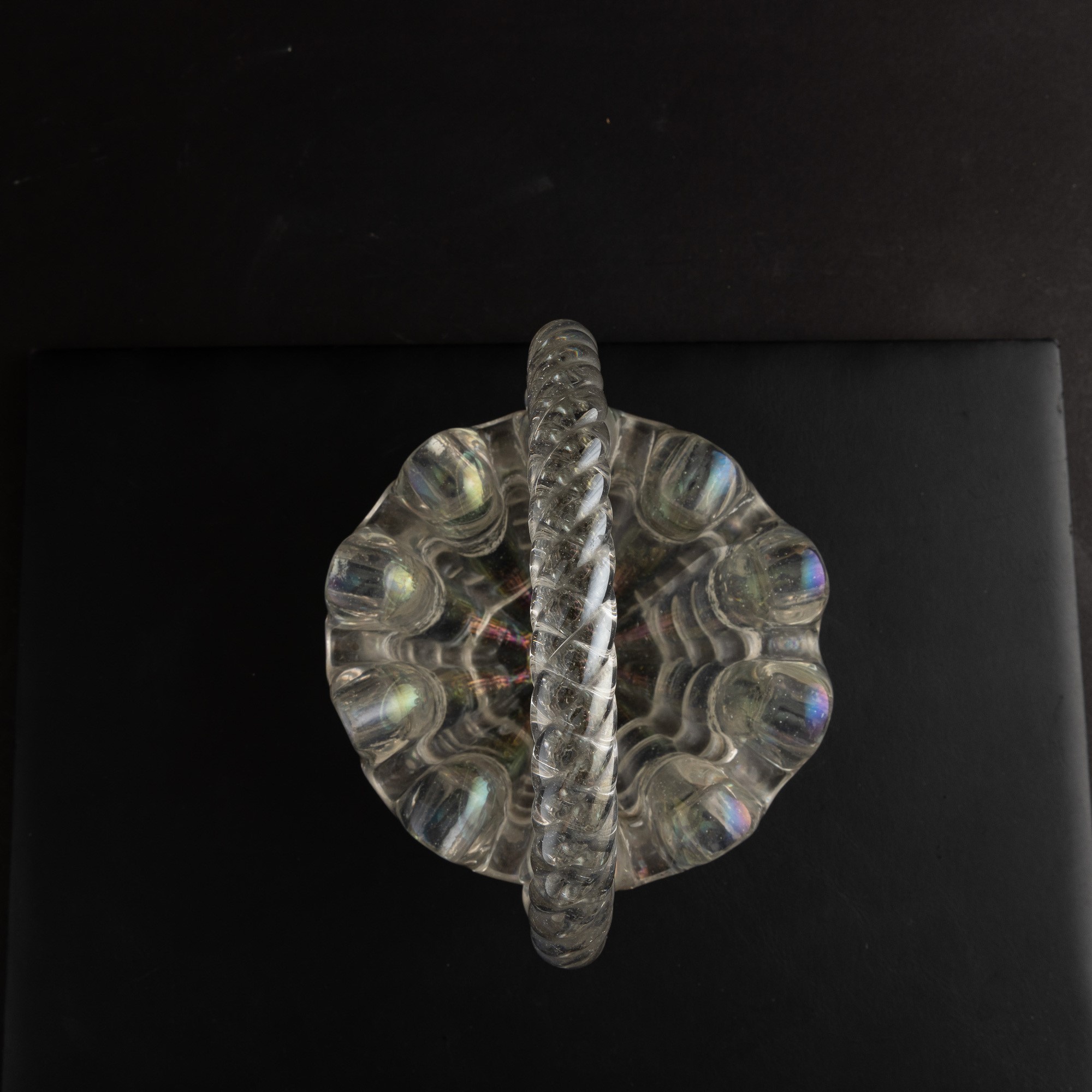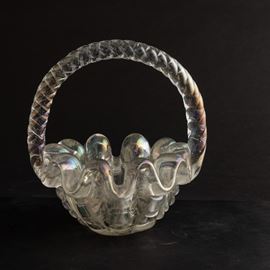 A ribbed iridescent blown glass vase. Cracked