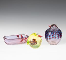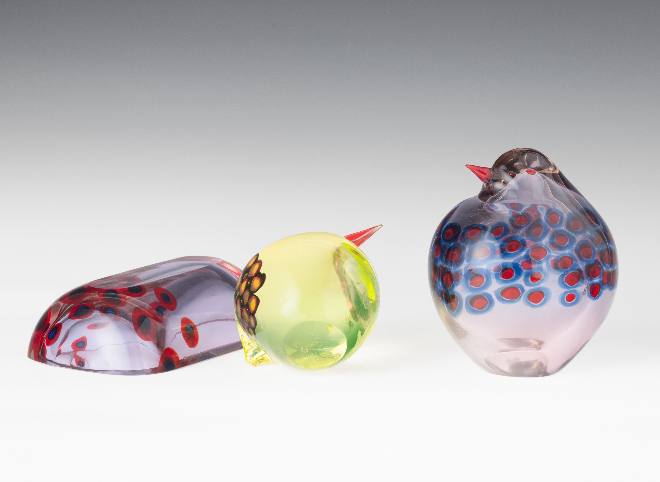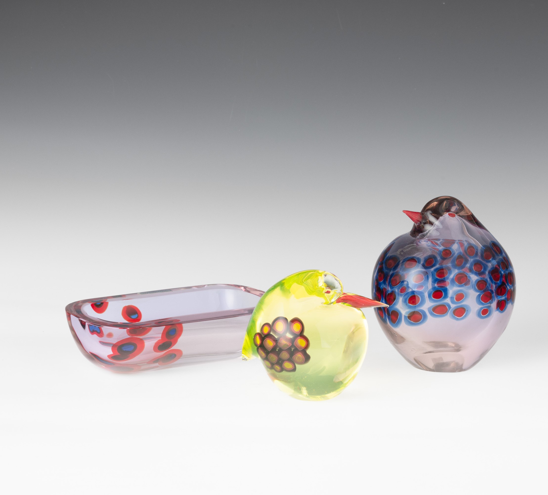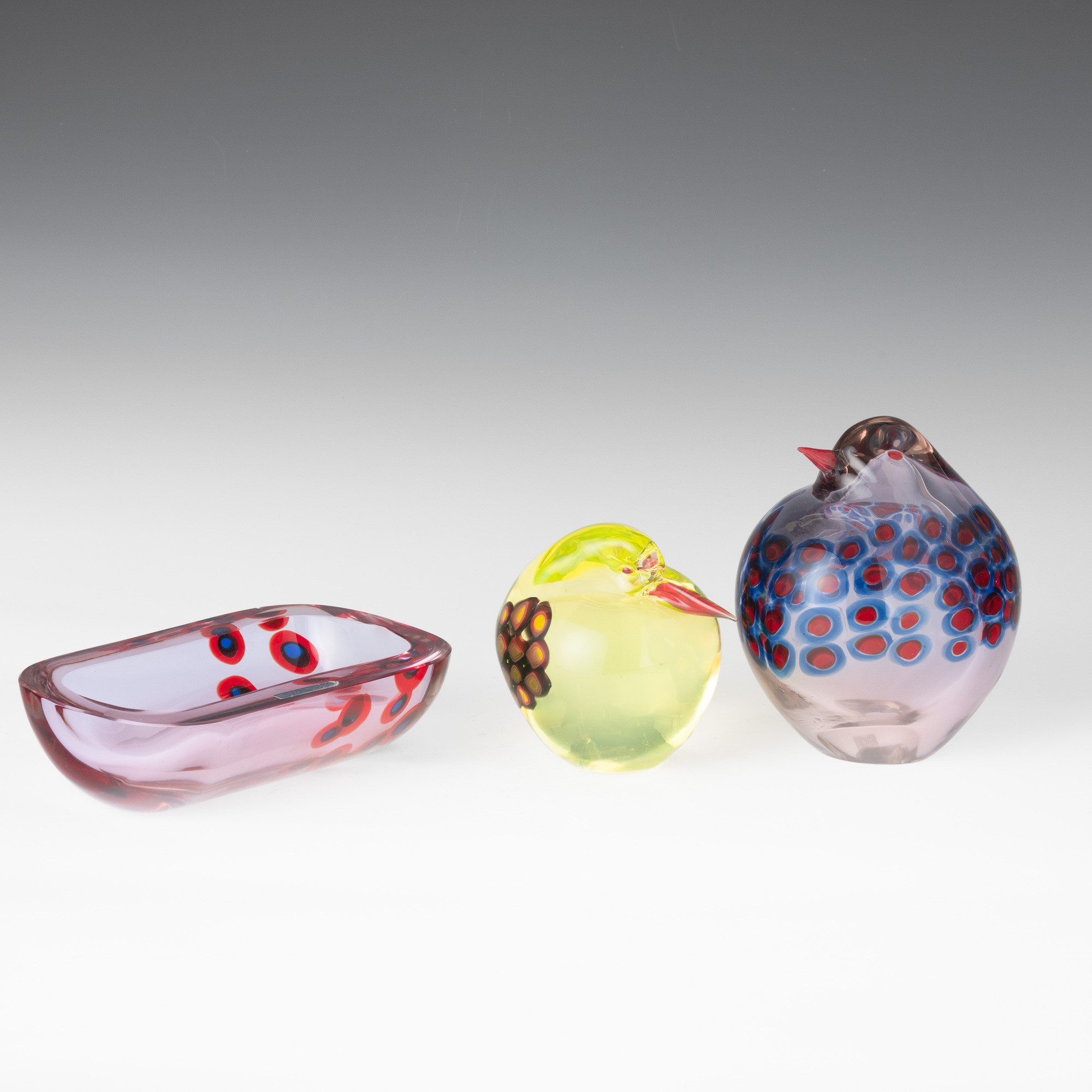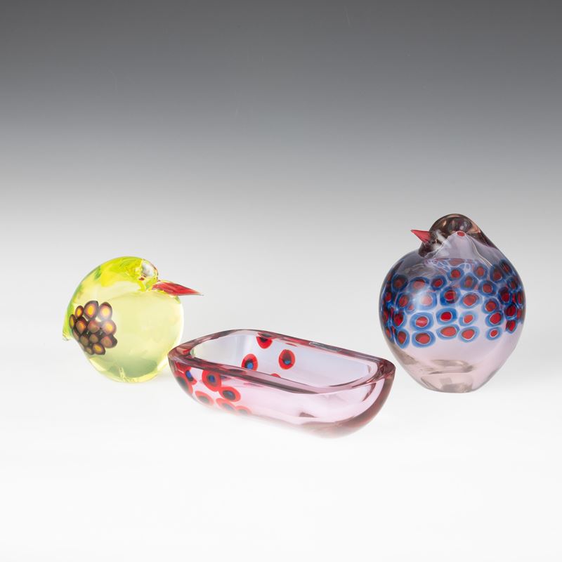 Two heavy glass bird-shaped ornaments and a bowl with a decor of murrine. Old label Murano Glass Made in Italy