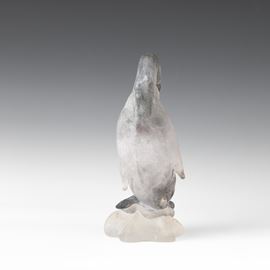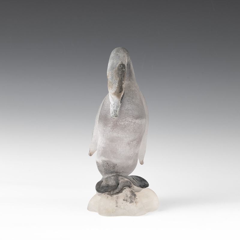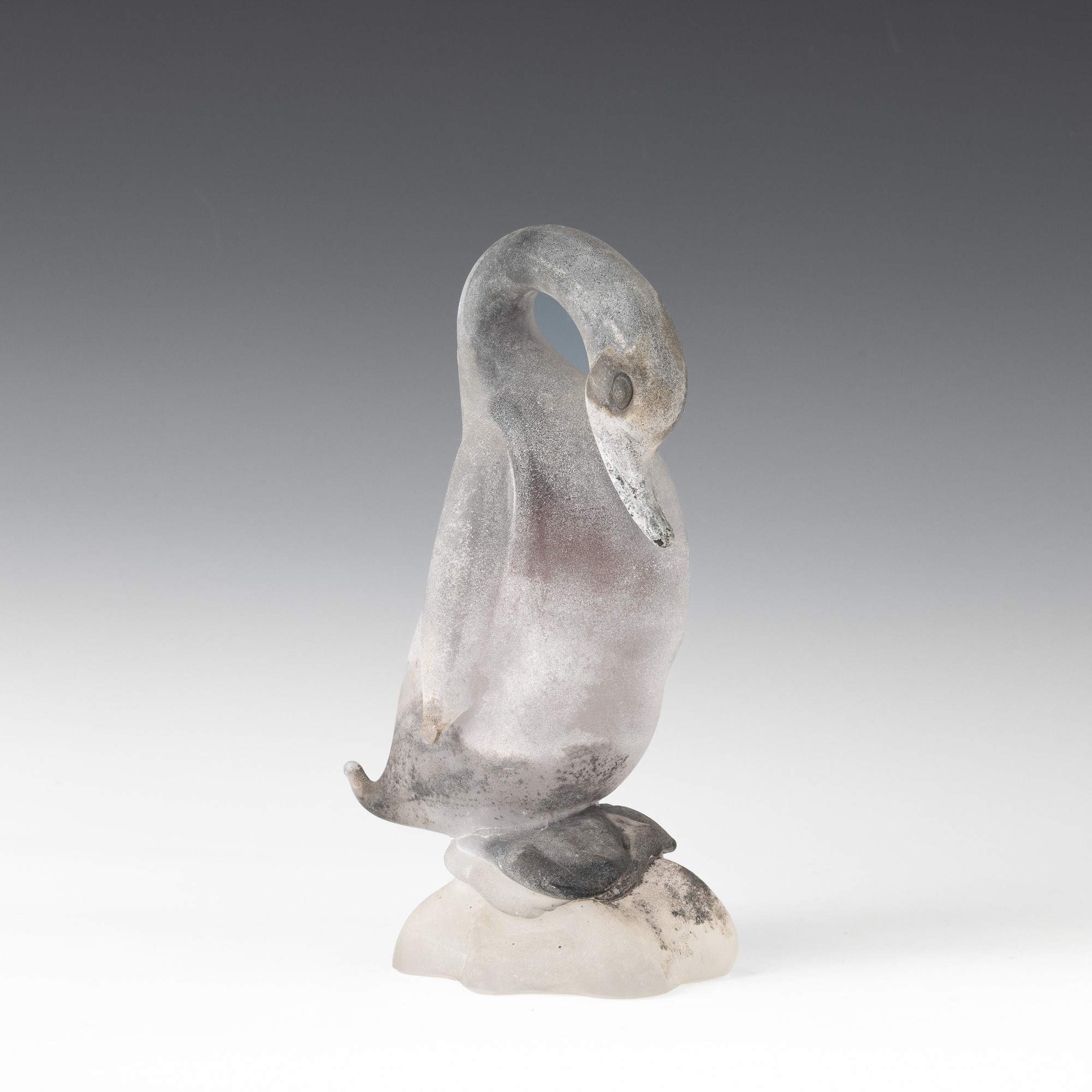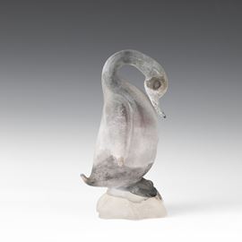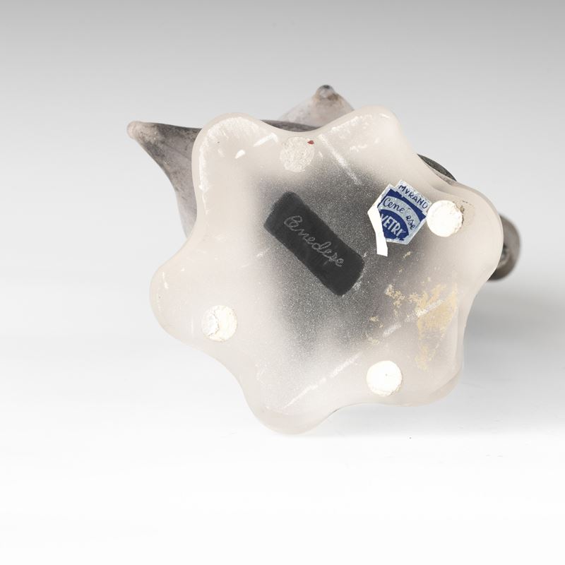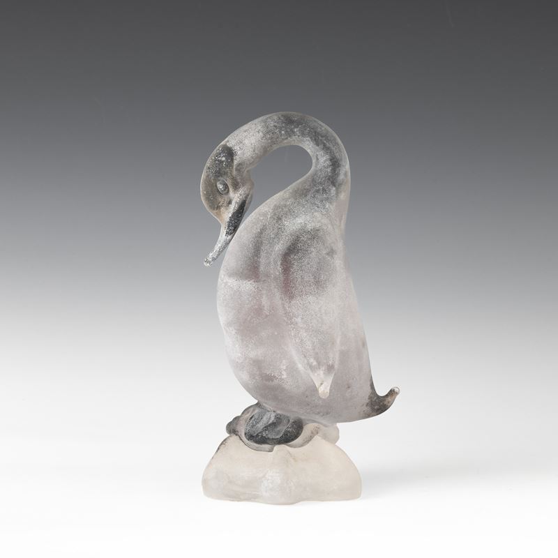 A heat-moulded glass duck with a scavo surface. Old label and engraved signature