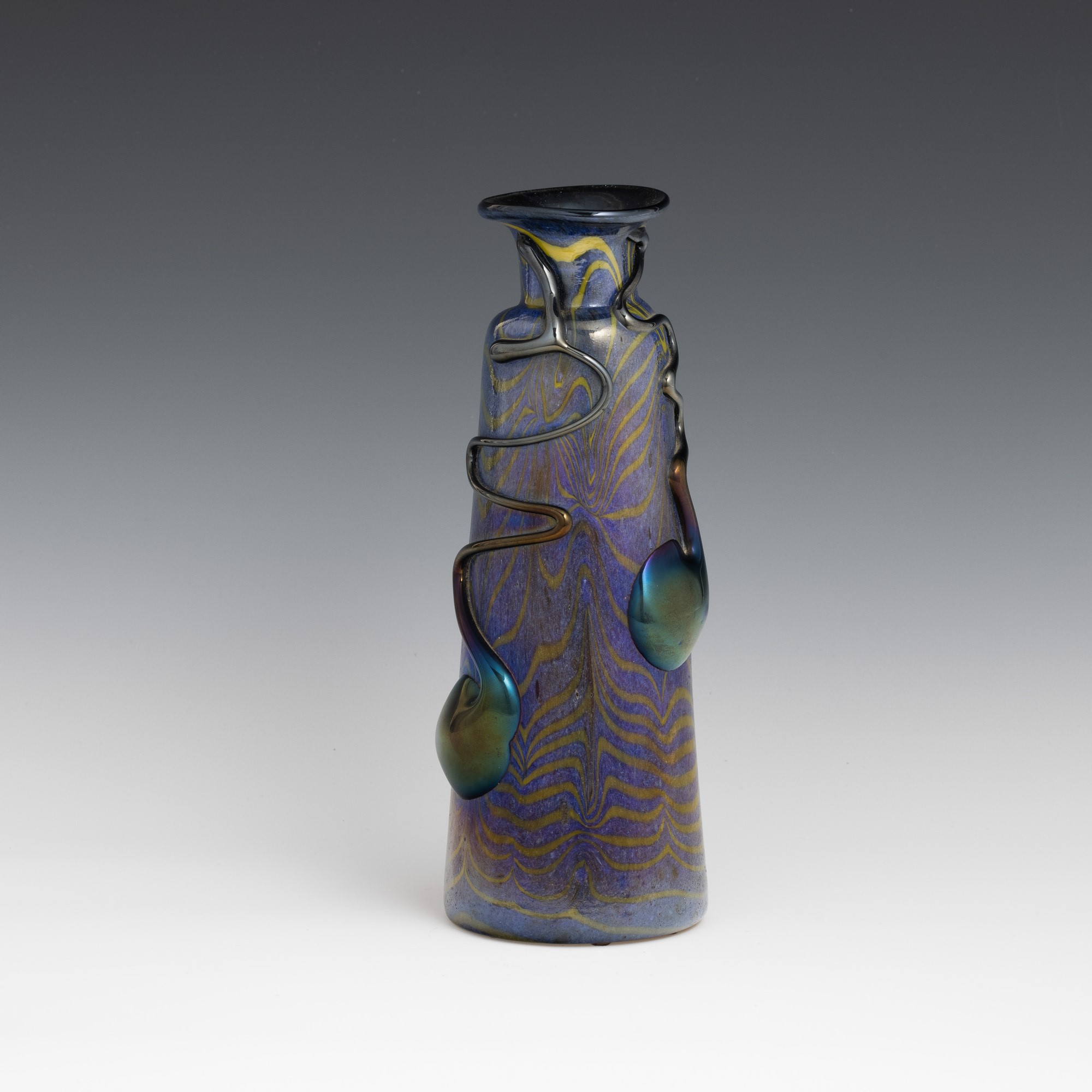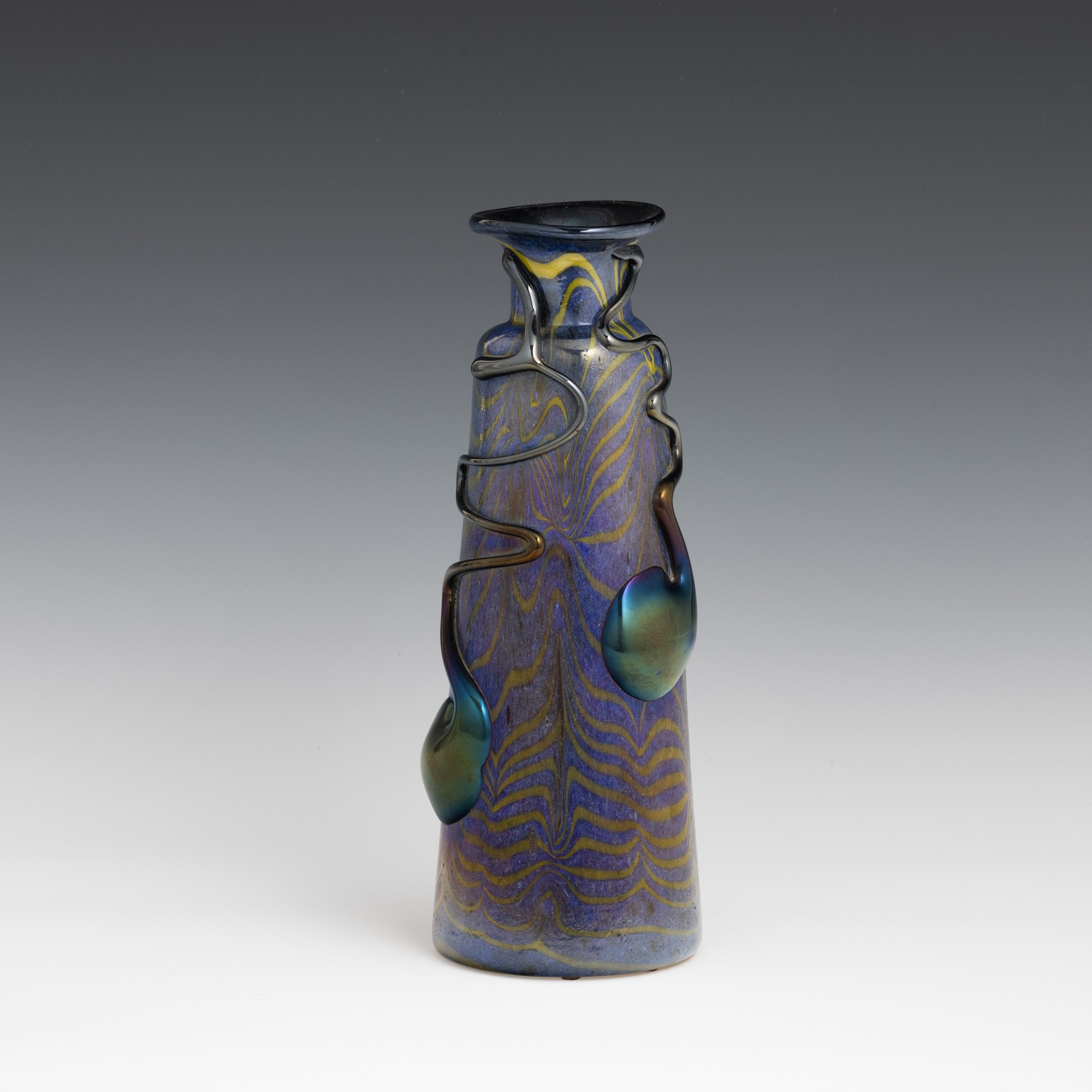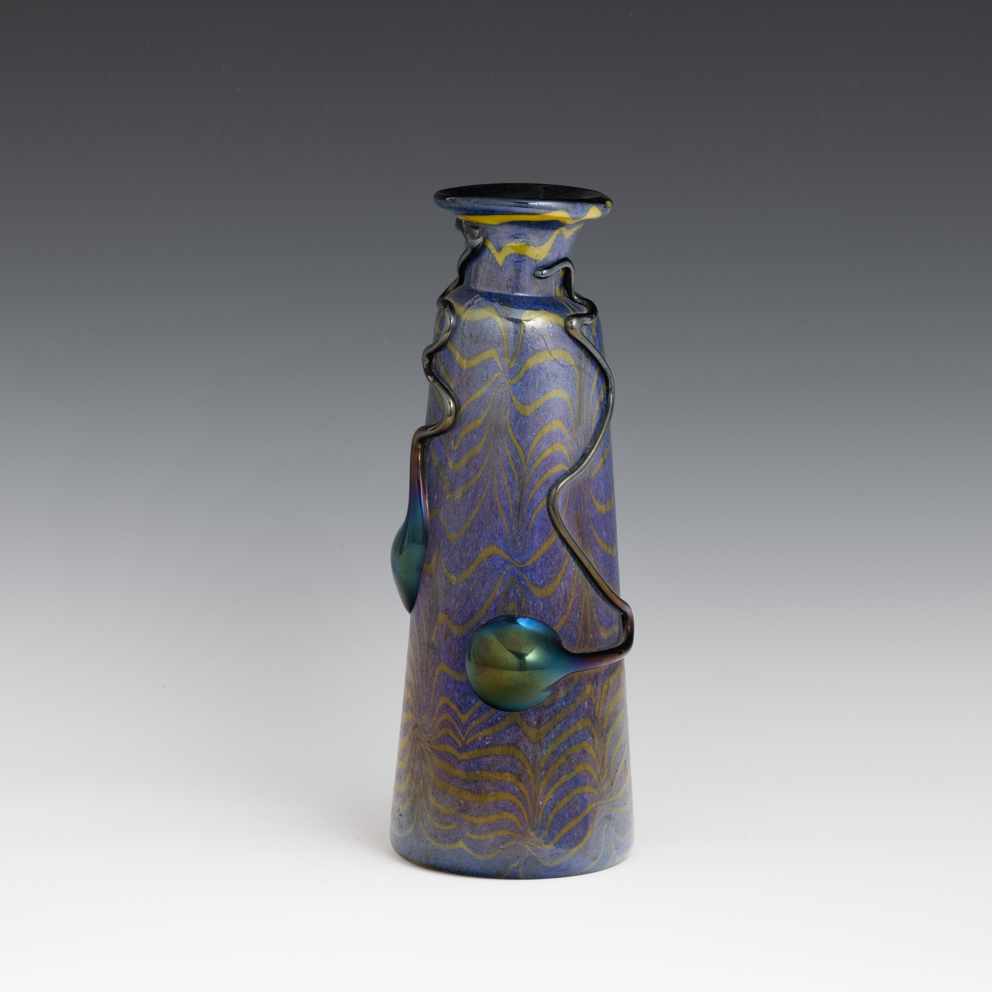 An iridised glass vase with a glass paste decor. Old retailer's label