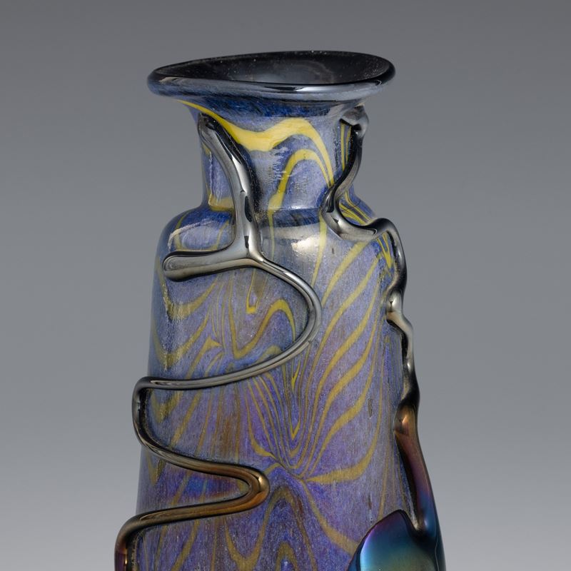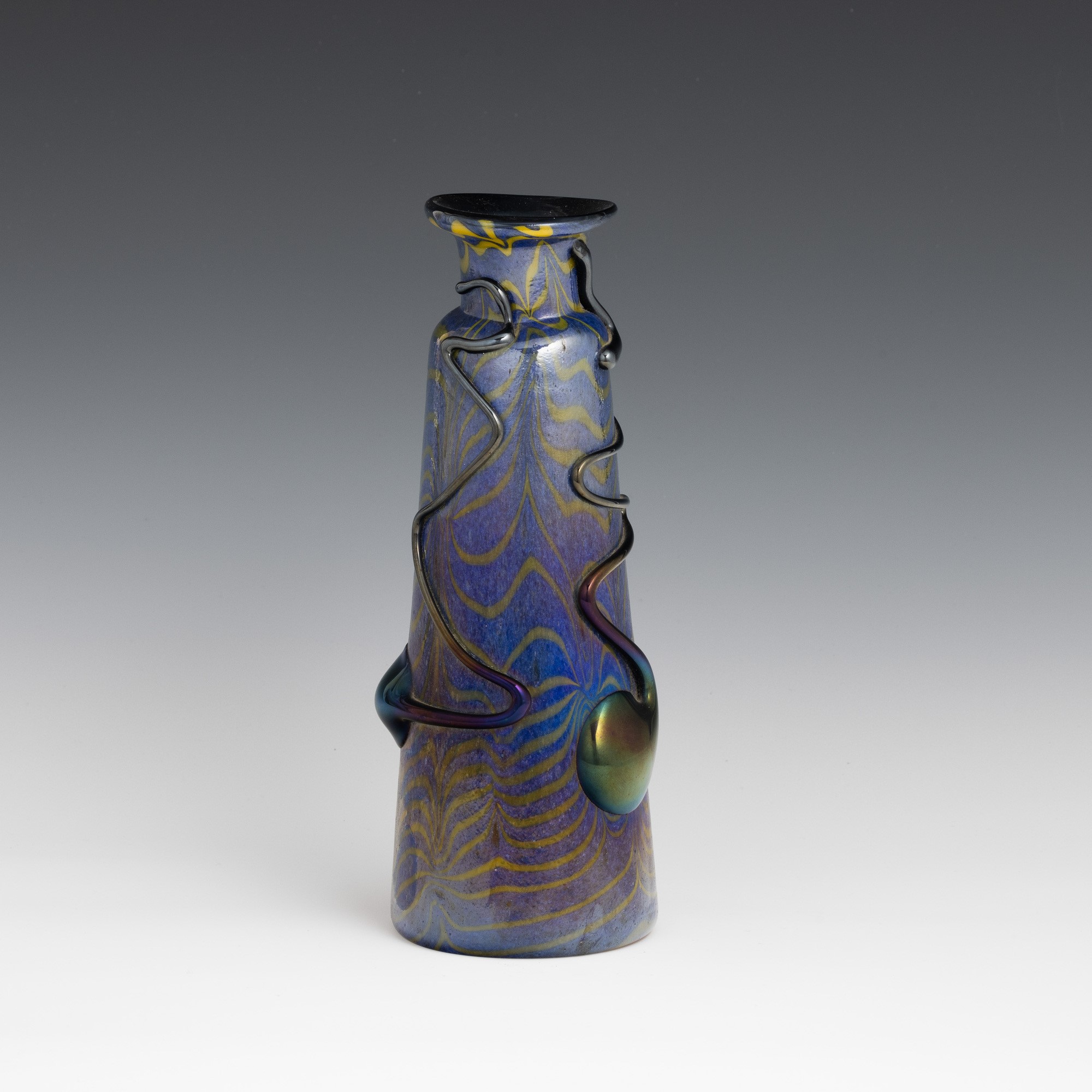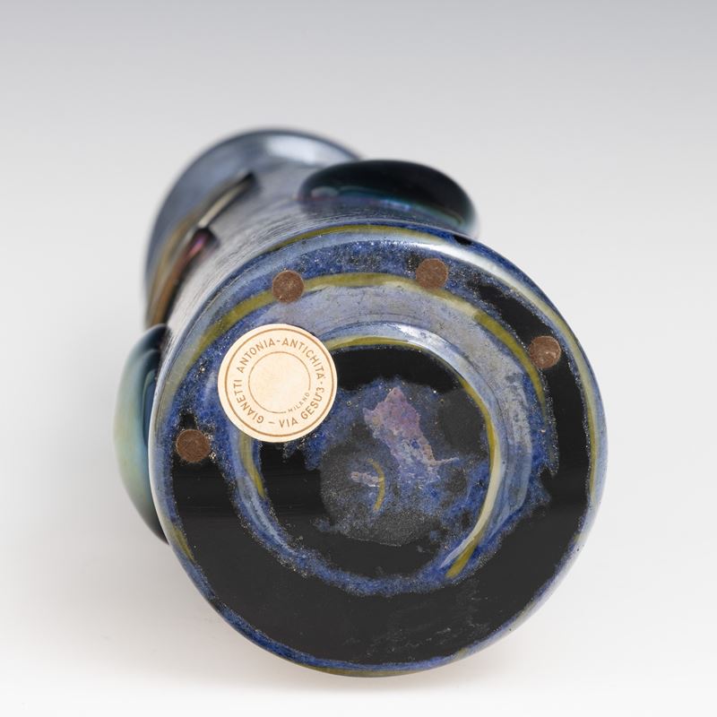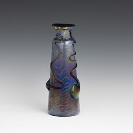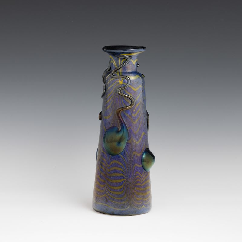 An iridised glass vase with a glass paste decor. Old retailer's label