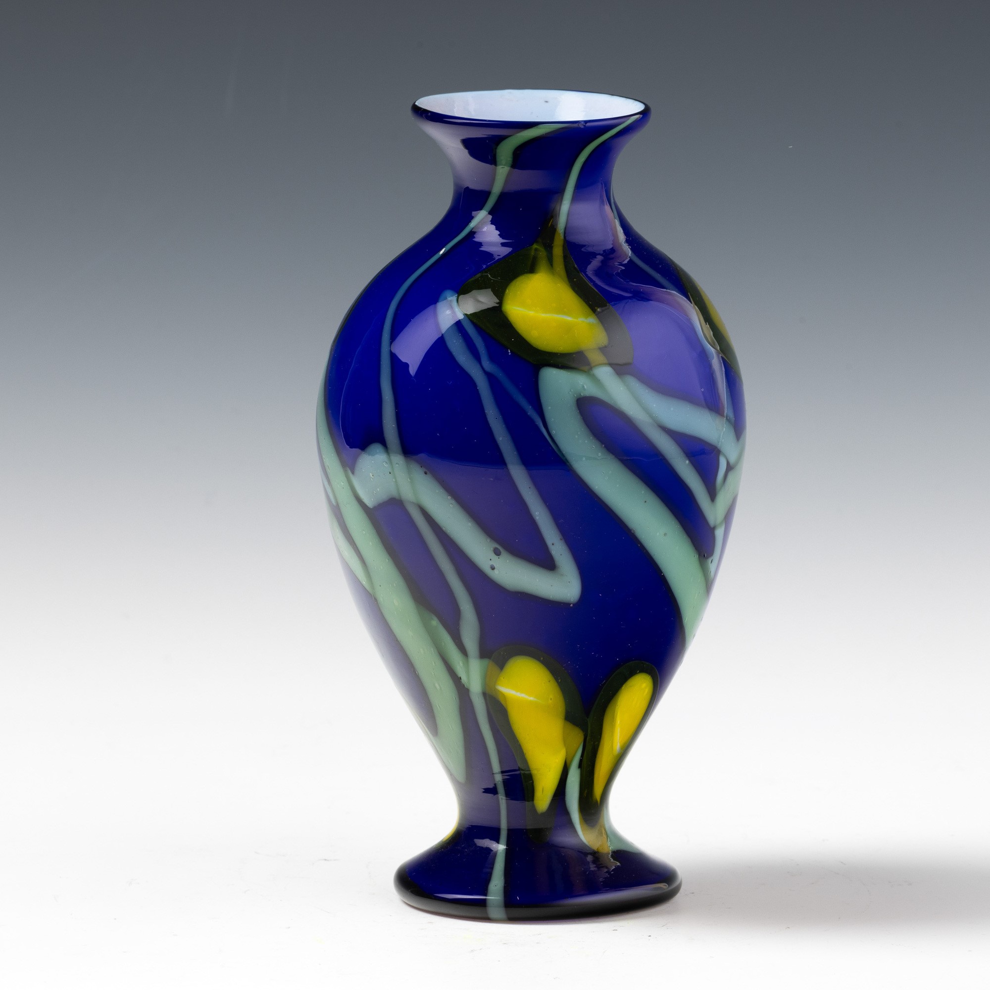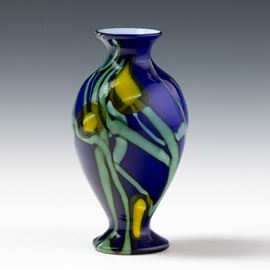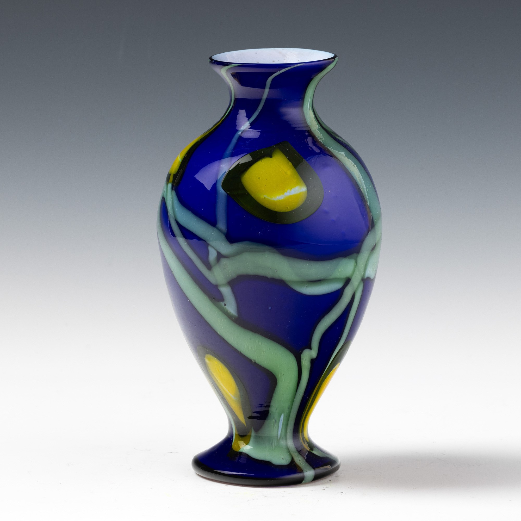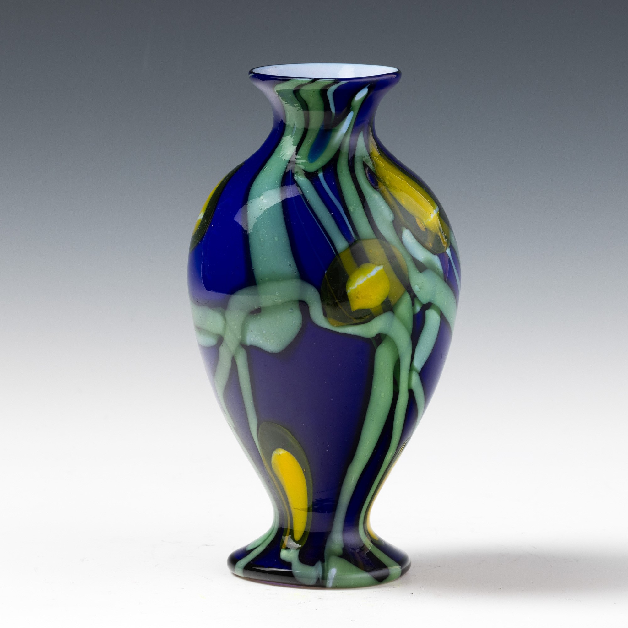 A blown glass vase with an abstract floral decor of murrine and polychrome canes
