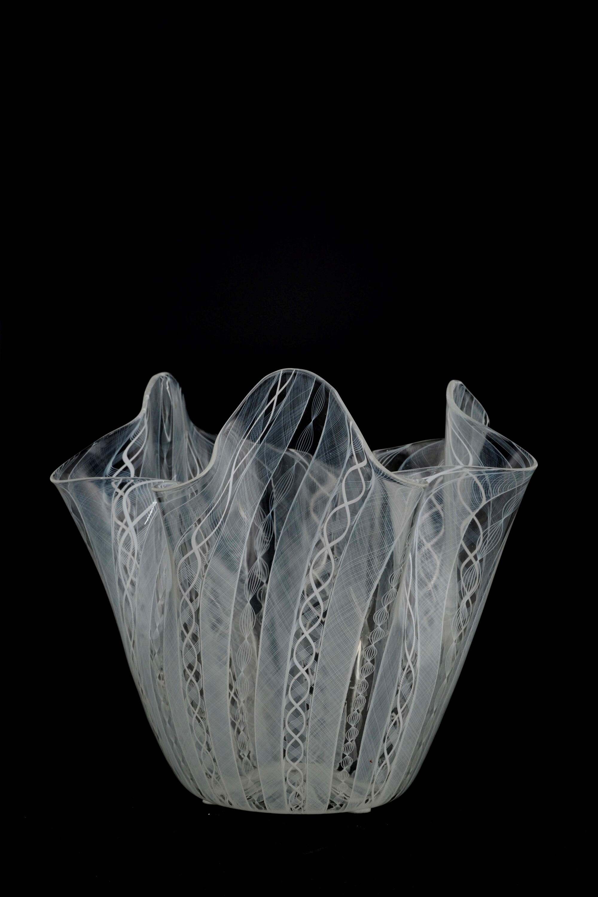 A large blown glass vase with a zanfirico, reticello and twisted cane decor.
