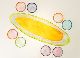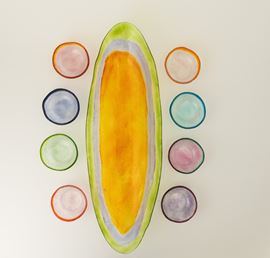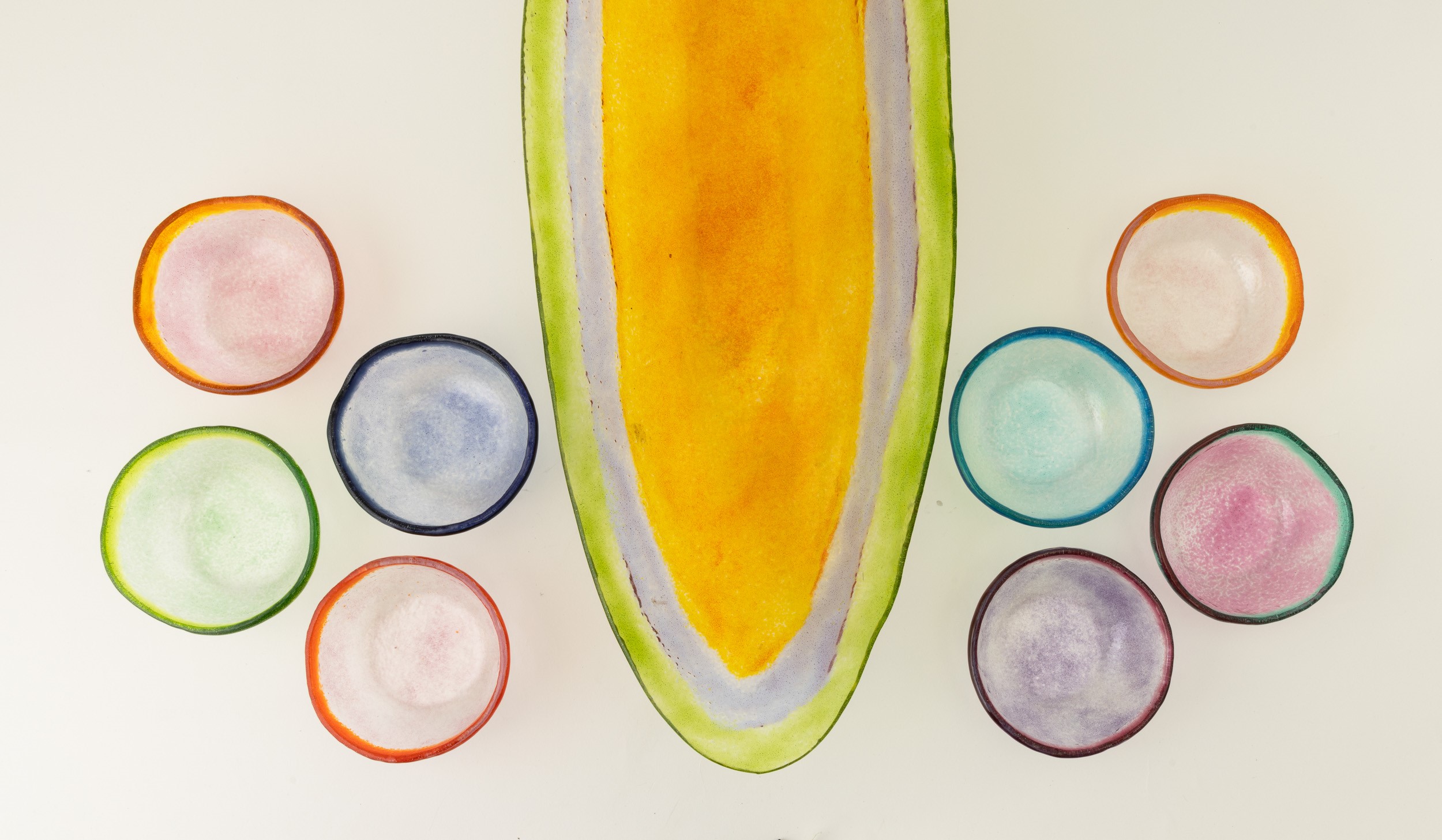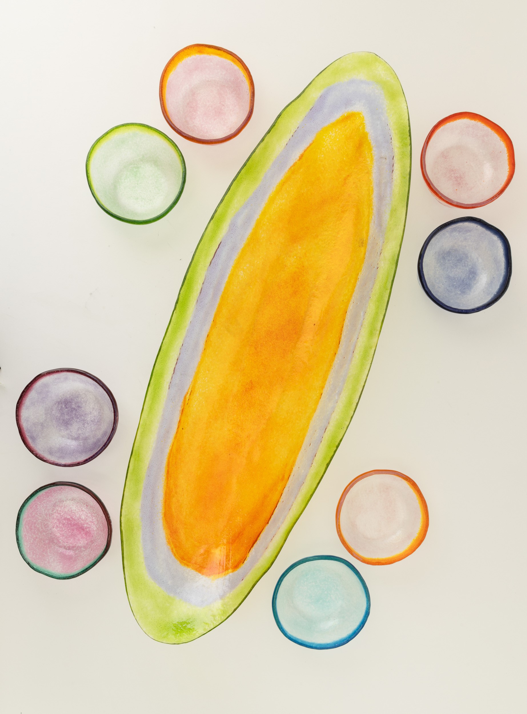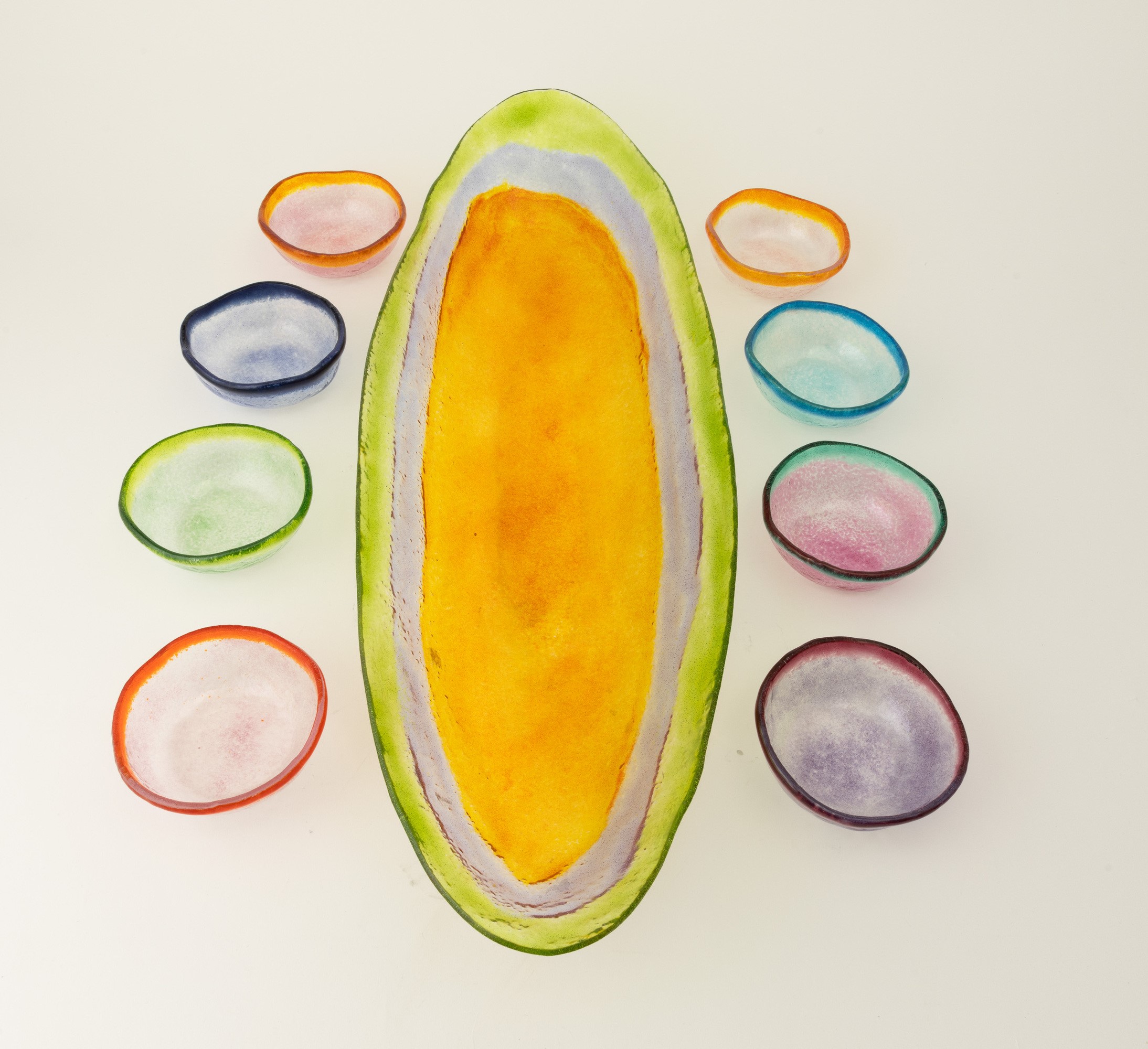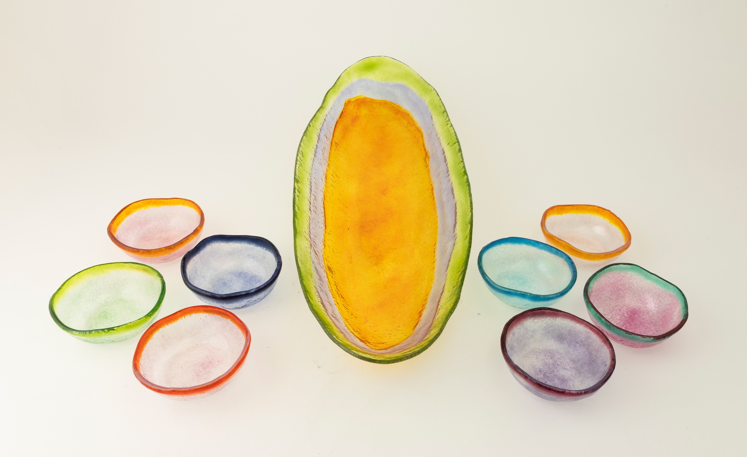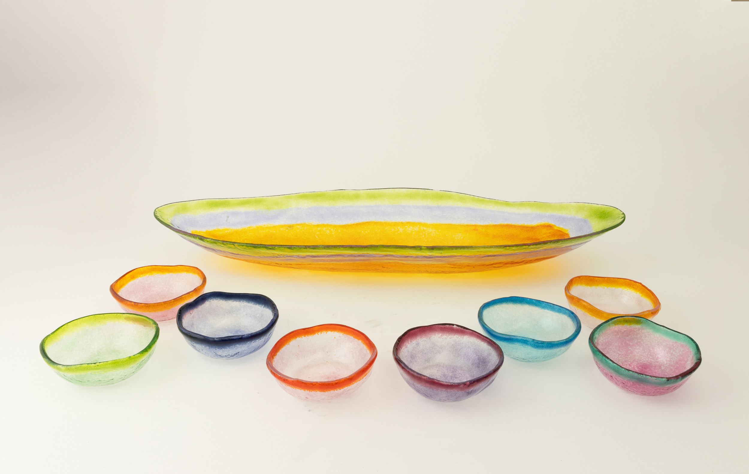 A large polychrome glass fruit bowl with eight small en-suite bowls