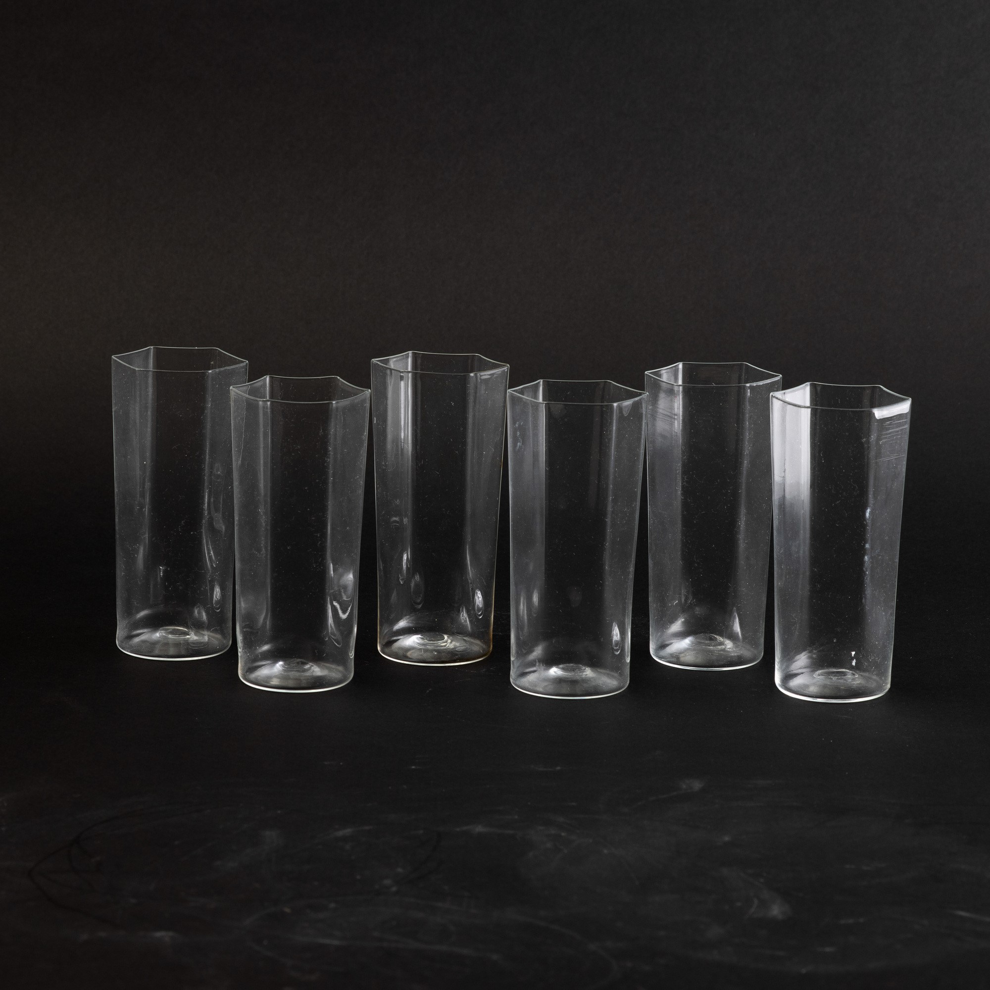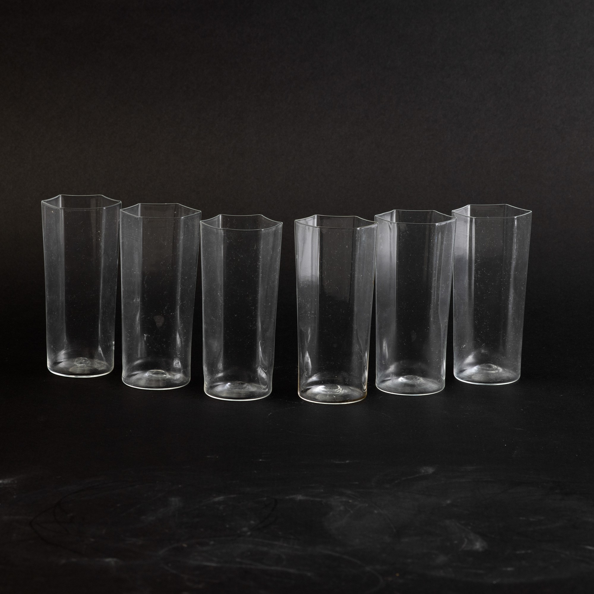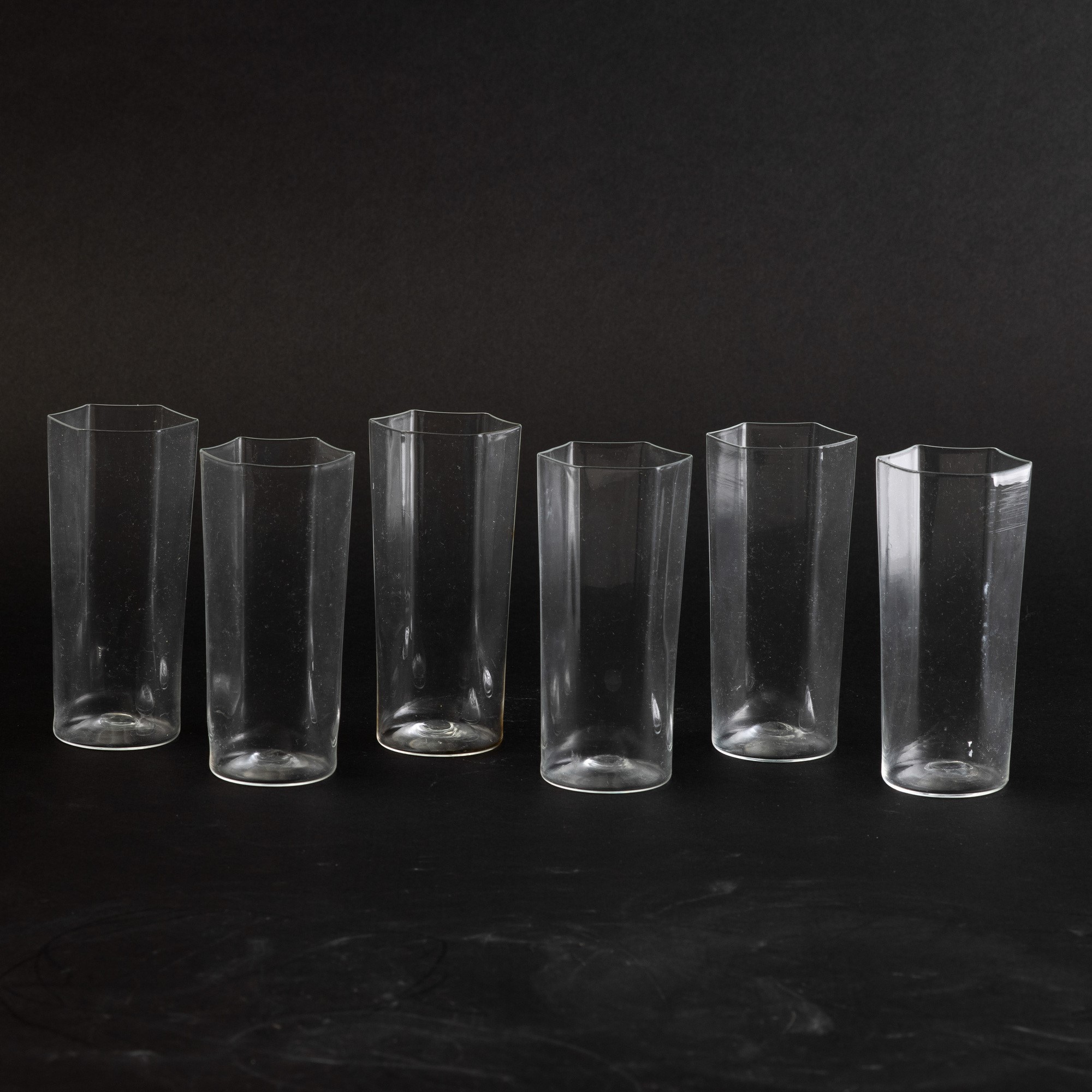 Six blown glass vases within a marmorised paper box