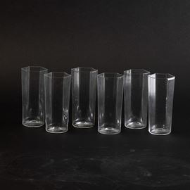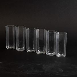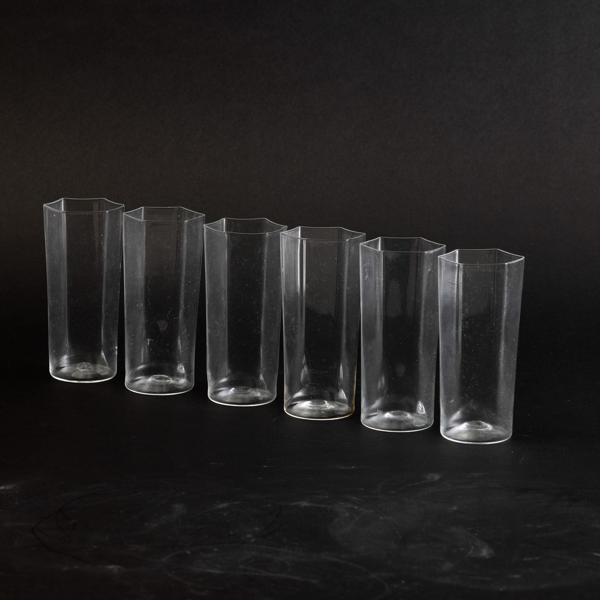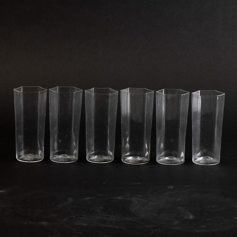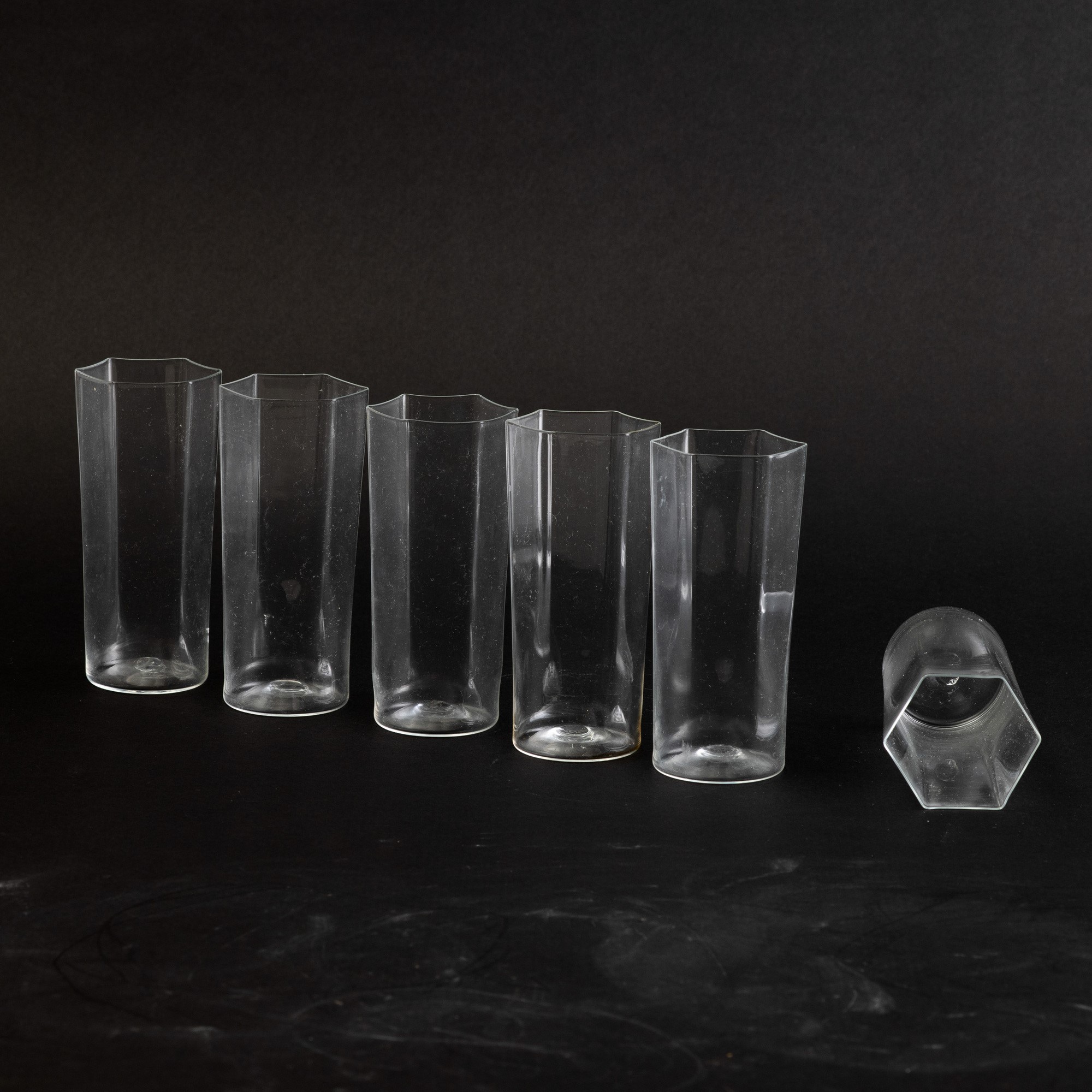 Six blown glass vases within a marmorised paper box