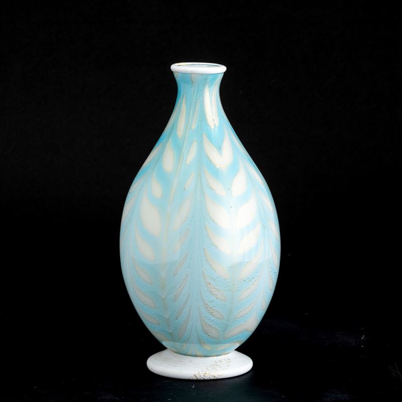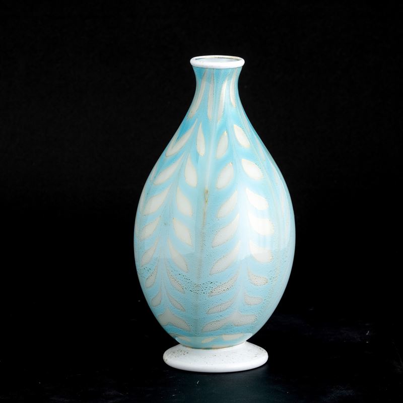 An incamiciato blown glass vase with a gold leaf decor. Acid-etched signature MVM Cappellin Murano