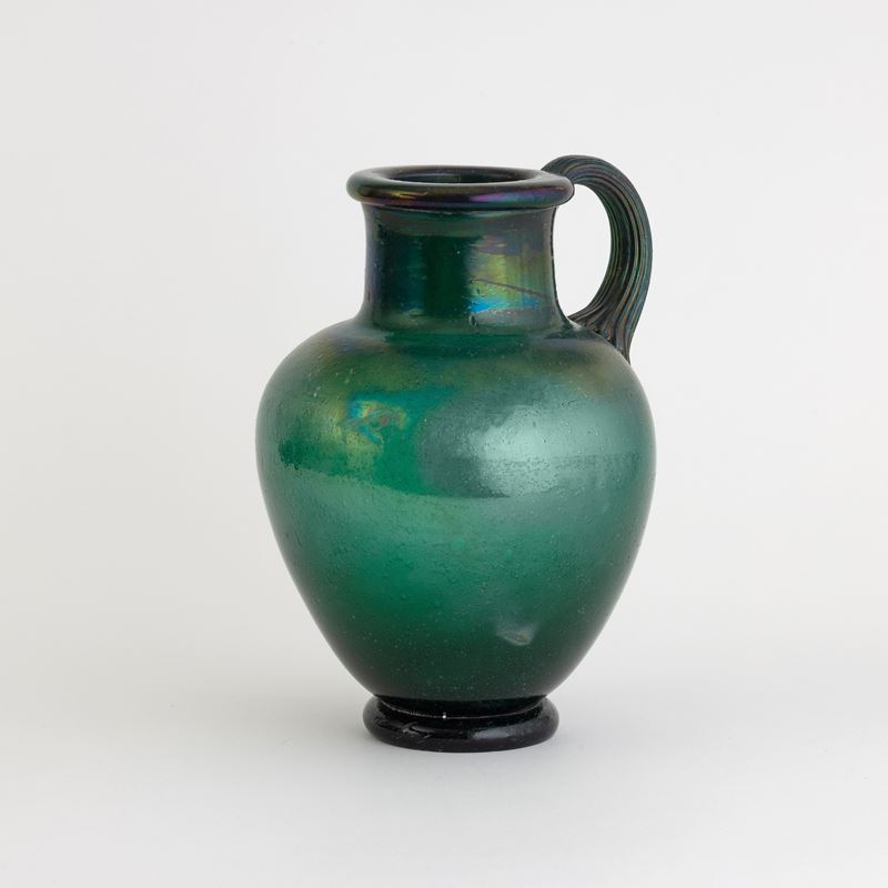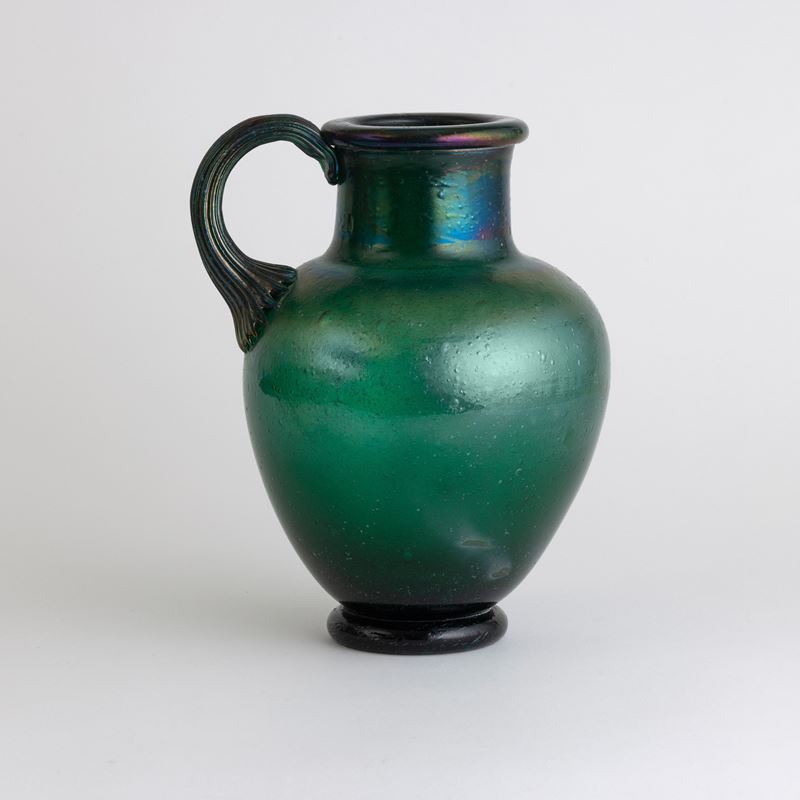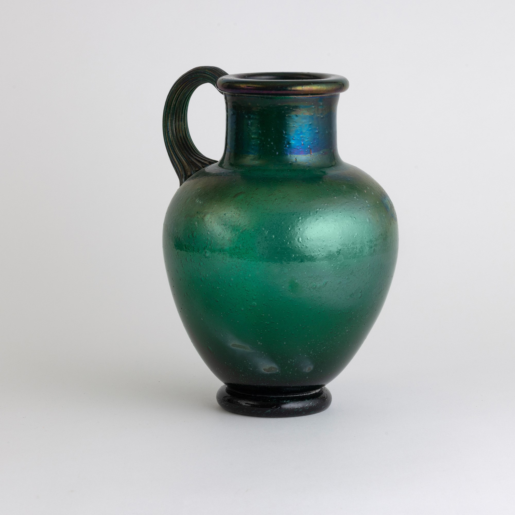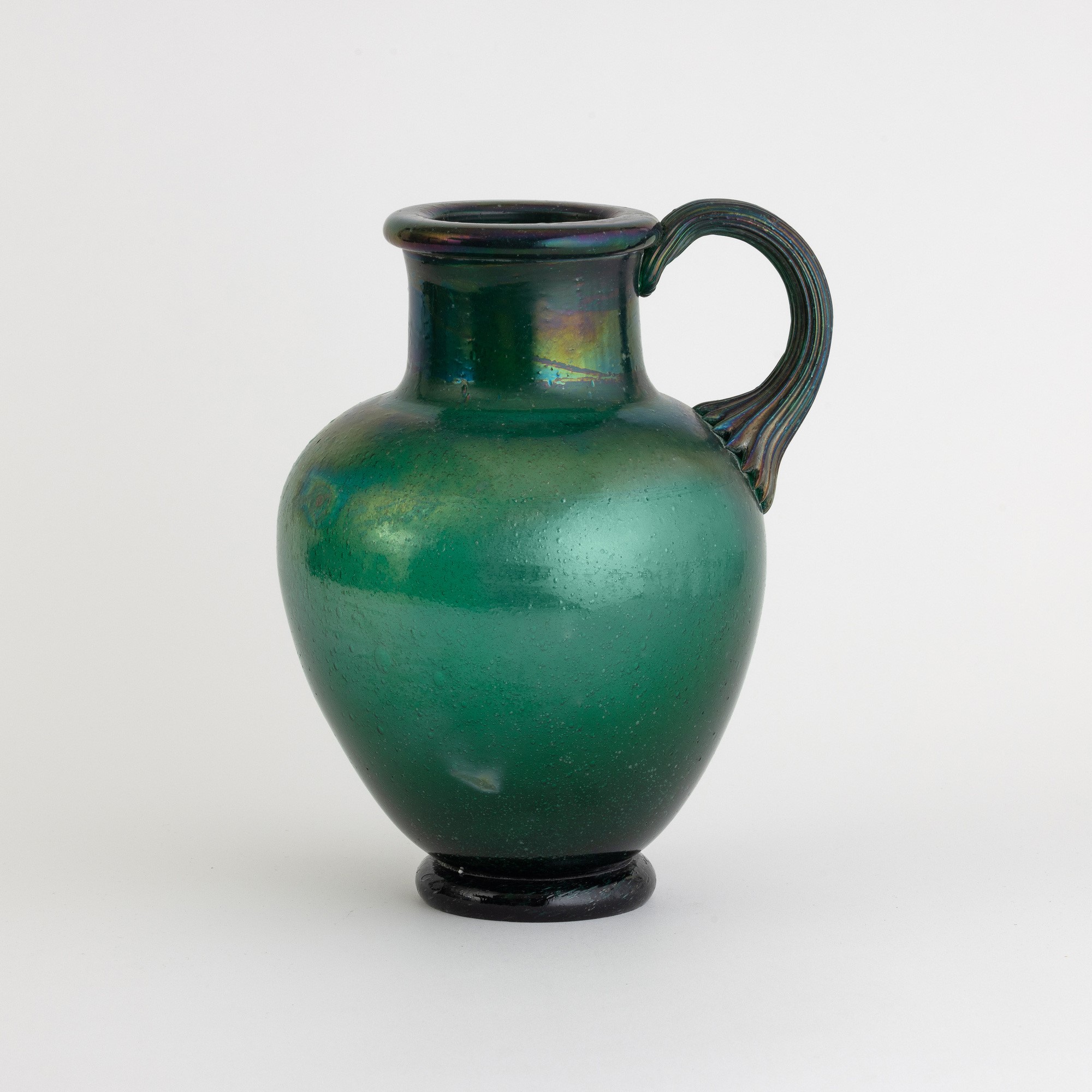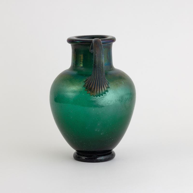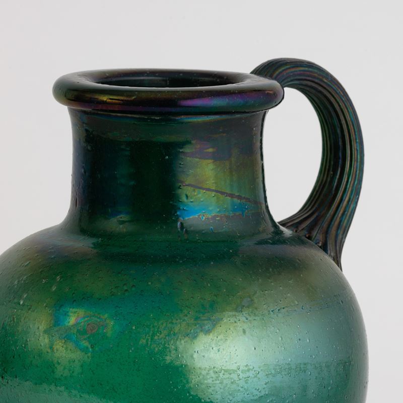 A pulegoso glass vase with an iridised surface. Engraved signature