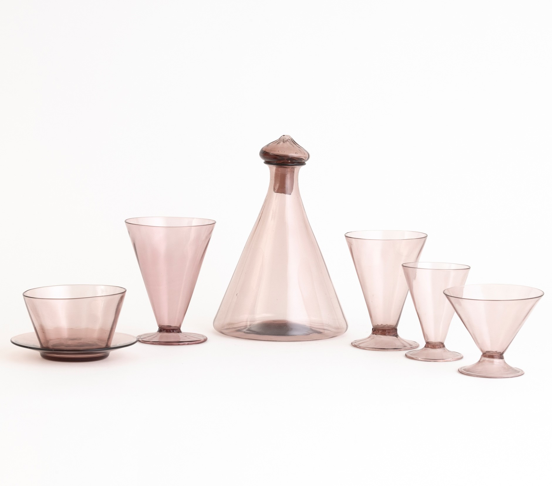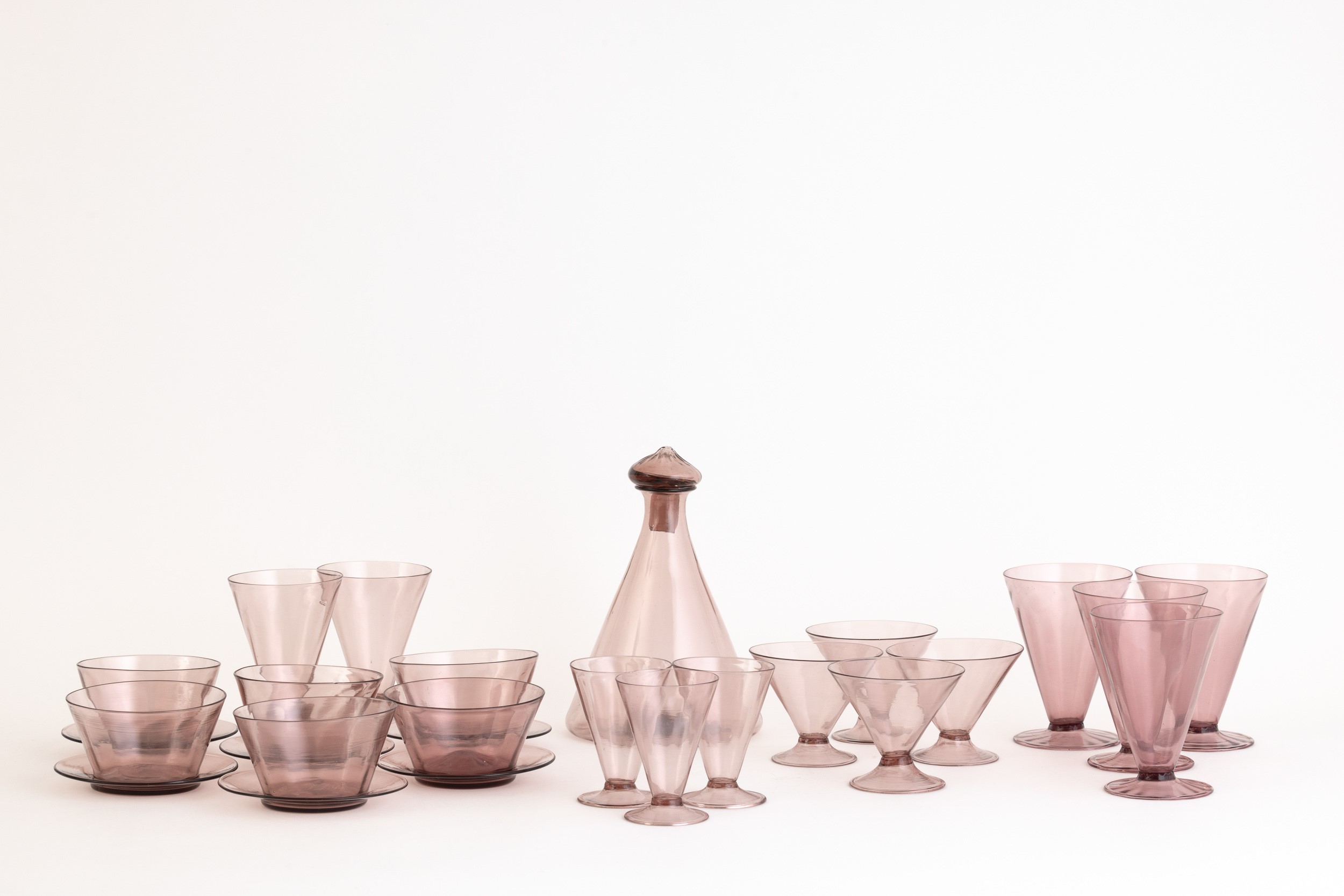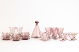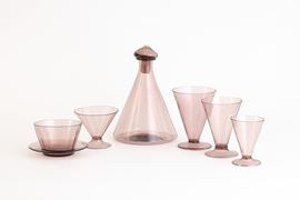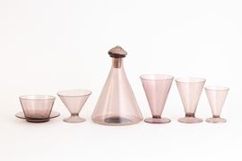 A set of glasses in four sizes, fruit bowls, plate and pitcher in amethyst blown glass. Incomplete set