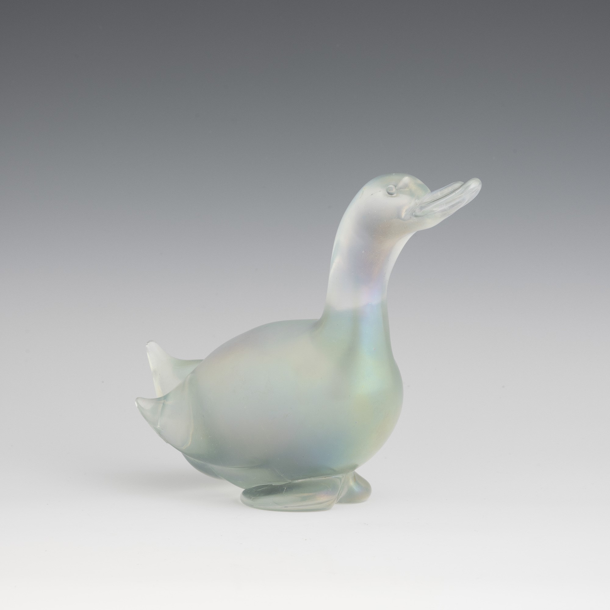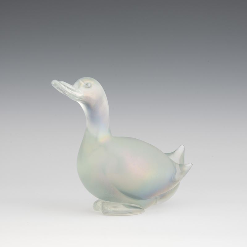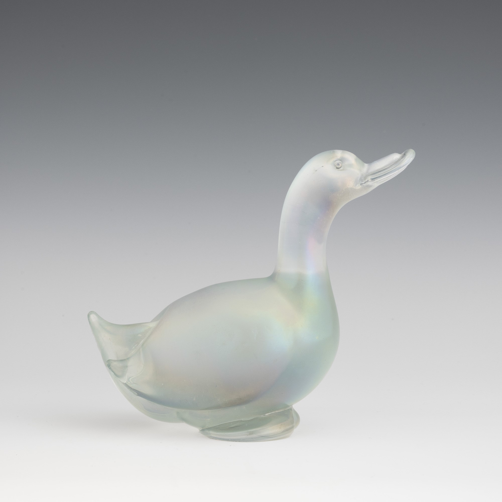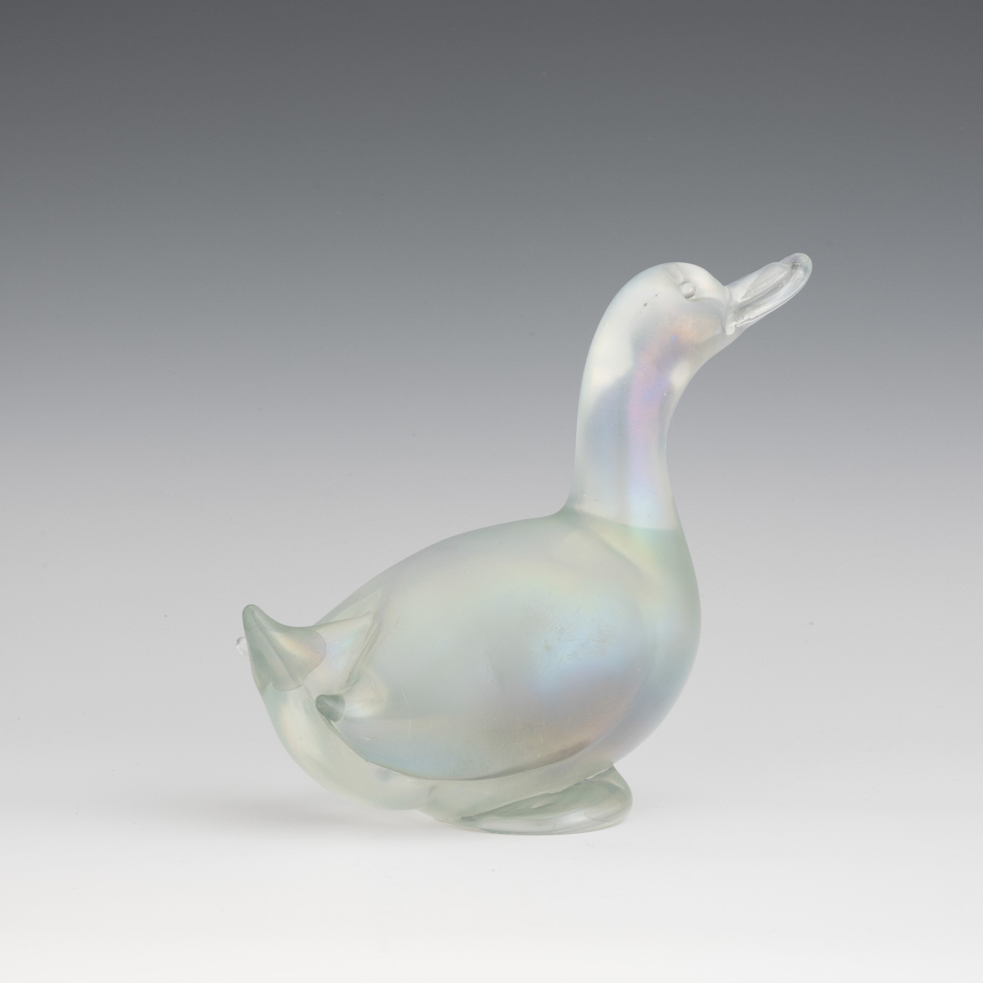 A heavy iridescent glass ornament in the shape of a duck. Small fault on the base