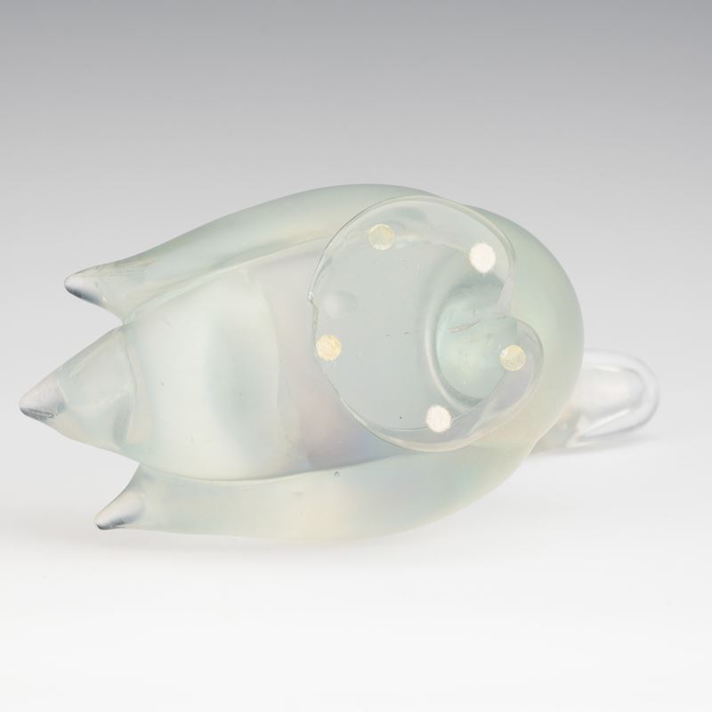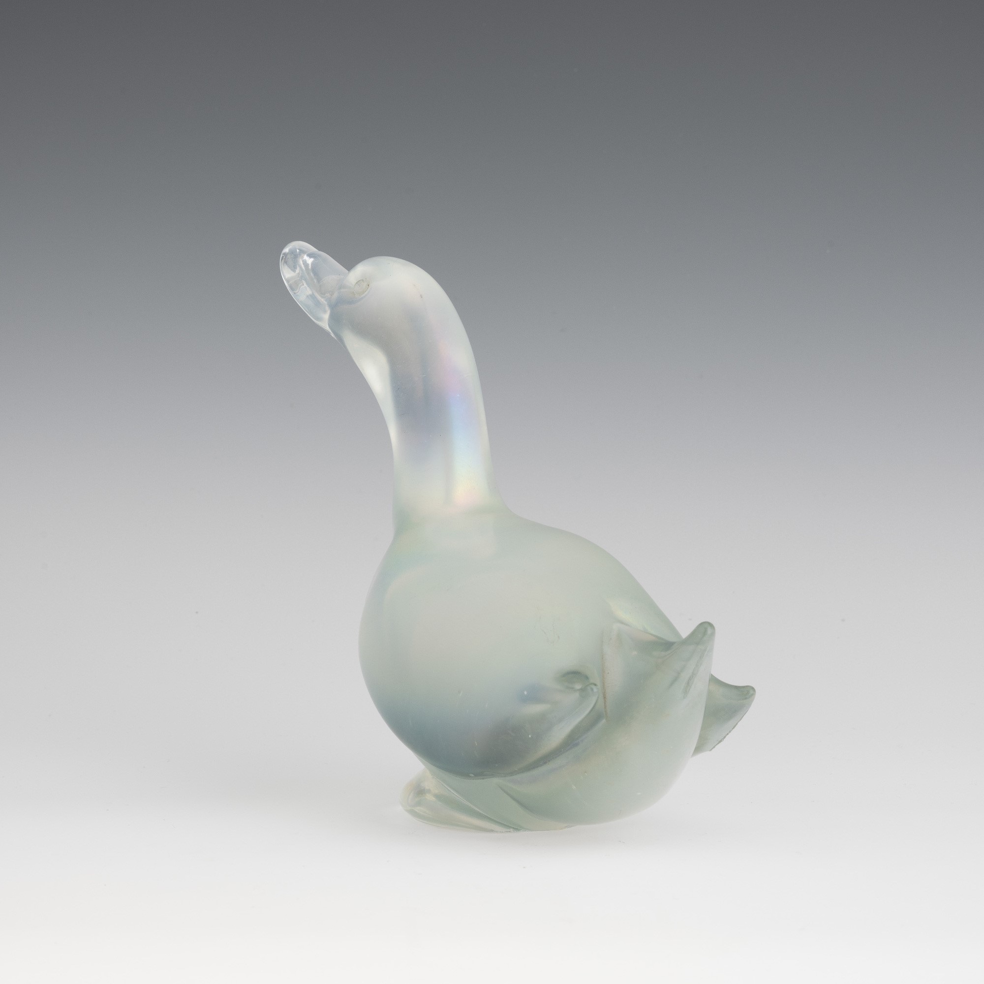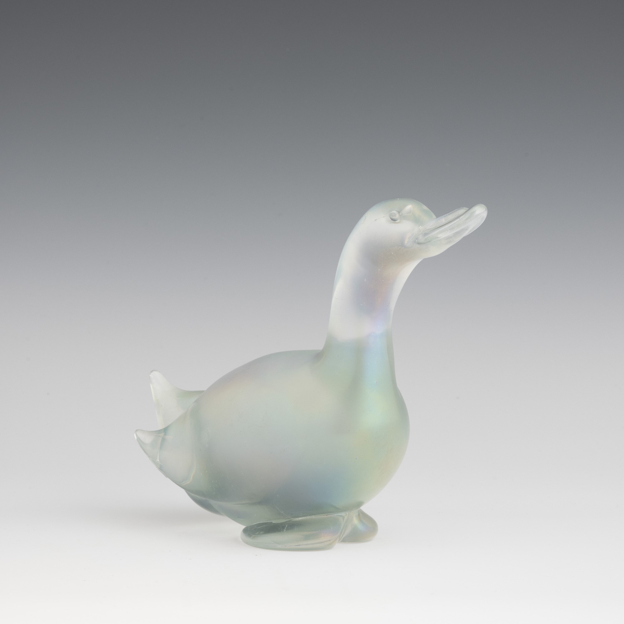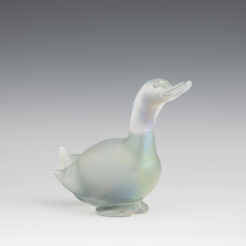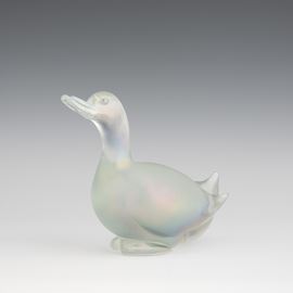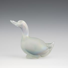A heavy iridescent glass ornament in the shape of a duck. Small fault on the base