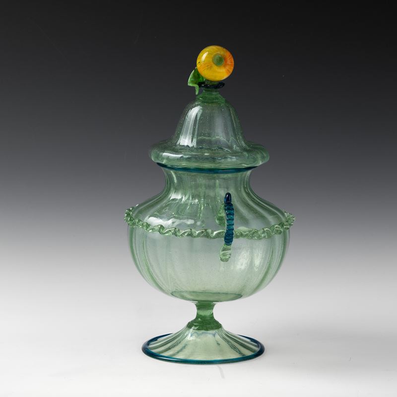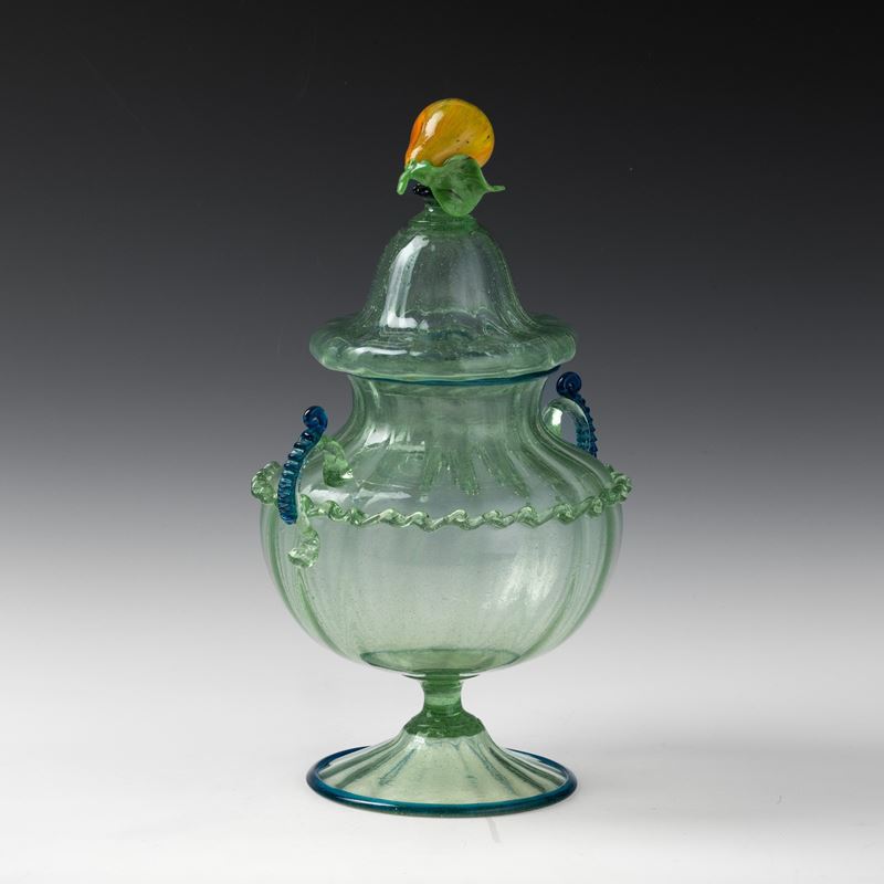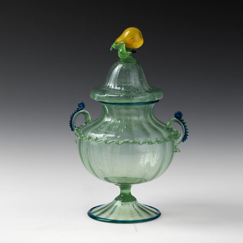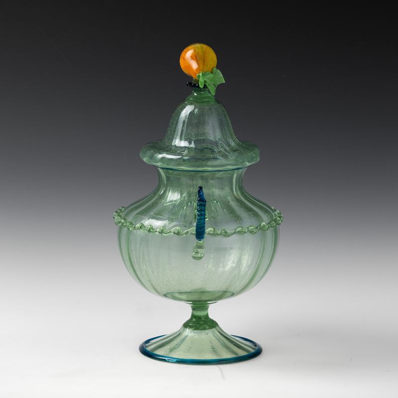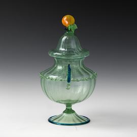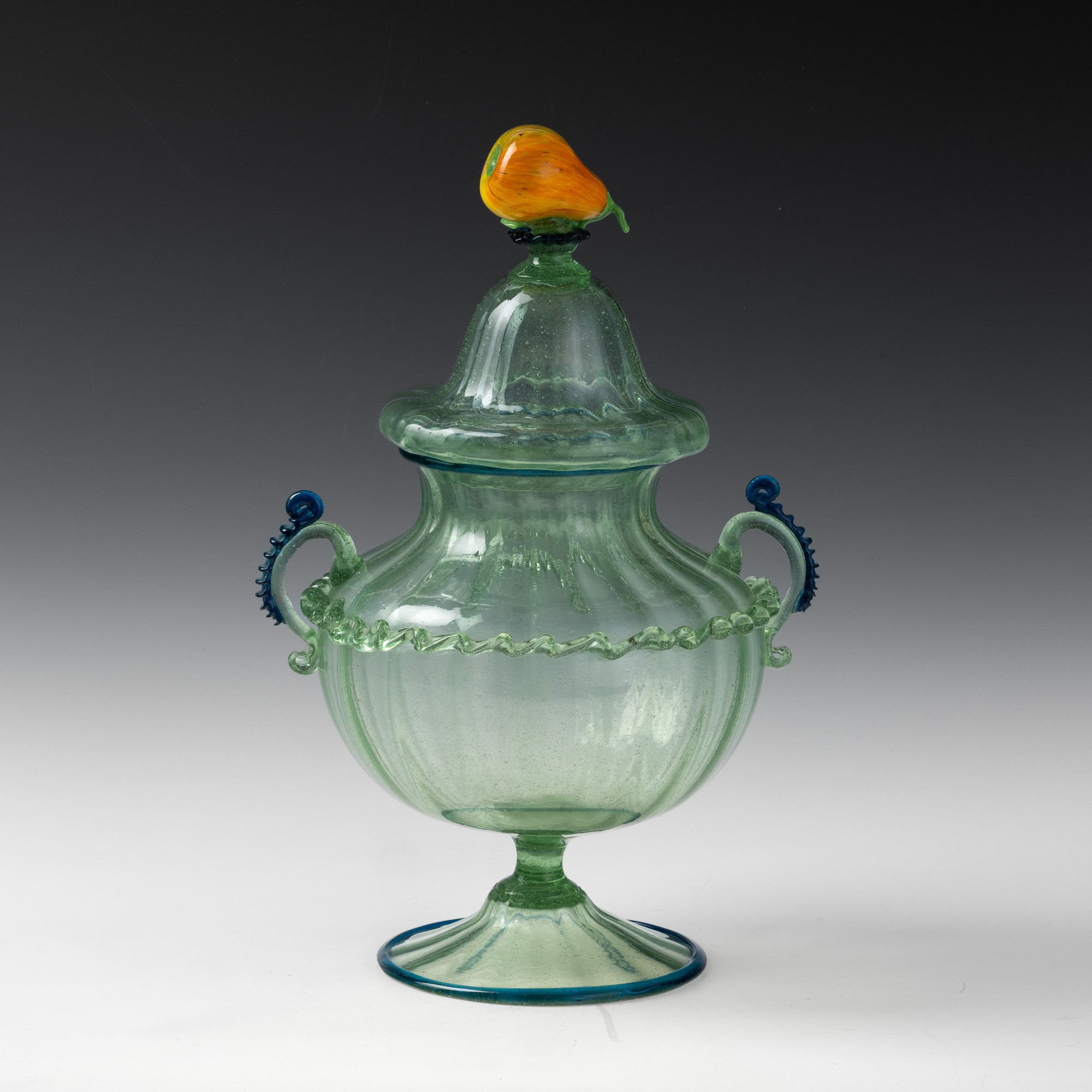 A ribbed blown glass compote jar with a glass paste fruit-shaped detail on the lid