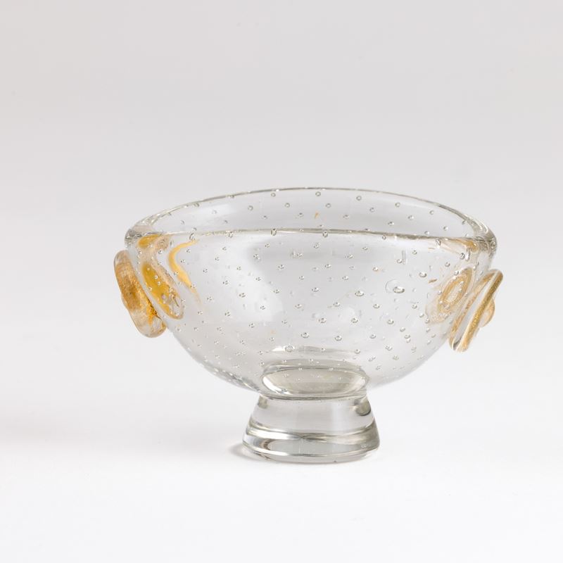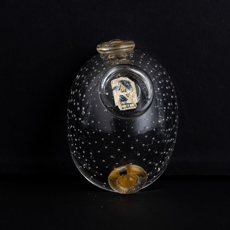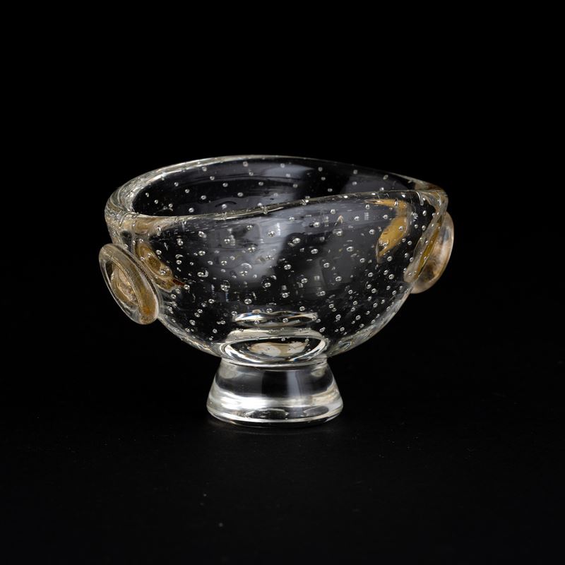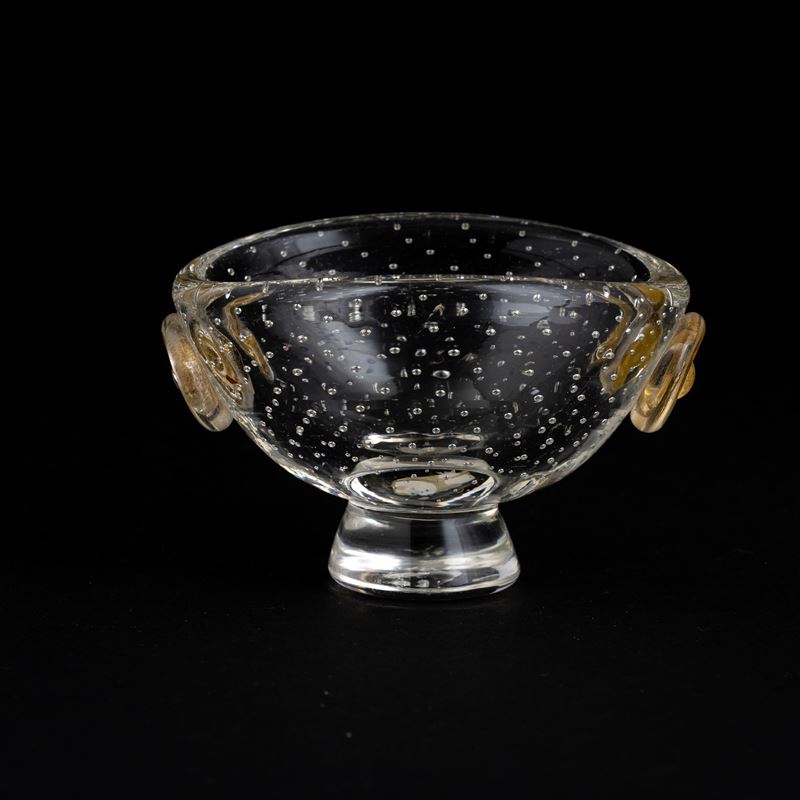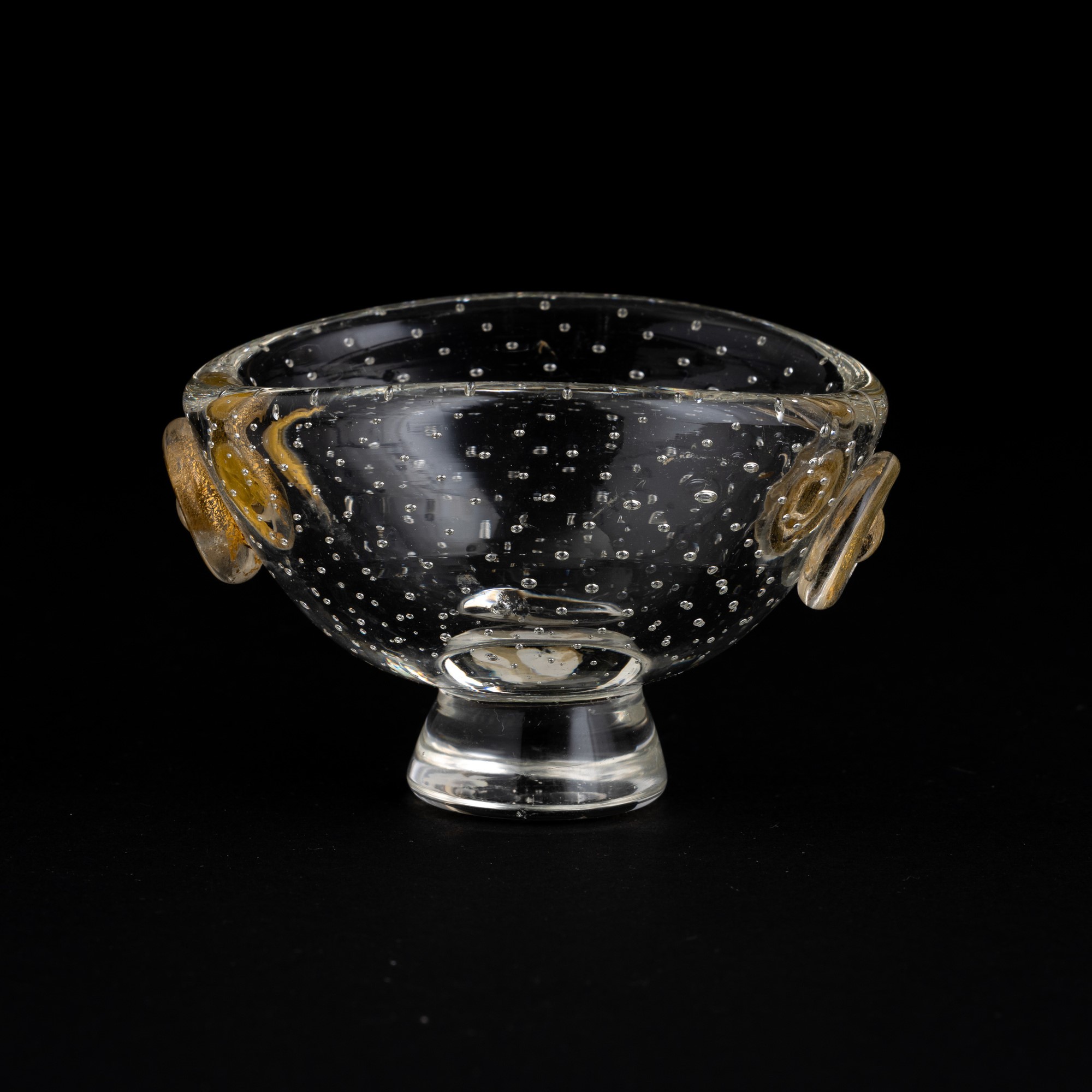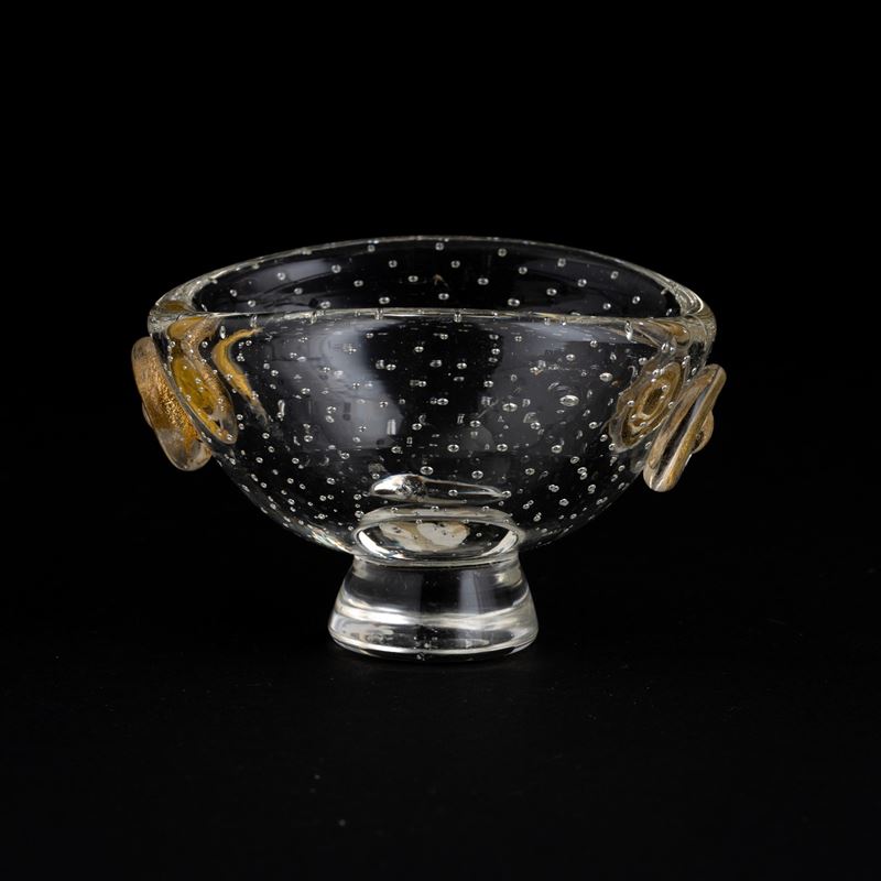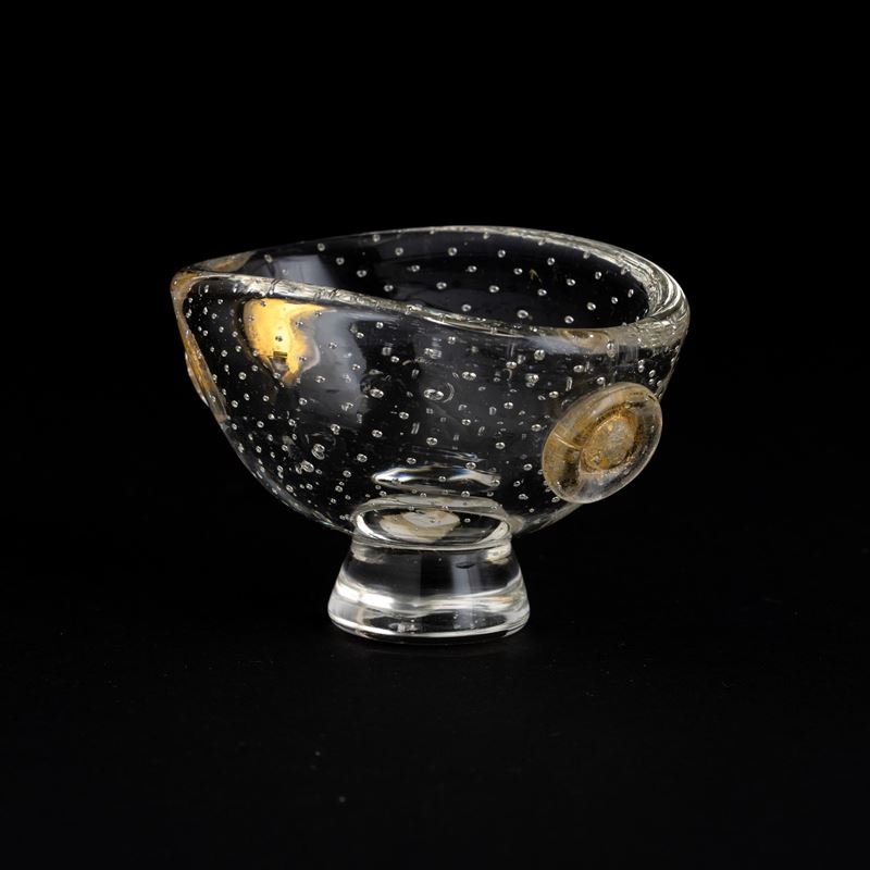 A glass bowl with a gold leaf and bubble decor. Old paper label