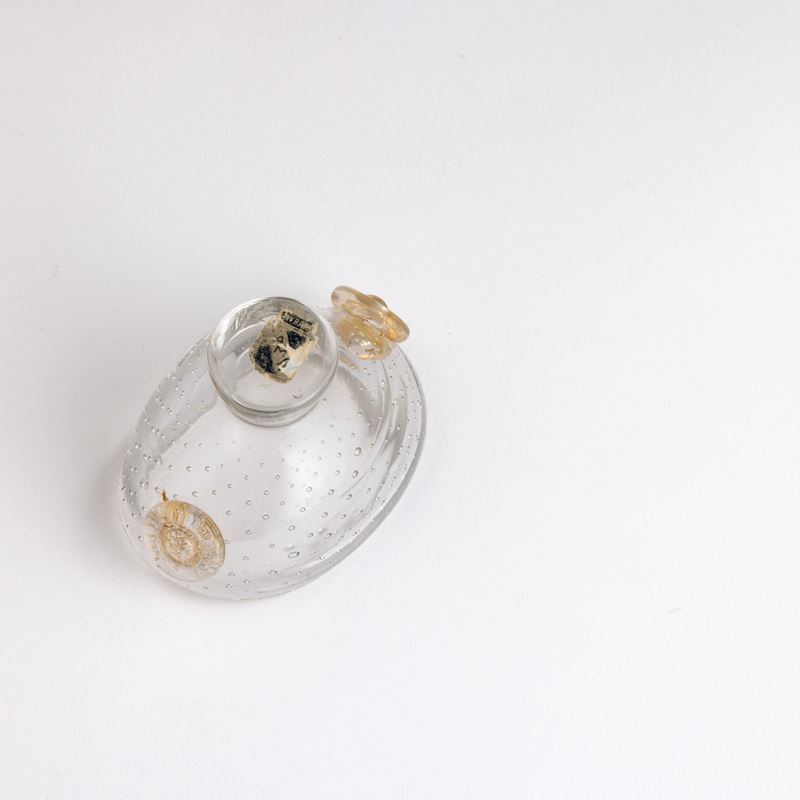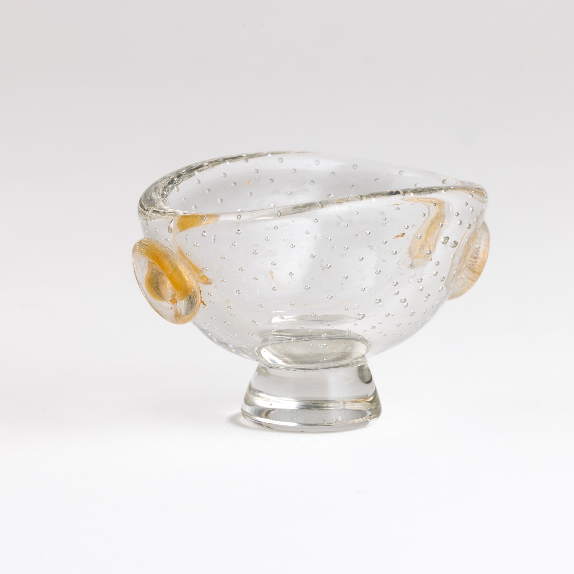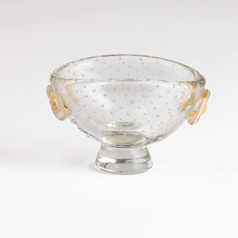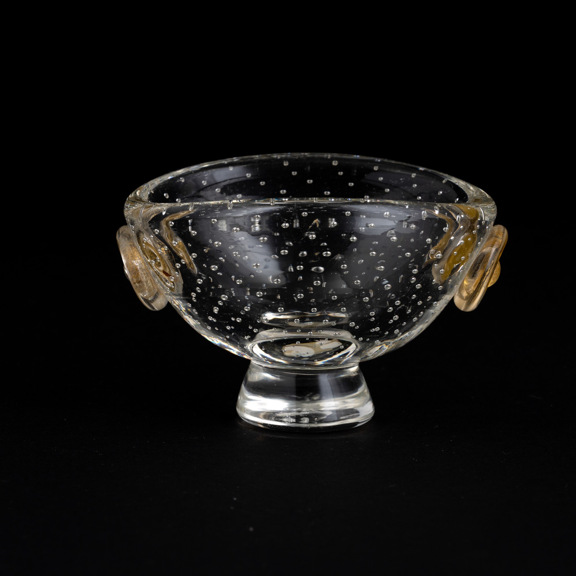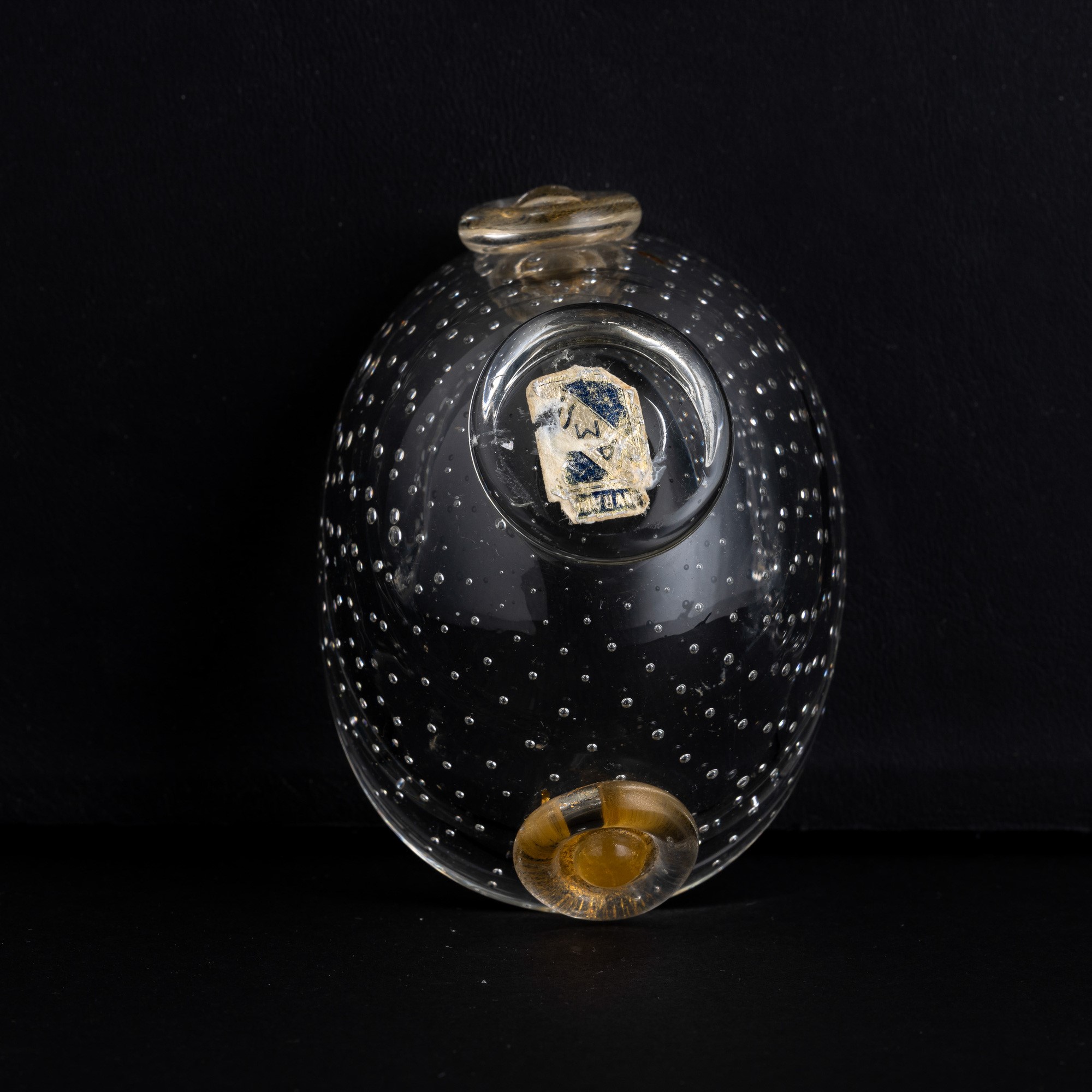 A glass bowl with a gold leaf and bubble decor. Old paper label