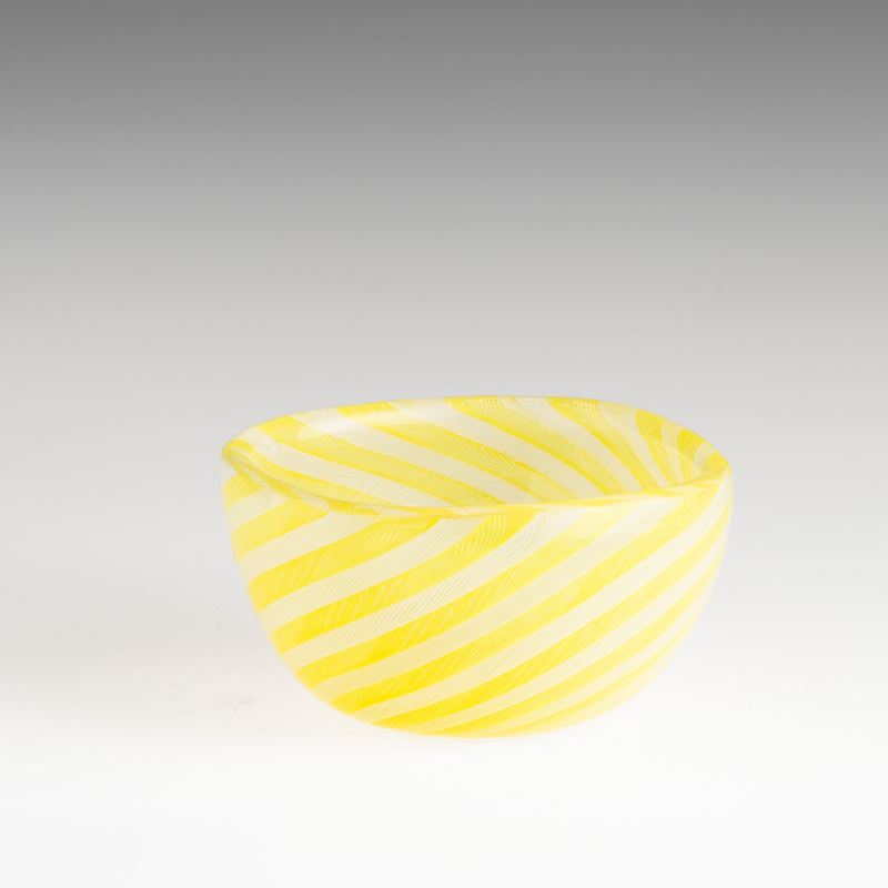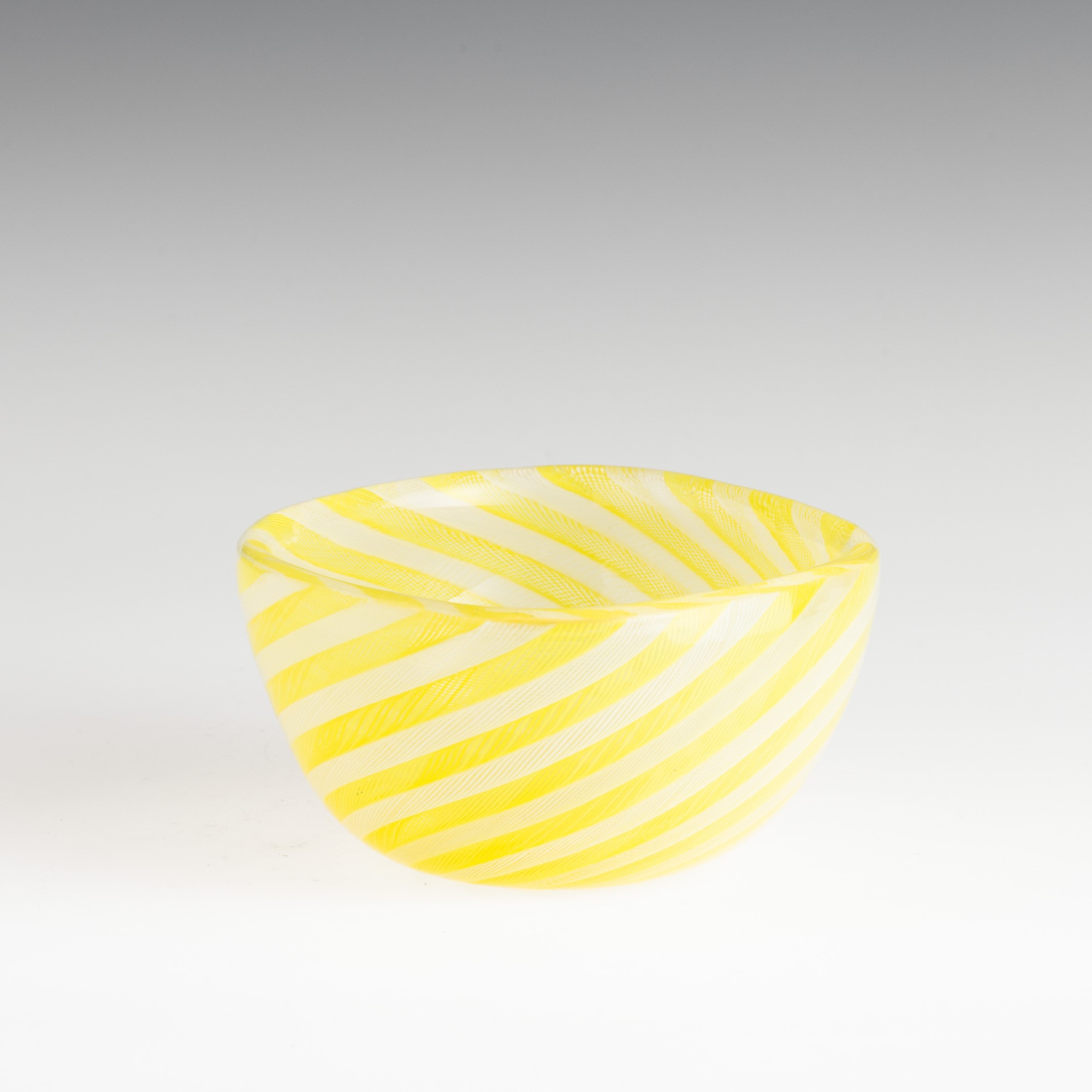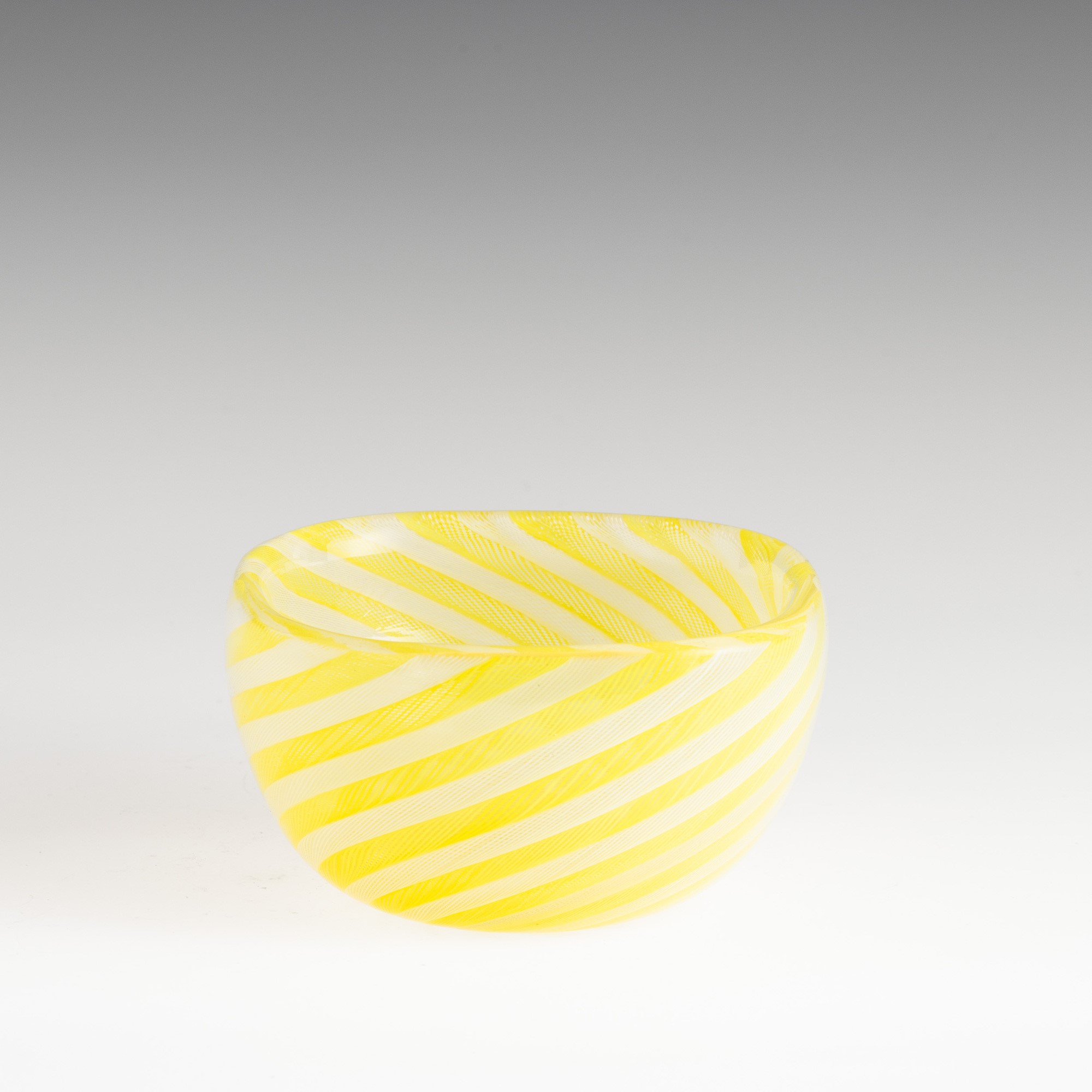A blown glass square bowl with a decor of zanfirico canes. Acid-etched signature Venini Murano Italia