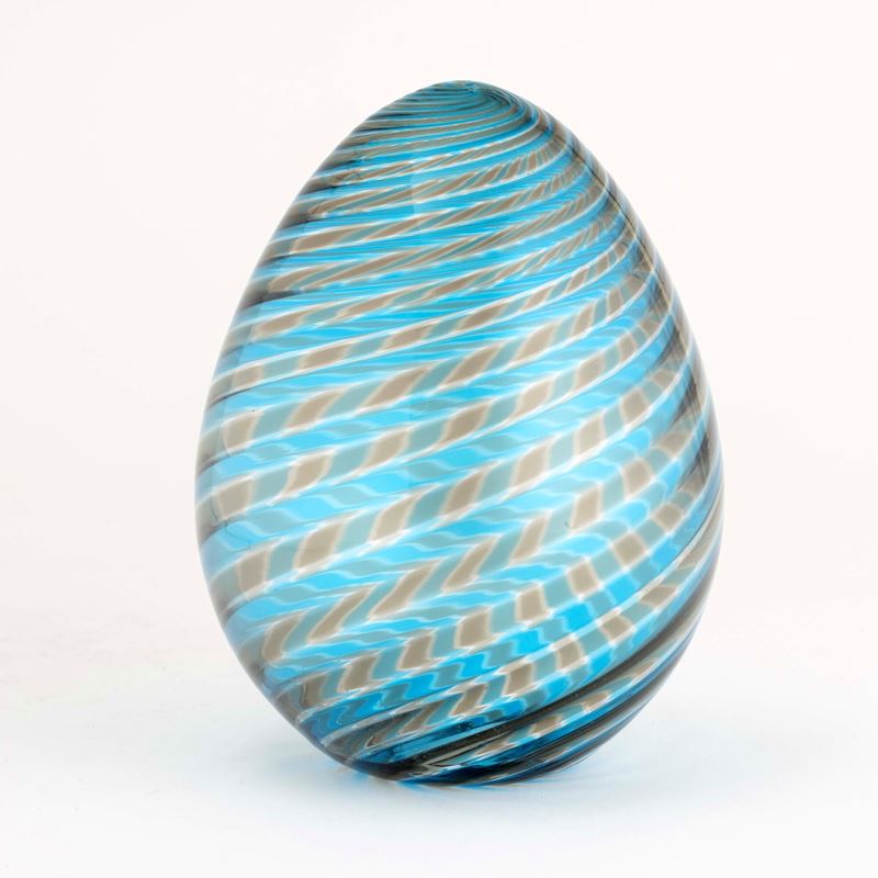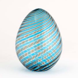 An egg-shaped blown glass ornament with a two-toned cane decor