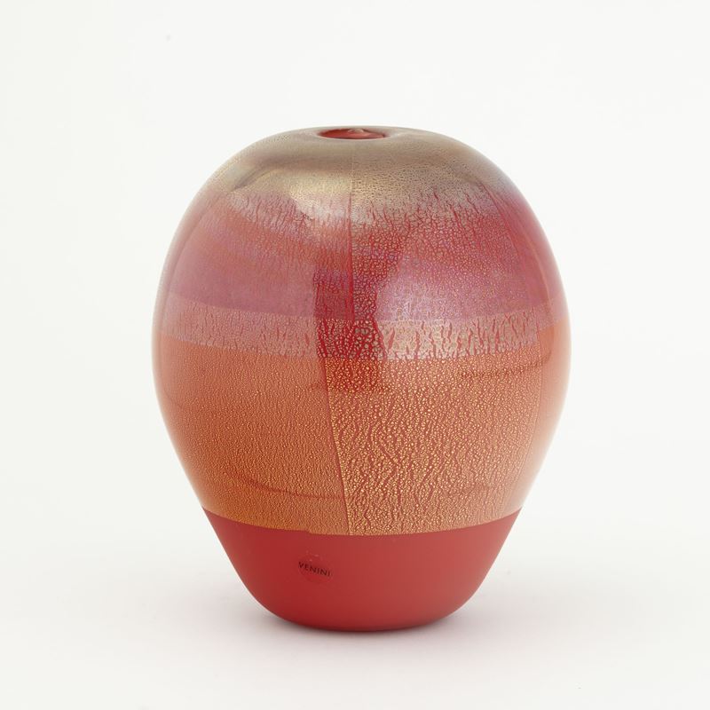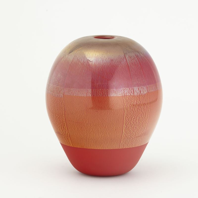 A blown glass vase from the Quarzi series with a gold and silver leaf decor. Etched date and signature