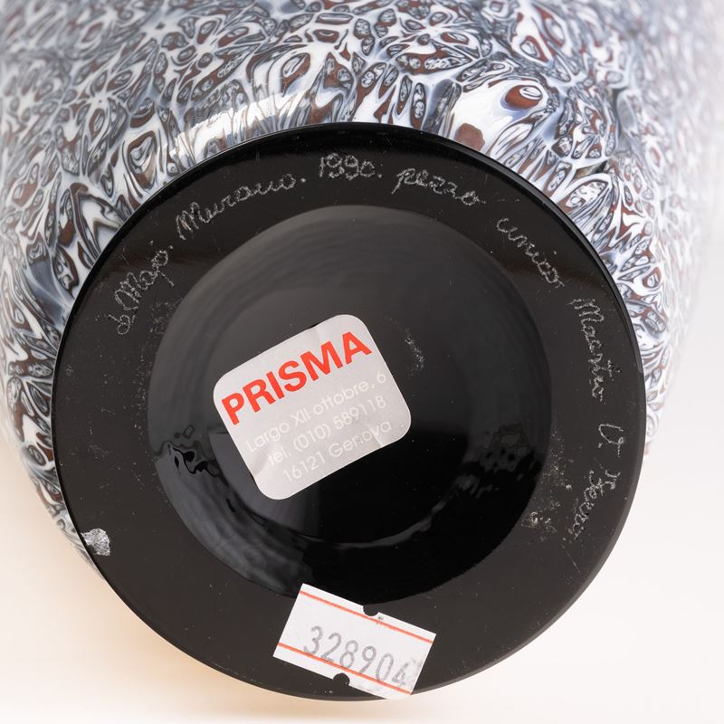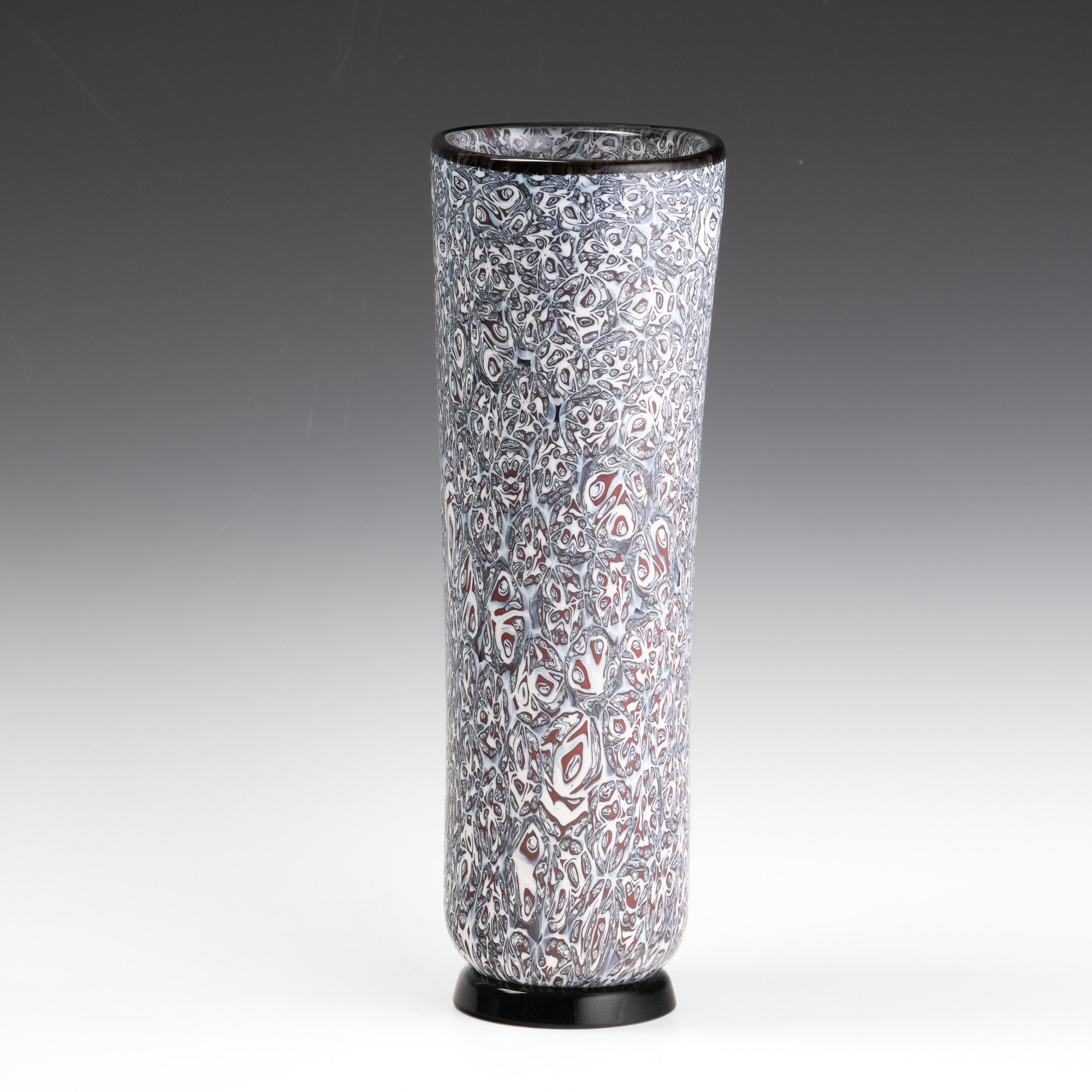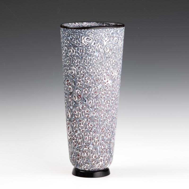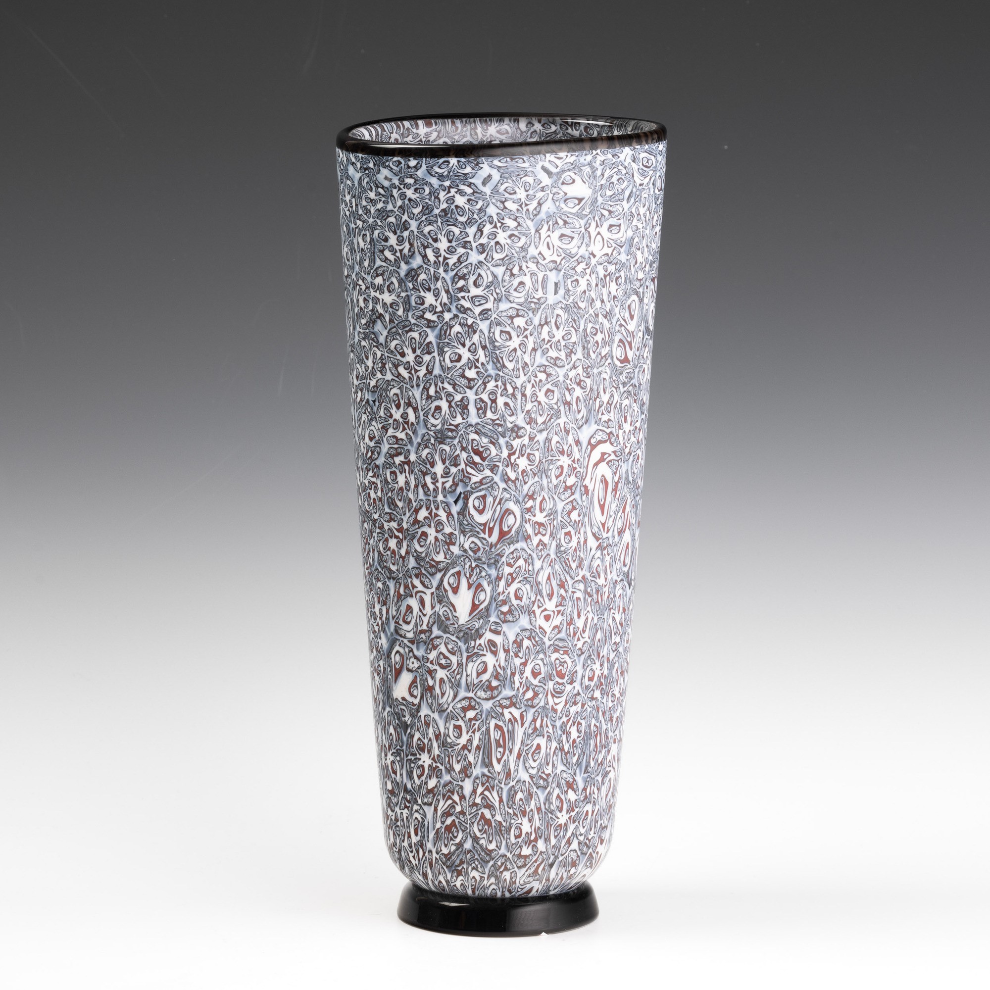 Oval section Mosaic series truncated cone vase in sommerso glass decorated with variegated 'lattimo' (milky) murrines.