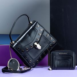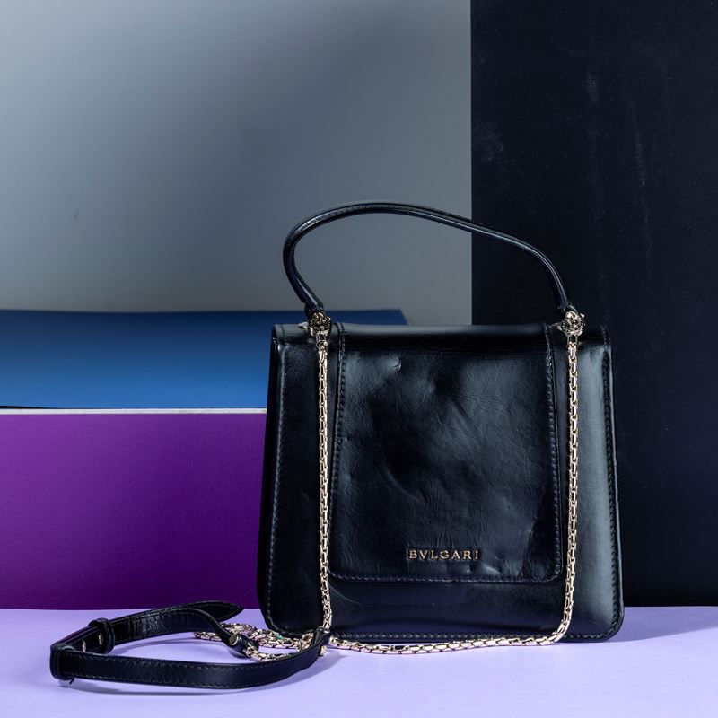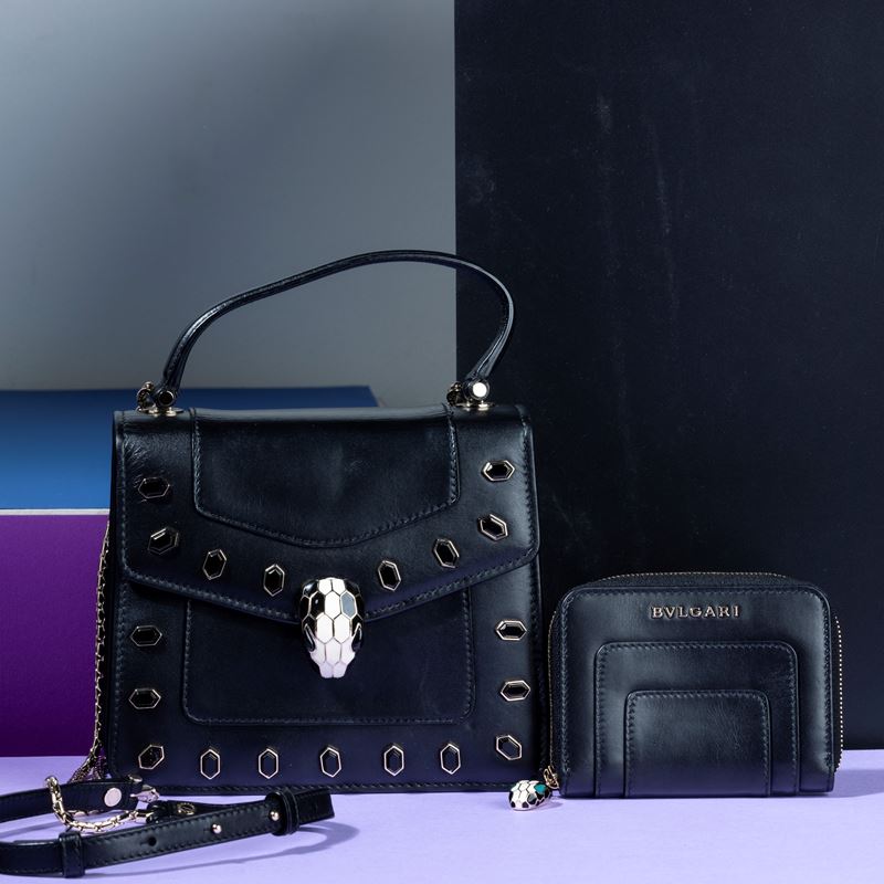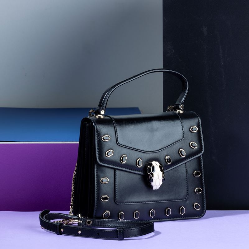 Bulgari Collezione “Serpenti” in pelle e borchie con portafogli abbinato e specchietto, difetti, in buone condizioni, du [..]