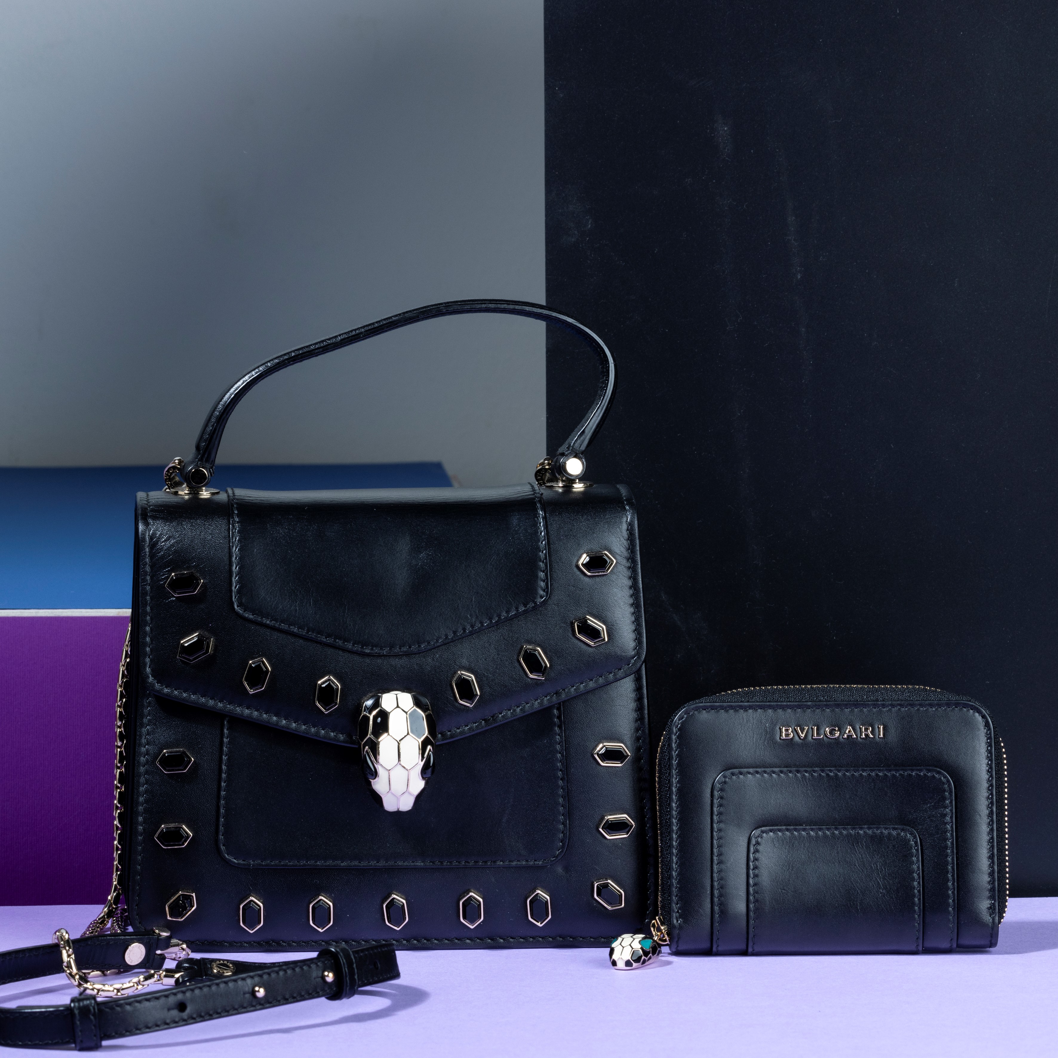 Bulgari Collezione “Serpenti” in pelle e borchie con portafogli abbinato e specchietto, difetti, in buone condizioni, dustbag
