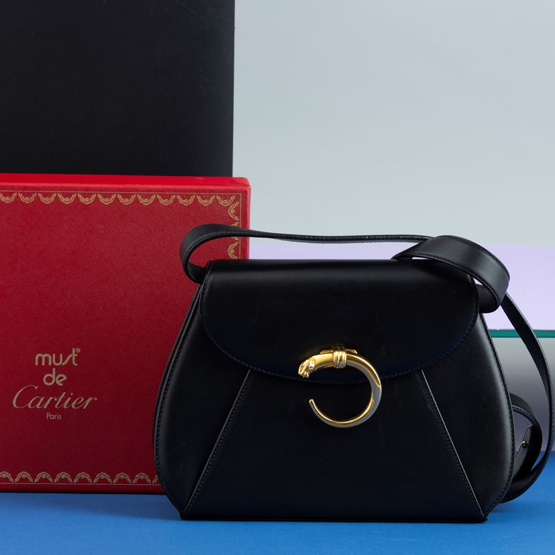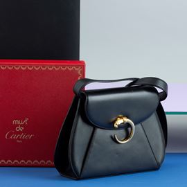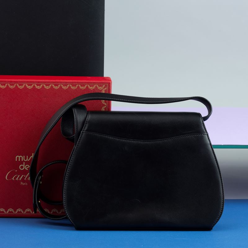 Cartier borsa tracolla piccola in pelle nera con dustbag e scatola originale, NOS