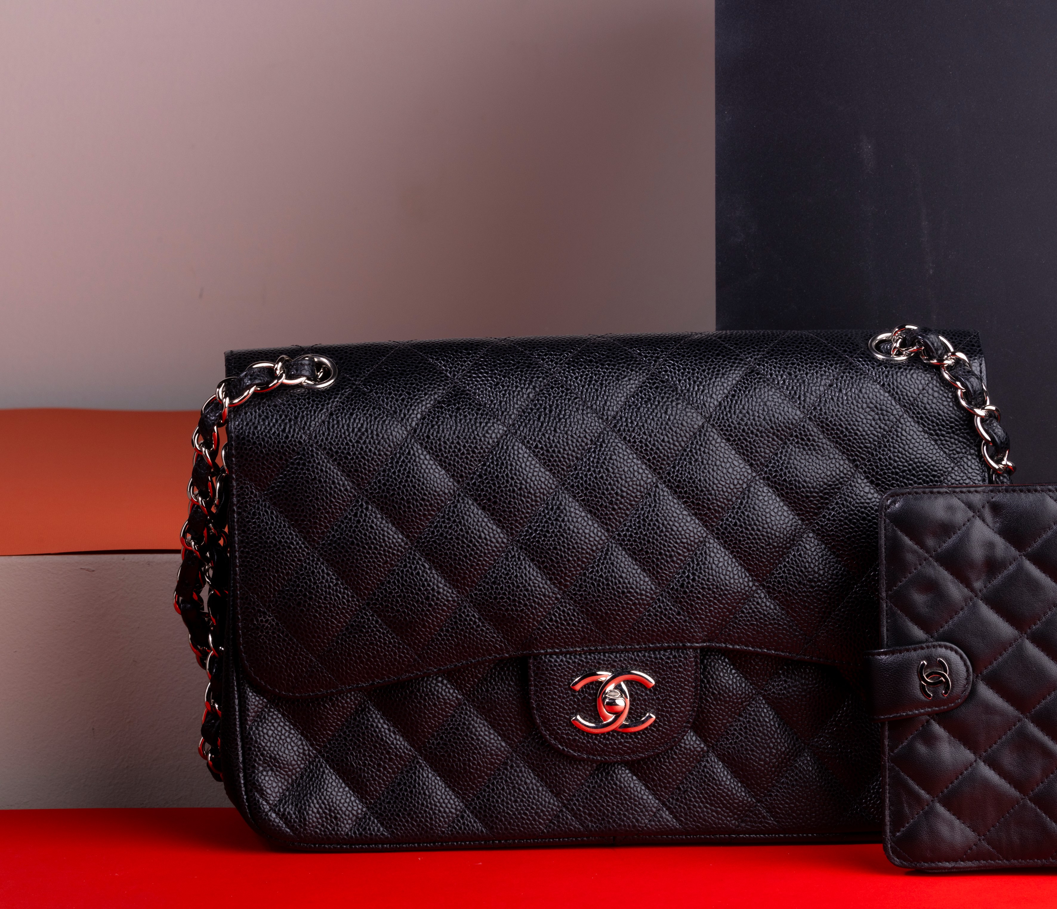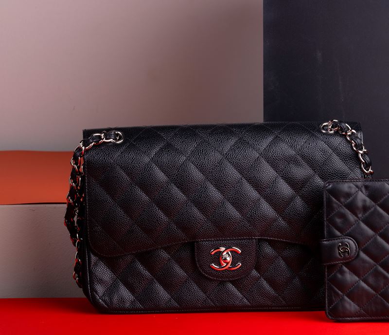 Chanel Jumbo in pelle nera trapuntata e martellata con tracolla a catena scorrevole per indossarla a spalla oppure ad incrocio.