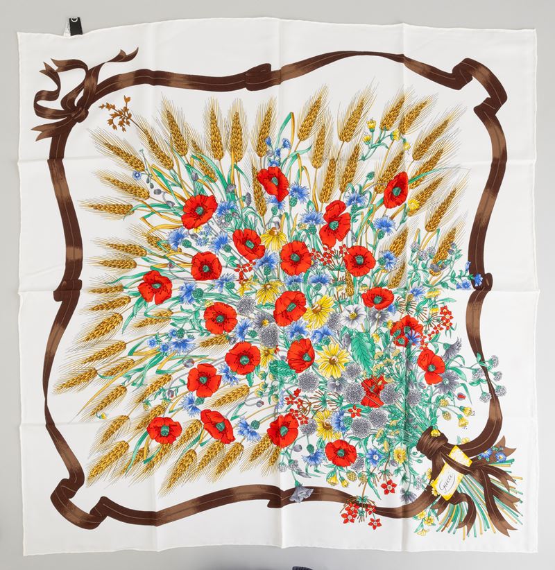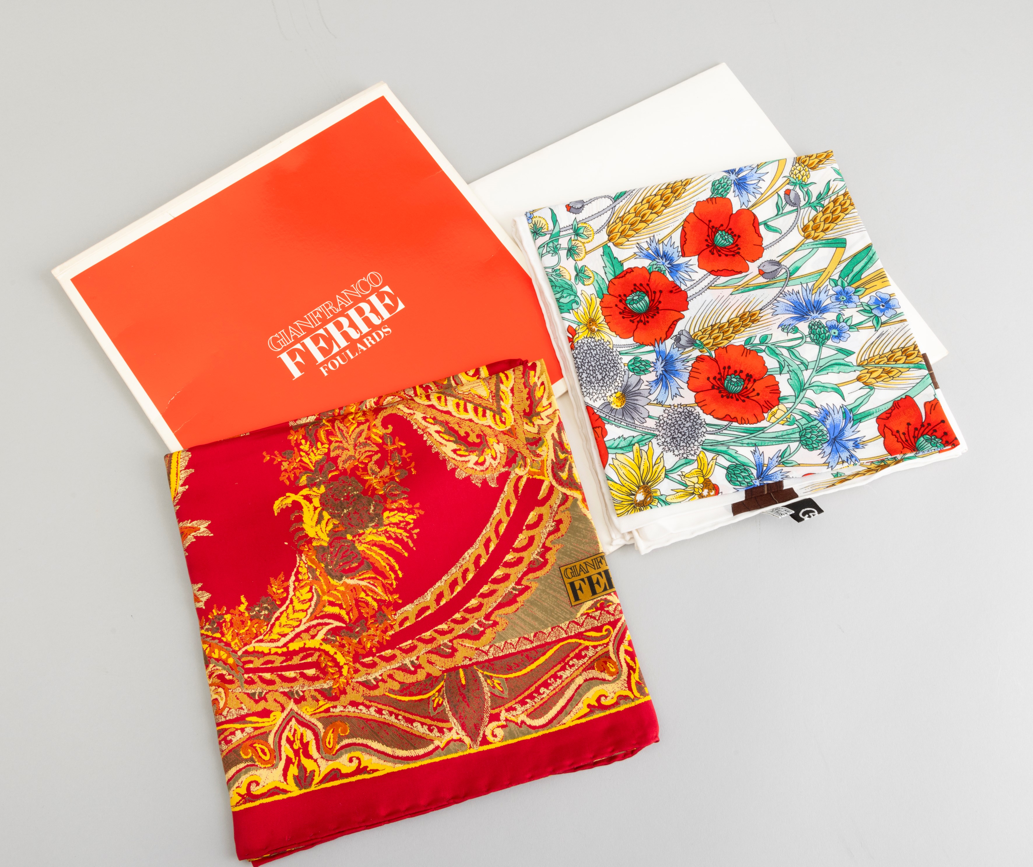 Lotto di 2 Foulard Gucci e Ferré in seta, Ferré cm 88x84, Gucci 87x43 cm, difetti, in buone condizioni