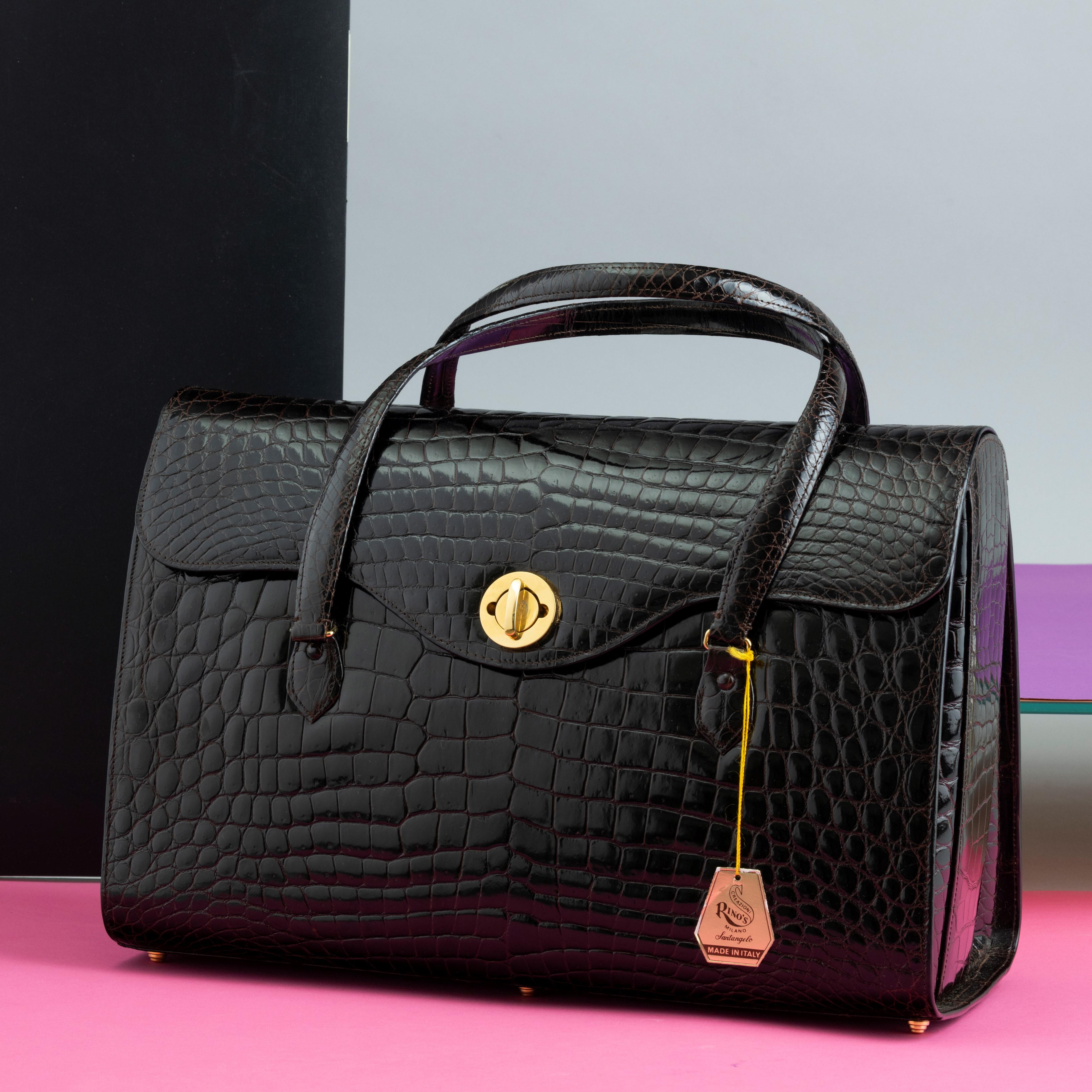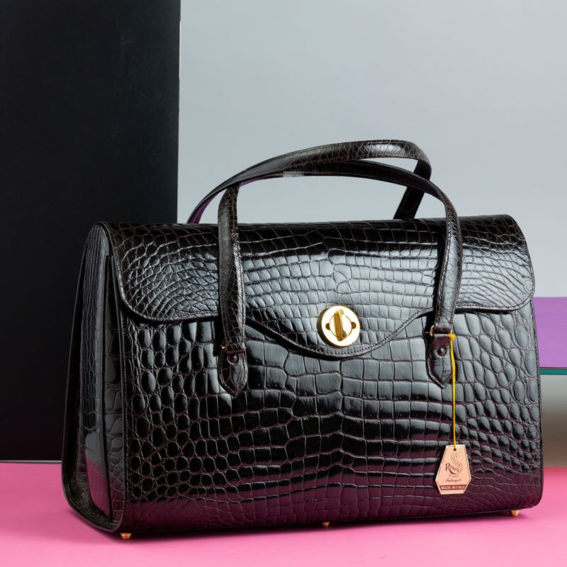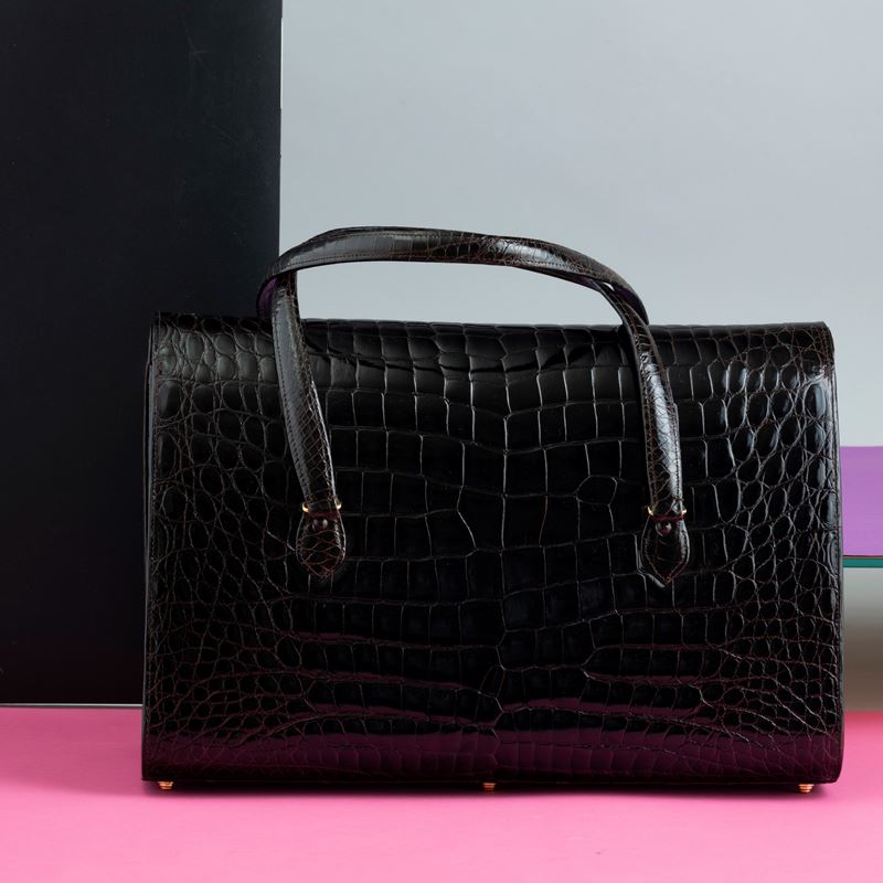 Rino's Borsa in coccodrillo marrone scuro con autorizzazione Cites, manifattura artigianale, porta tablet con multi tasche interne, NOS