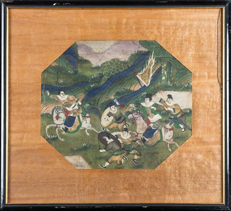 Coppia di dipinti su carta raffiguranti scene di battaglia, Cina, Dinastia Qing, XIX secolo