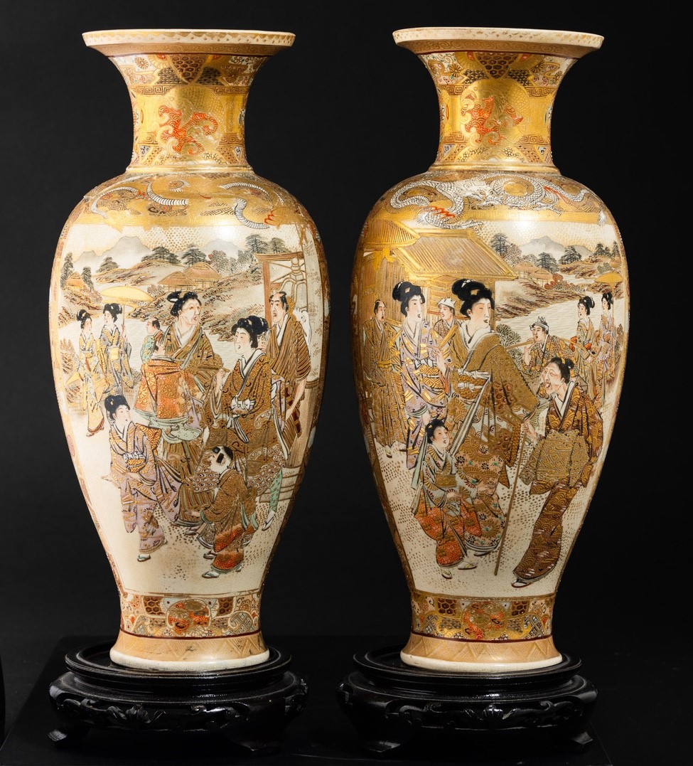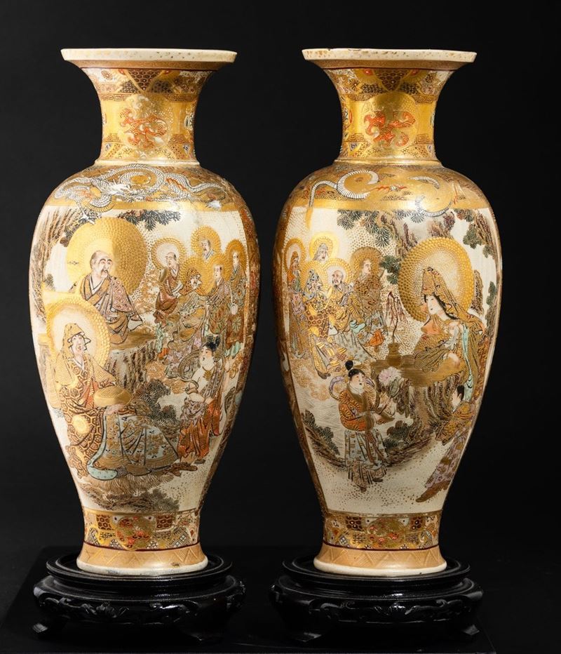 Coppia di vasi in porcellana Satsuma con figure di divinità, Giappone, periodo Meiji (1868-1912)