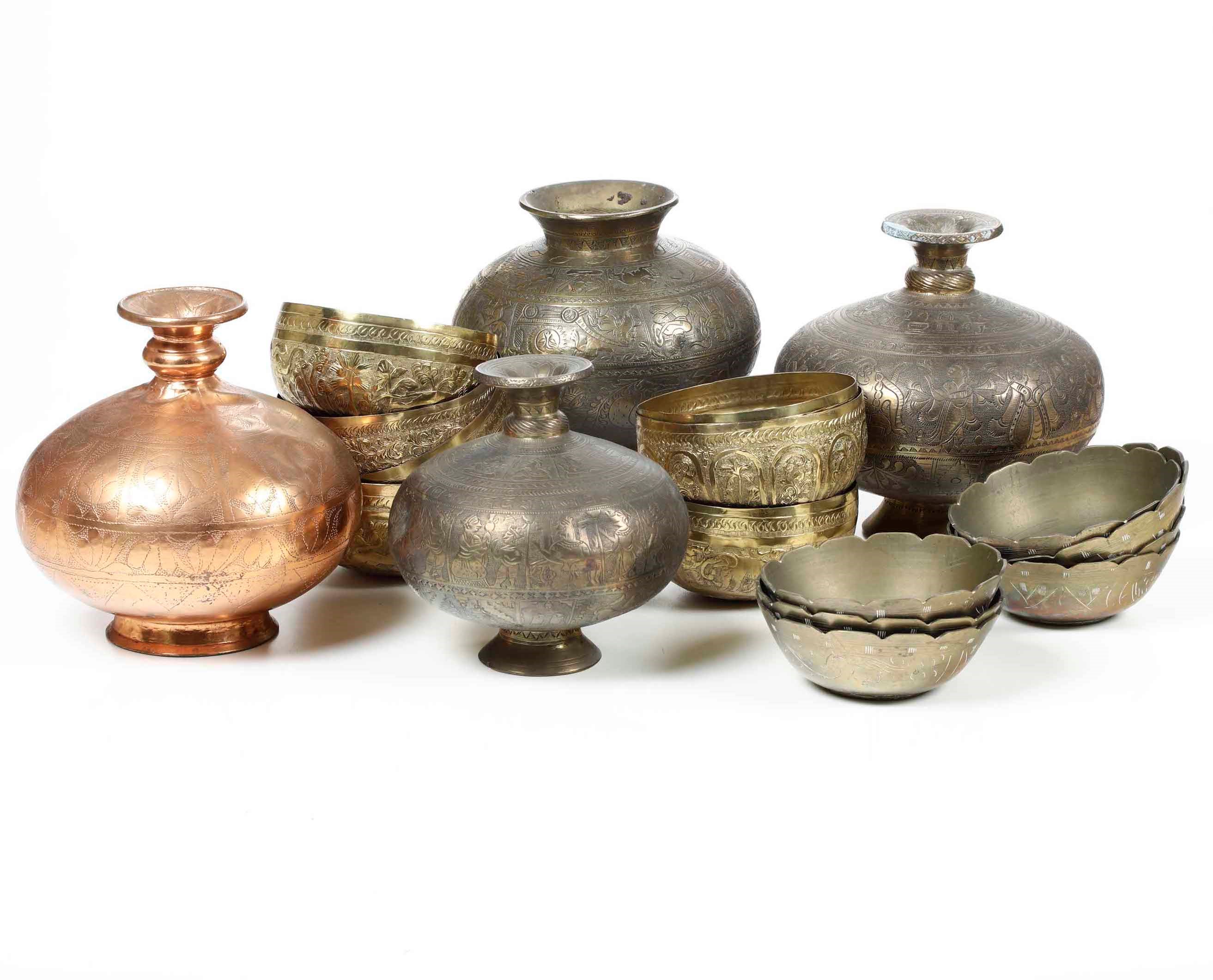 Lotto composto da vasi e ciotole in rame e metallo sbalzati e cesellati, Siria, XIX secolo