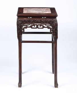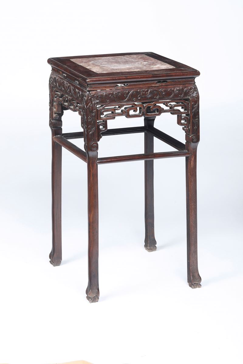 Stand in legno intagliato a decoro geometrico con piano in marmo, Cina, Dinastia Qing, XIX secolo