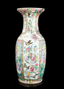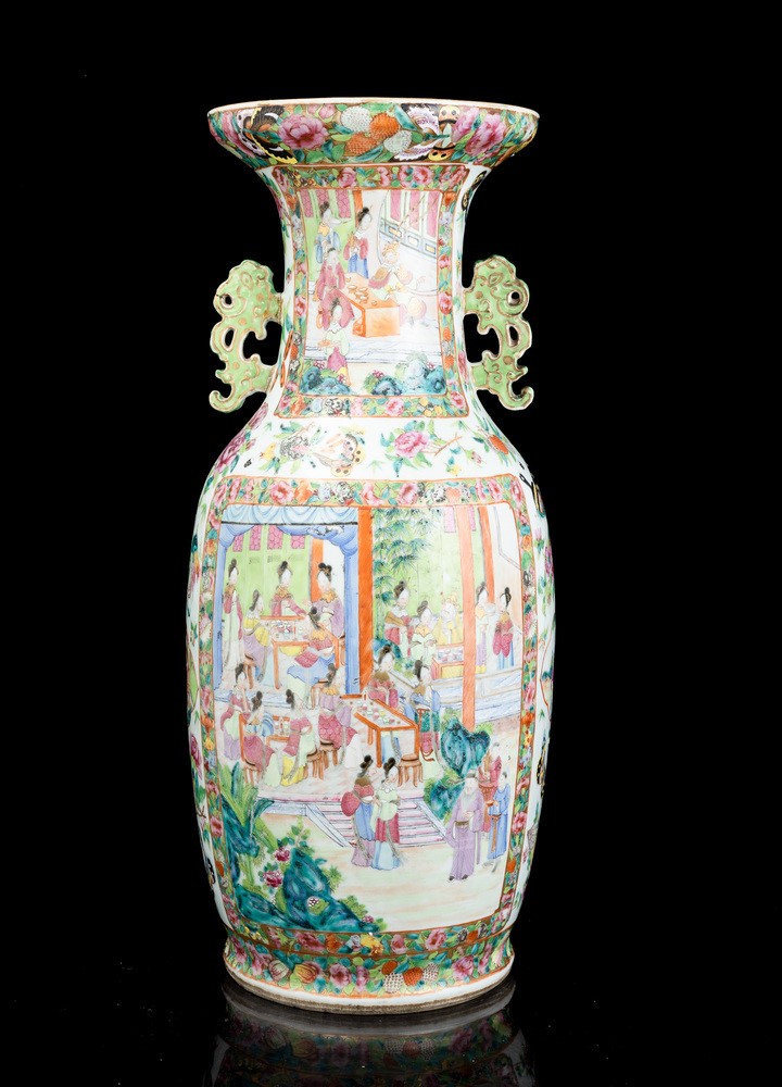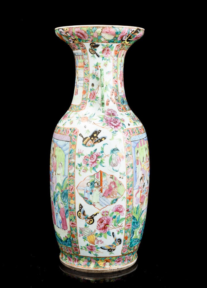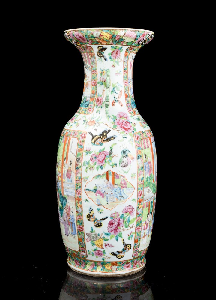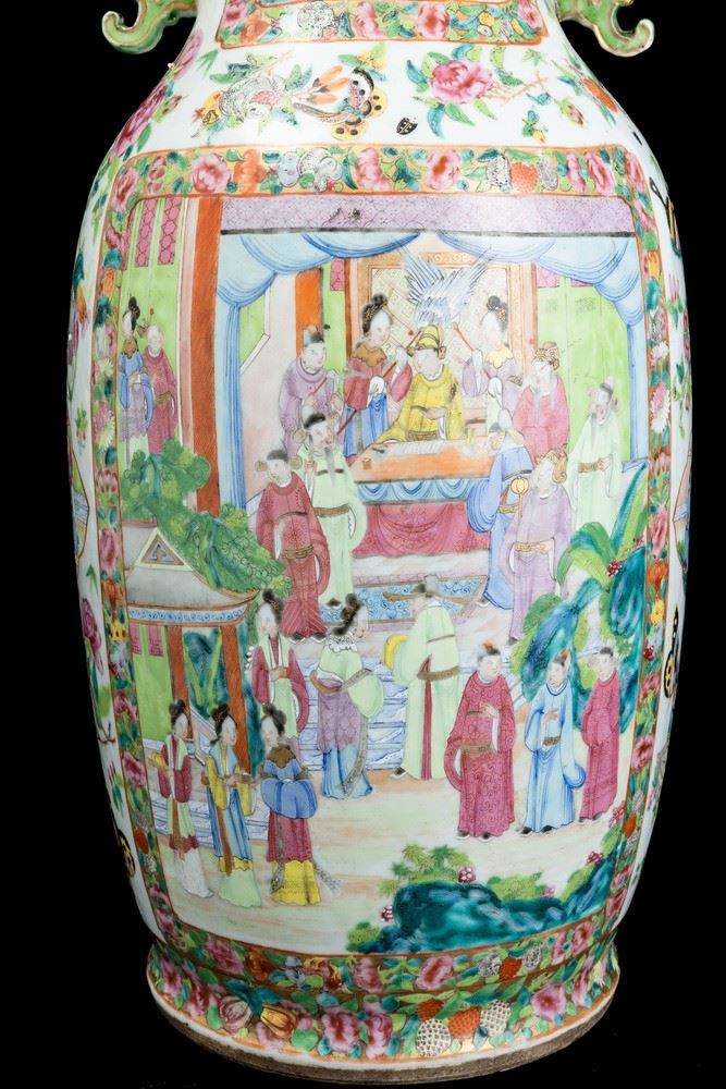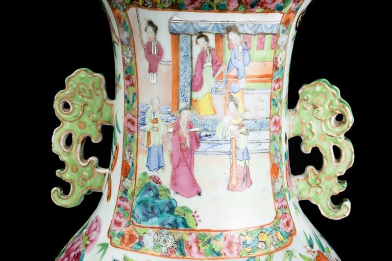 Vaso in porcellana Famiglia Rosa raffigurante scene di vita comune entro riserve, decori floreali e anse sagomate, Cina, [..]