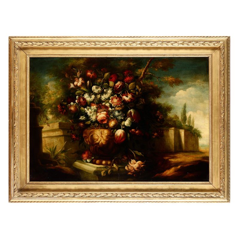 Scuola del XVIII secolo Natura morta con vaso di fiori entro paesaggio