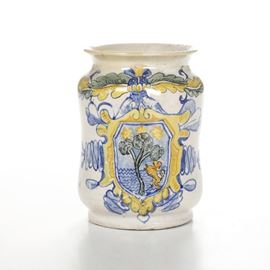 L’albarello cilindrico, leggermente rastremato al centro con ampia bocca estroflessa, ospita un grande stemma araldico, dominato dall’elmo piumato, che incornicia un albero sormontato da tre stelle e un leone rampante