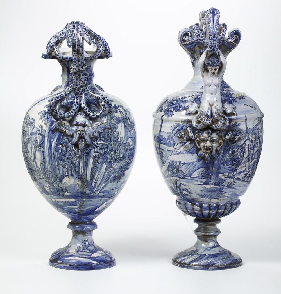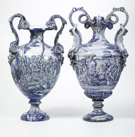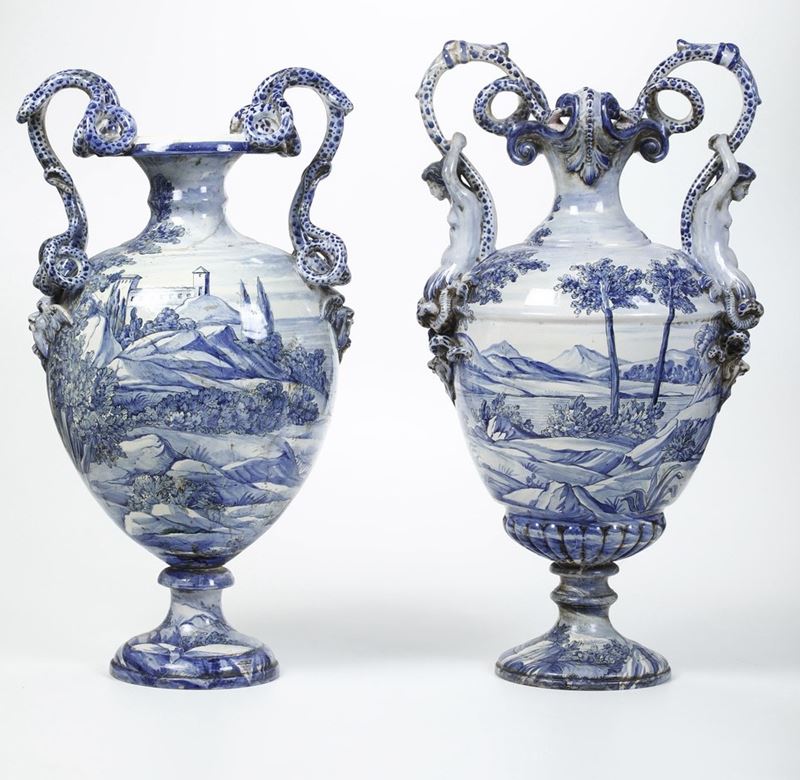 Maiolica. Marca: assente. Altezza cm 75 circa. Conservazione: un vaso con restauri ai serpenti di un manico e alle braccia di un telamone; l'altro rotto in diversi frammenti e ricomposto.